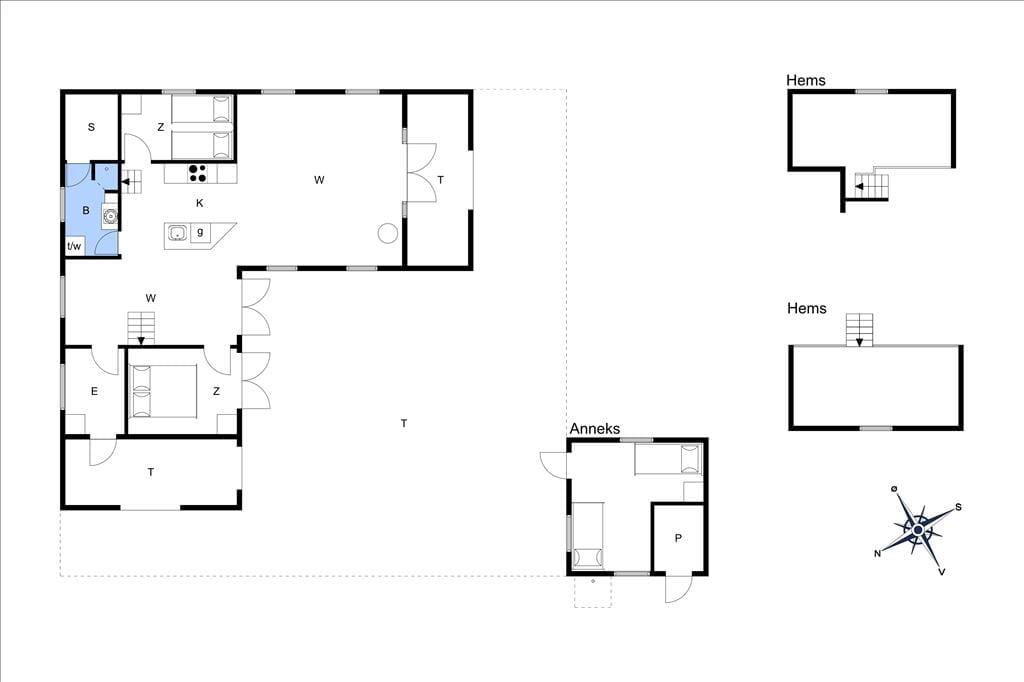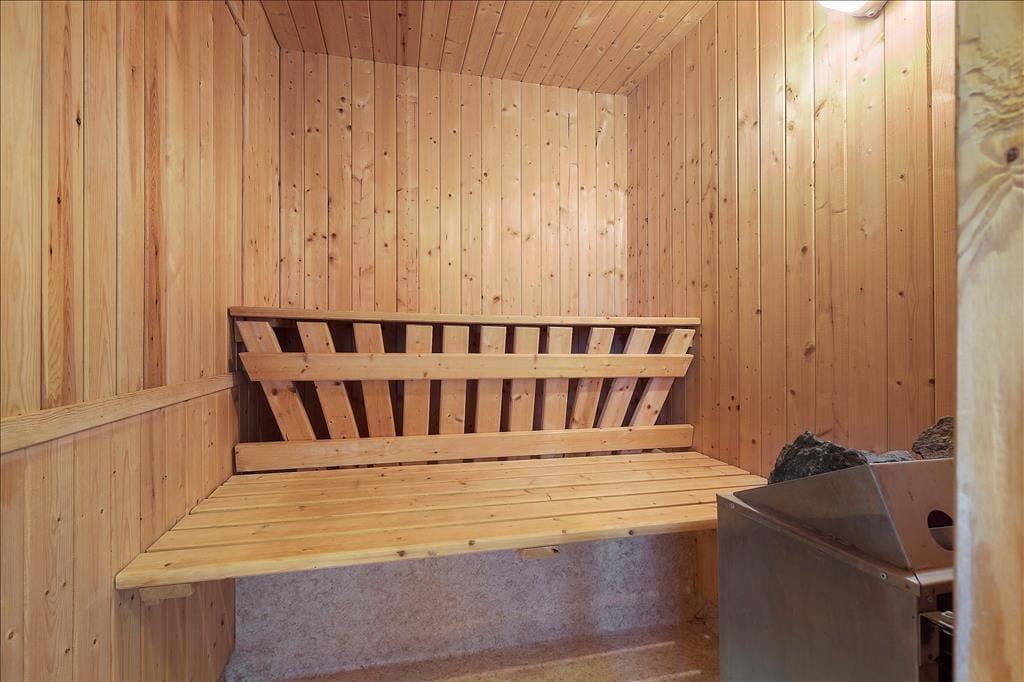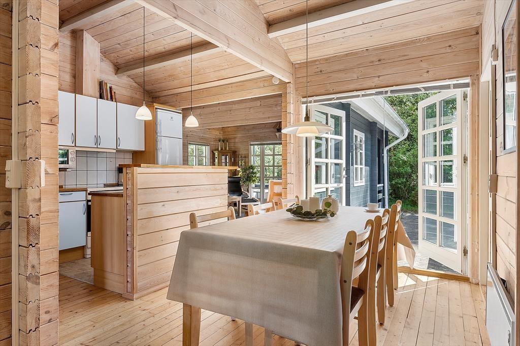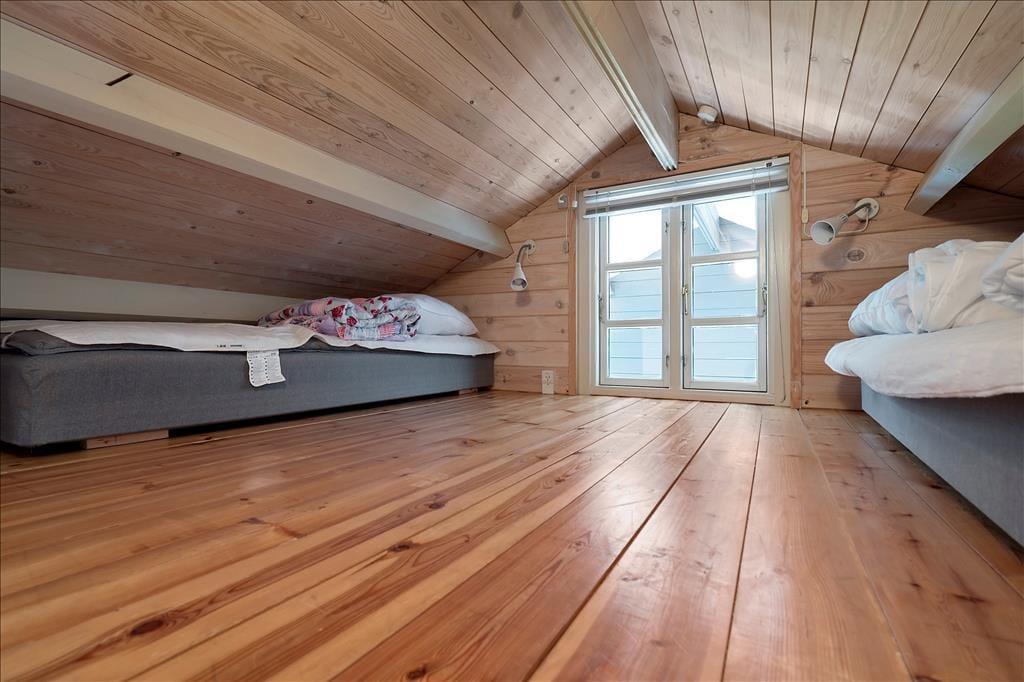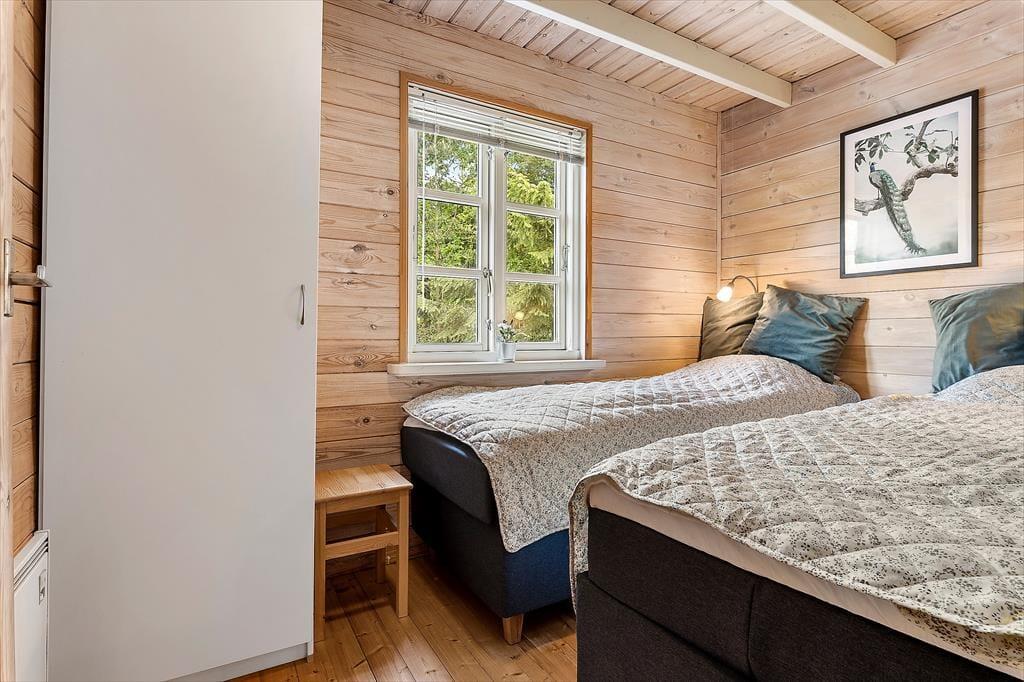 Med loft til kip, lys træbeklædning og brændeovn er sommerhusets opholdsrum sådan et, du straks kan føle dig hjemme i. Der er en komfortabel sofa og lænestole, når det er tid til at flade ud med bøger eller en god film på fladskærmen, og ved spisebordet nær det åbne køkken, kan du samles med dine kære til lækre måltider, brætspil og gode grin. Saunaen, der ligger i forlængelse af badeværelset, er perfekt, når du trænger til at slappe helt af i kroppen og lade feriefreden indfinde sig. Når det er sengetid, er der to soveværelser til rådighed, og derudover kan de to hemse og annekset også bruges til overnatning. Bemærk dog, at sovepladserne på hemsene egner sig bedst til børn og unge.