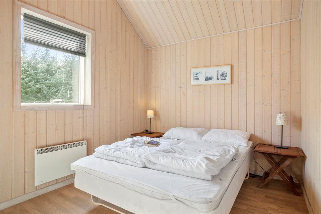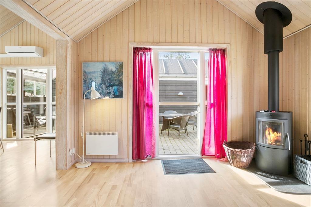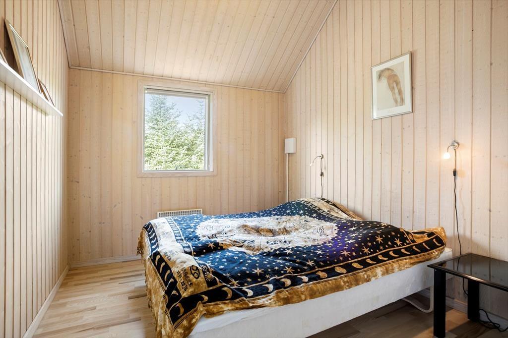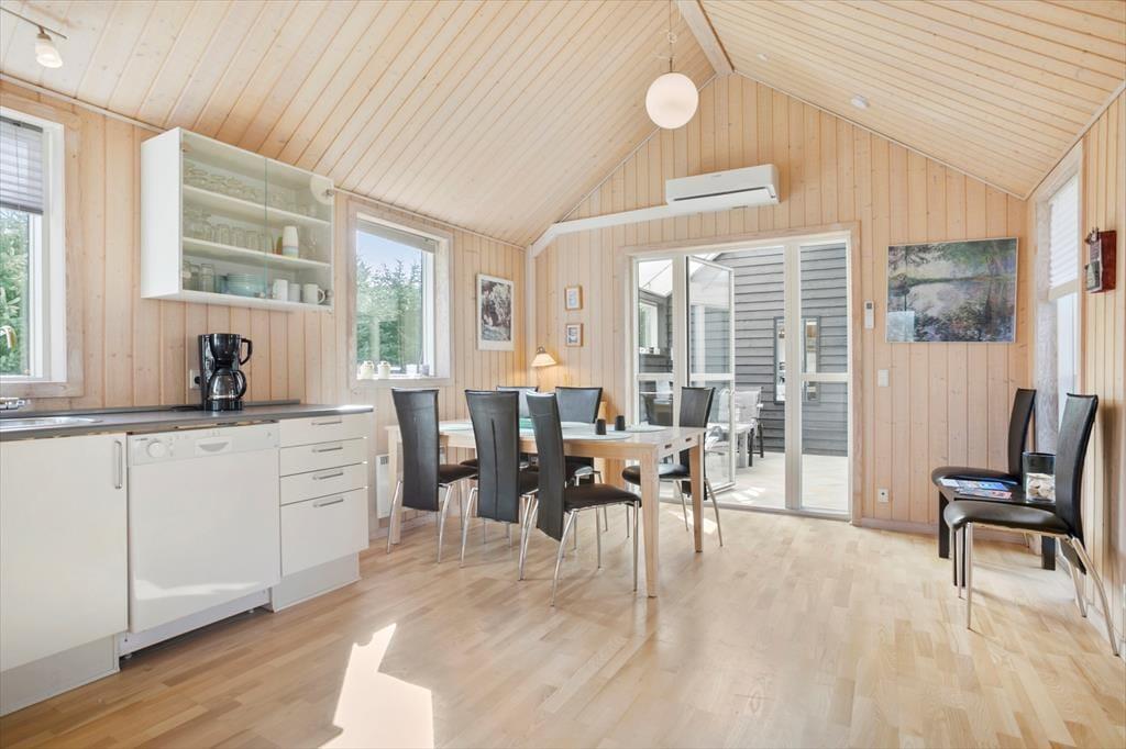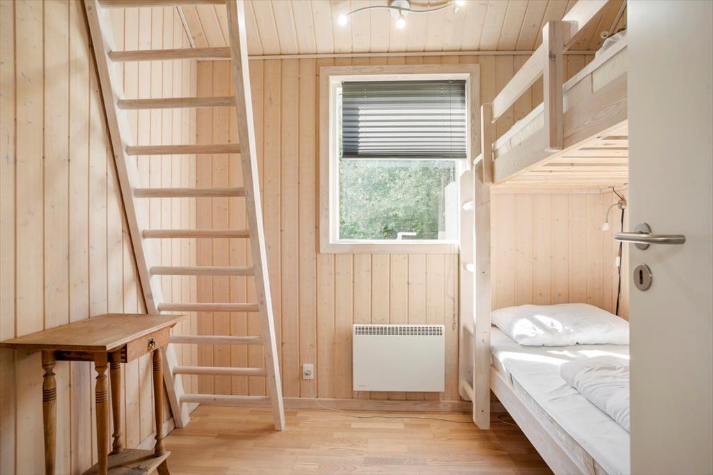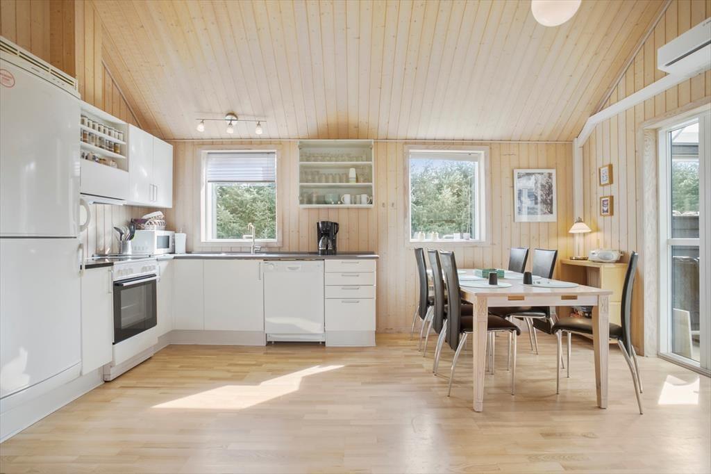 Inden døre i sommerhuset får I hele 123 m2 at brede jer på, så I kan uden problemer samles op til seks personer. De tre soveværelser og to badeværelser er ovenikøbet fordelt i begge ender af huset, og det er rart, hvis I vil have en fredelig afdeling, hvor bedsteforældrene eller måske familiens teenager kan have det lidt for sig selv. Fra værelset med køjeseng fører en stige op til en hemsen, hvor der også er mulighed for at overnatte, og det ene badeværelse er for øvrigt udstyret med vaskesøjle. Det andet badeværelse, der også er det største, byder på spabad og sauna, så hvis I trænger til at slappe af, kan I forkæle jer selv med lidt wellness. Centralt i huset ligger et rummeligt spisekøkken i åben forbindelse med en hyggelig stue med brændeovn, og fra køkkenet har I derudover direkte adgang til en havestue, der har vinduer vendt mod både øst og vest.
