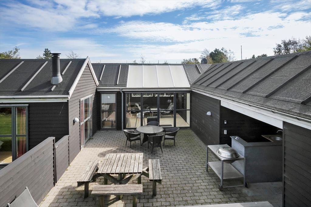Takket være de store glasdøre er havestuen godt integreret med terrassen, så det indendørs og udendørs opholdsmiljø nærmest er smeltet sammen. Terrassen er afskærmet af hegn og husets fløje, så det føles nærmest som at sidde i en ugeneret solgård. Udekøkkenet gør det nemt at lave mad ude i det fri, og hvis I får lyst til at spille frisbee og havespil, har I god plads til at boltre jer på græsplænen. Har I små børn med, kan de gynge og hygge sig i sandkassen i baghaven, der grænser lige op til et træklædt areal.