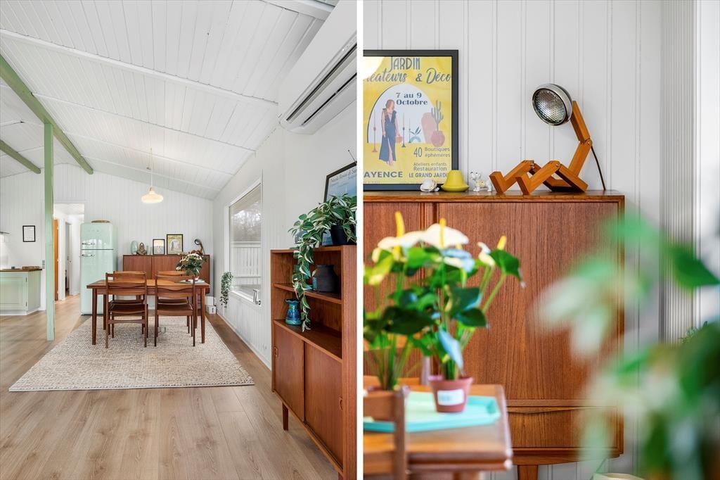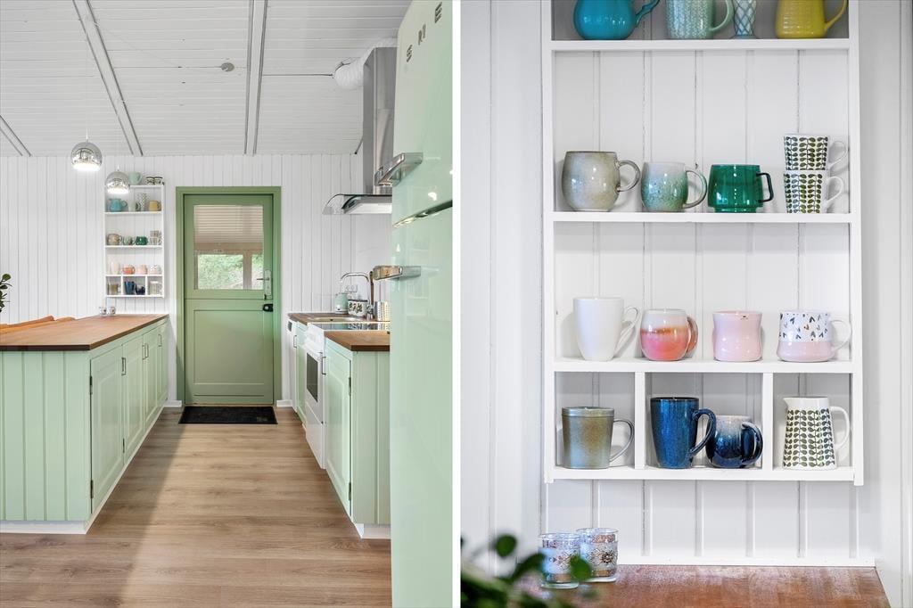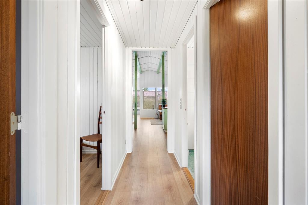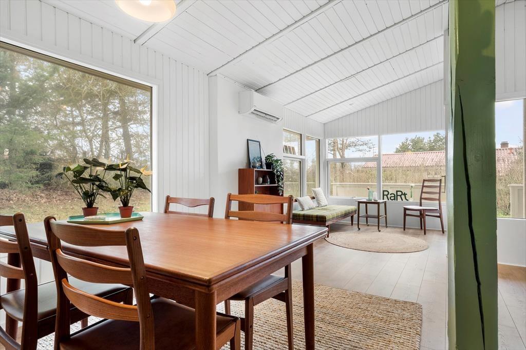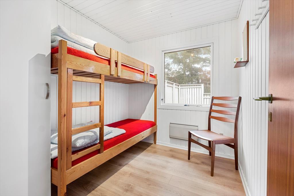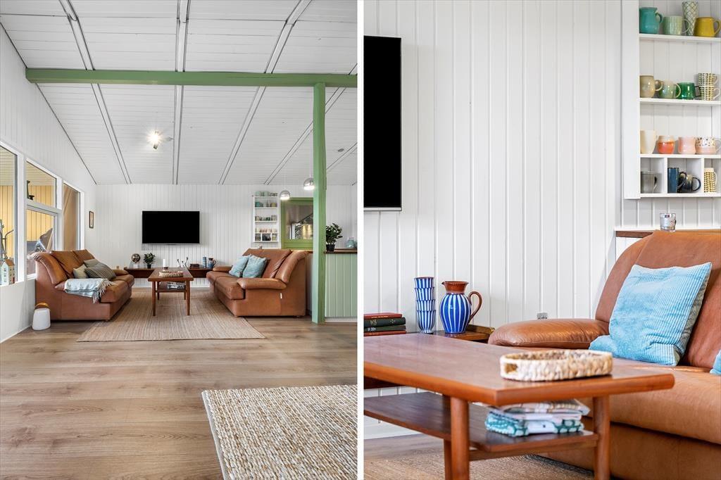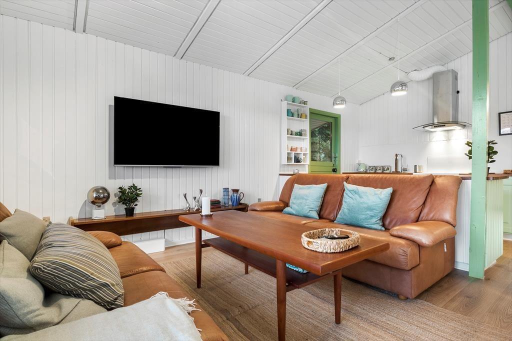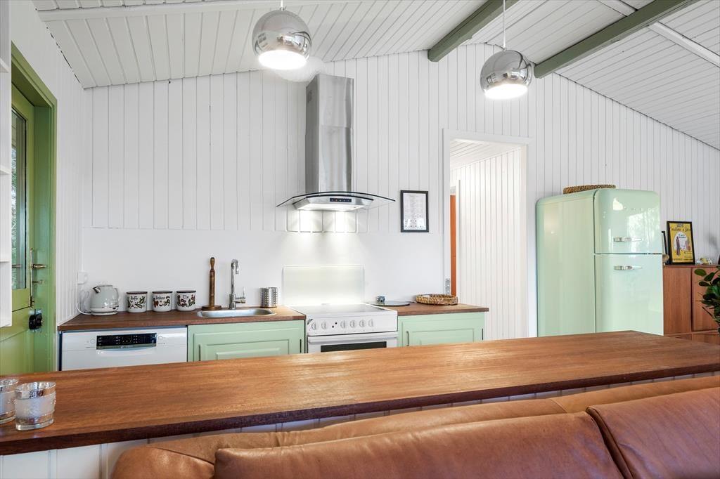 Sommerhuset er renoveret i 2023 på vellykket vis: Den effektive varmepumpe, fladskærms-tv’et med Chromecast og badeværelsets rainshower hører til de moderne detaljer i huset, mens retromøblerne giver sjæl og charme til de lyse og indbydende rum. I stuen kan I tage en læsepause på briksen, spille brætspil ved spisebordet eller slappe af i sofaen med strikketøjet, og hvis I kan lide at lave mad, har I gode arbejdsforhold i det åbne køkken. Soveværelser er der tre af, hvoraf det ene er med dobbeltseng, det andet med køjeseng og det tredje med en sovesofa, så det er muligt at være fem voksne og et barn i huset.