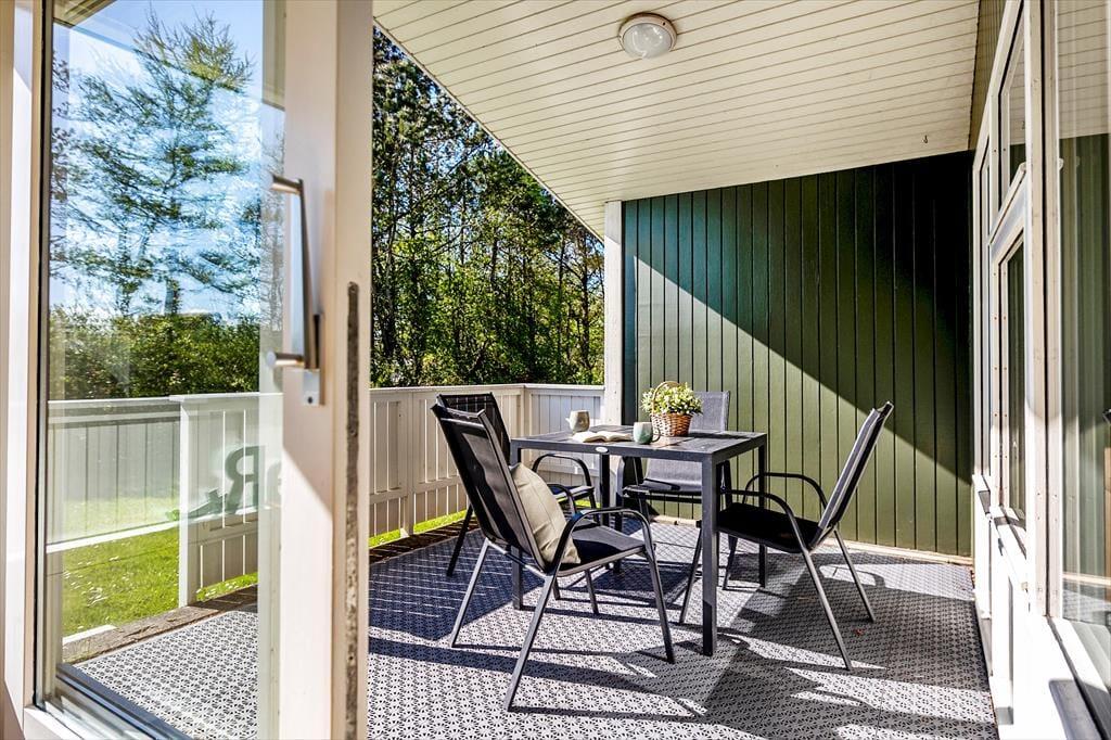 Fra stuen har I direkte adgang til en delvist overdækket terrasse, hvor I kan hygge jer under halvtaget, når solen er ved at gå ned, og duggen falder. I løbet af dagen foretrækker I måske en opholdsplads under åben himmel, og der er også god plads til at lege eller slænge sig på græsset på den 1202 m2 store grund.