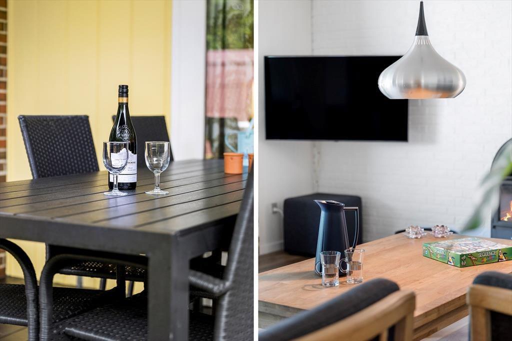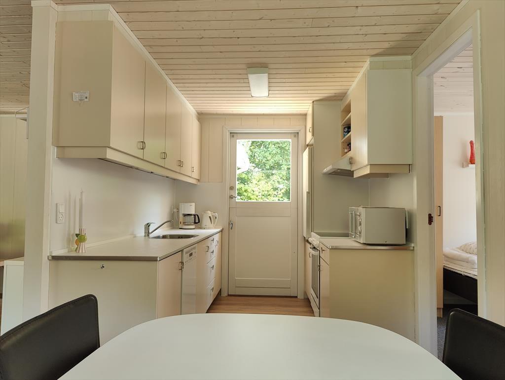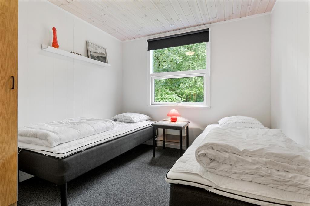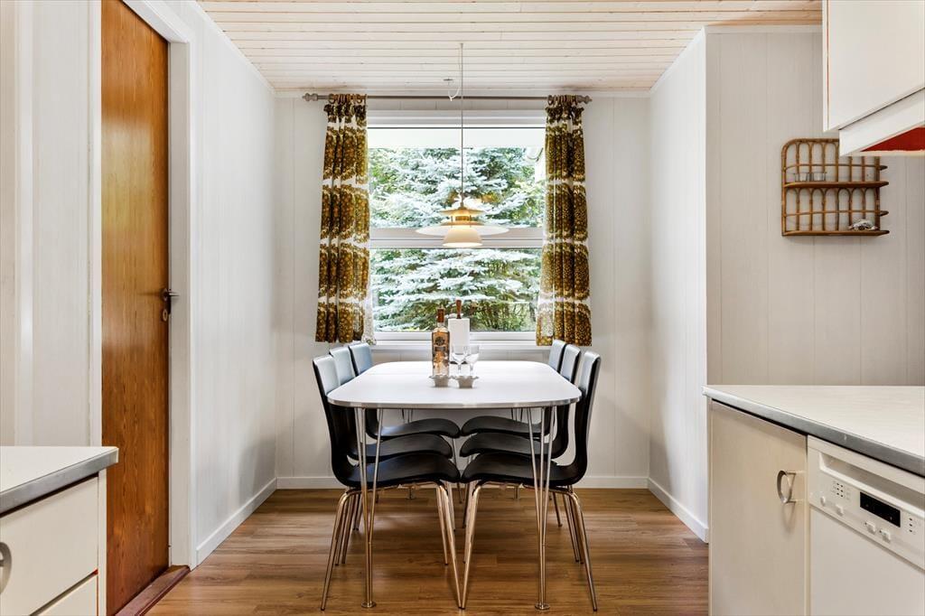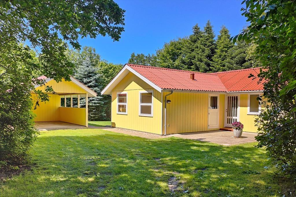 Det er ganske sikkert, at dit humør vil stige, og feriefreden vil indfinde sig, så snart du ankommer til sommerhuset og ser den solgule facade under det røde tag. Atmosfæren er også god inden døre, hvor rummene balancerer fint mellem en skøn retro-charme og et mere moderne udtryk – for eksempel er der 1970’er-gardiner og mønstrede fliser i køkkenet, men også opvaskemaskine og andre bekvemmeligheder. Fra stuen har du direkte adgang til stuen, hvor du har kig til brændeovnen og det store vestvendte vinduesparti fra sofaafdelingen. Brusebadeværelset ligger ganske praktisk lige ved entréen, og på de tre soveværelser er der sengepladser til seks personer.