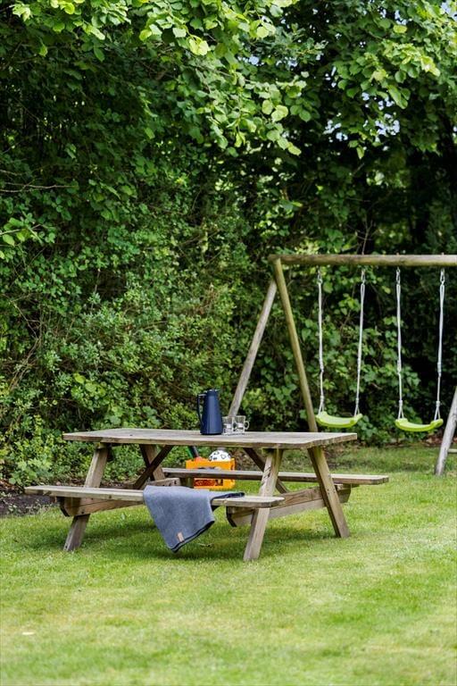 Driverlivet kan passende foregå ude i det fri, når vejret er lunt og lækkert, og I ikke har andet end afslapning på programmet. Der er flere dejlige terrasseområder at vælge imellem rundt om sommerhuset – inklusiv en delvist overdækket terrasse mod vest, som helt oplagt kan være det sted, hvor familien samles for at grille, når dagen nærmer sig sin afslutning. Smukke træer og småkrat skærmer grunden godt af, og på græsplænen har I god plads til at spille bold og kaste med frisbee, mens de alleryngste også kan få stor glæde af sandkassen og legestativet med gynger.