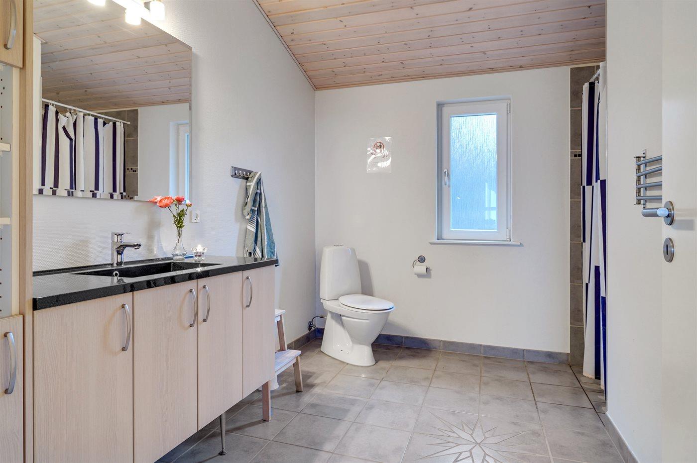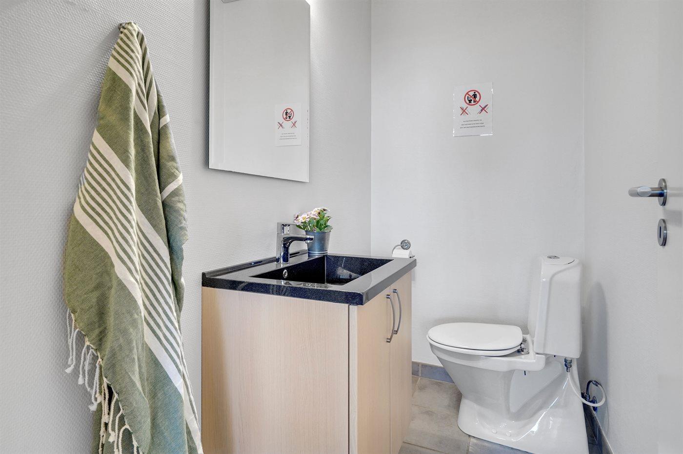 Der er 1 badeværelse med bruseniche og 2 toiletter, heraf 1 gæstetoilet.