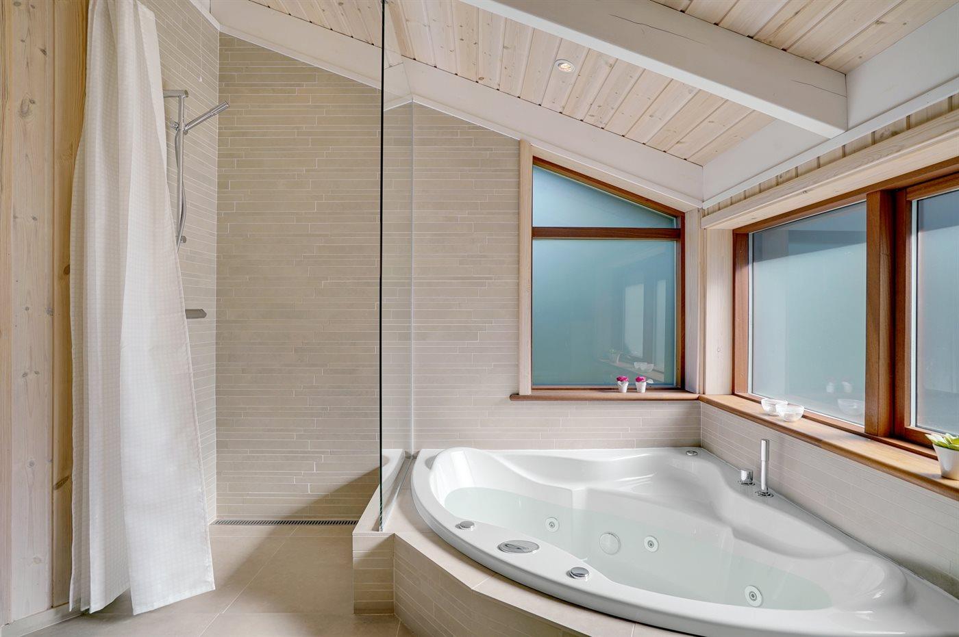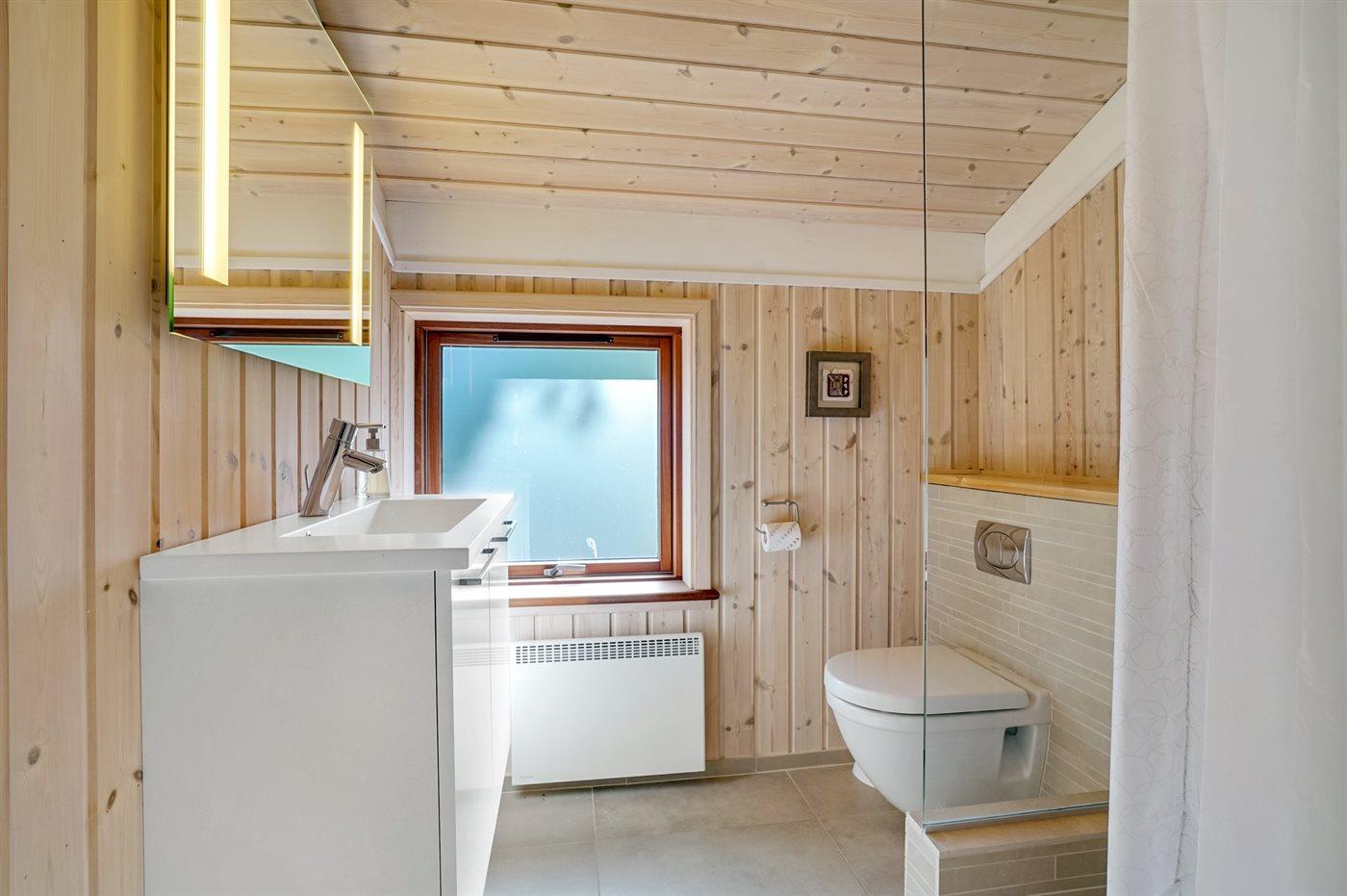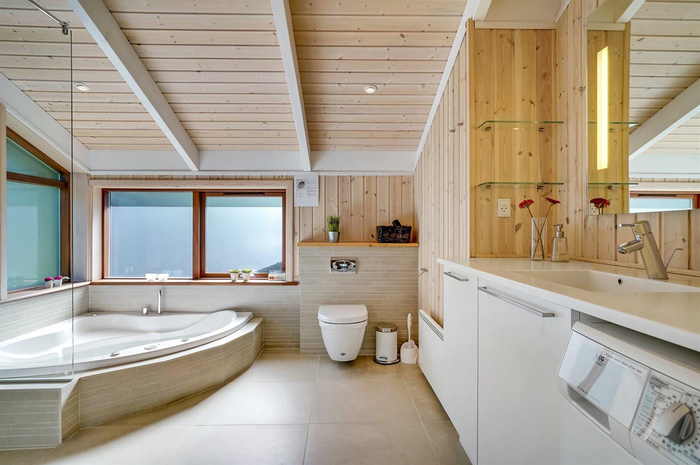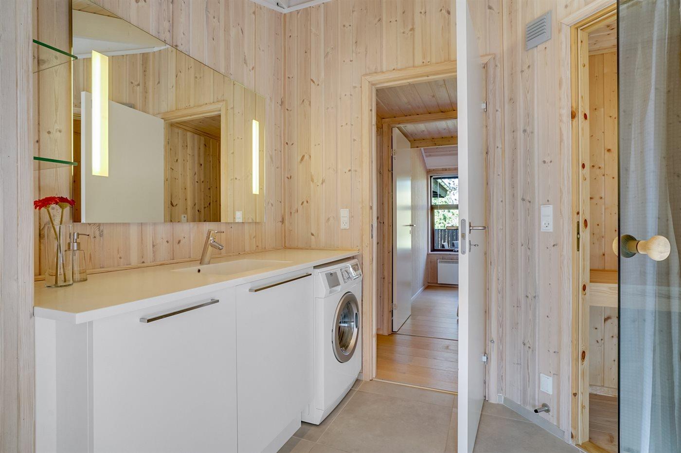 Der er 2 badeværelser med bruseniche og 2 toiletter. Der er gulvvarme på 2 badeværelser. I saunaen er der mulighed for afslapning.