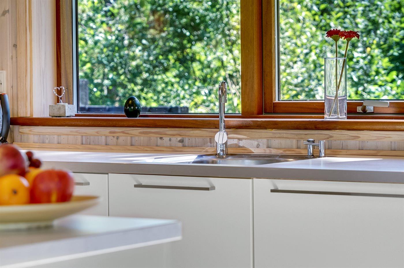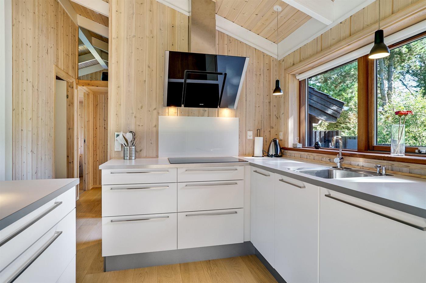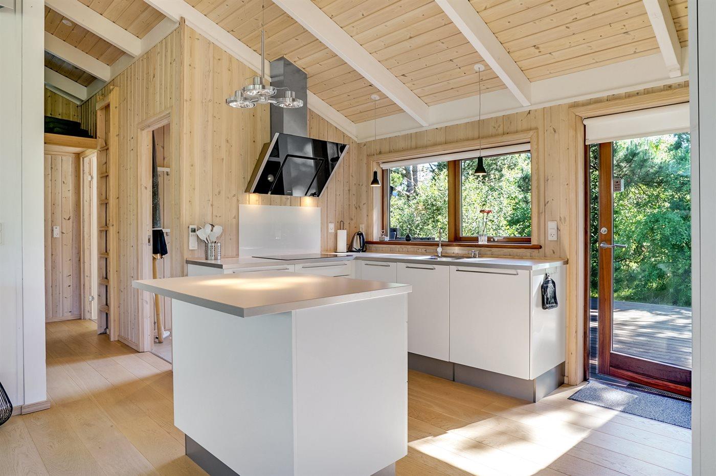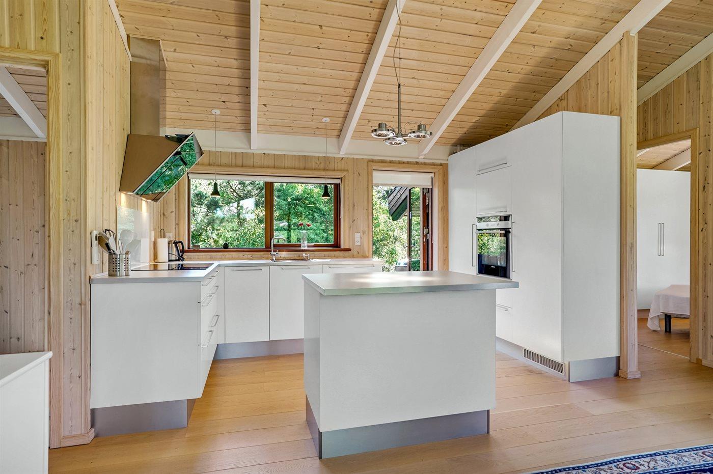Køkkenet er udstyret med 1 køleskab. Der er 4 keramiske kogeplader, varmluftovn, mikrobølgeovn samt opvaskemaskine.