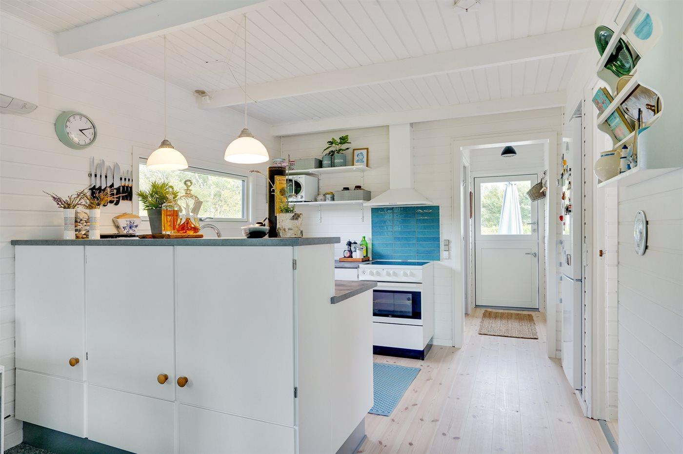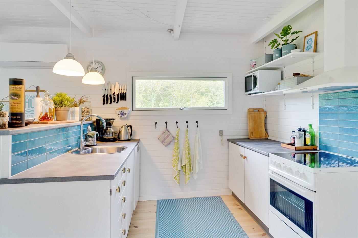 Køkkenet er udstyret med 1 køleskab. Der er 4 keramiske kogeplader, varmluftovn, mikrobølgeovn samt opvaskemaskine.