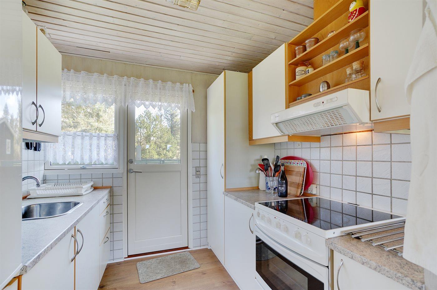 Køkkenet er udstyret med 1 køleskab. Der er 4 keramiske kogeplader, varmluftovn, mikrobølgeovn.