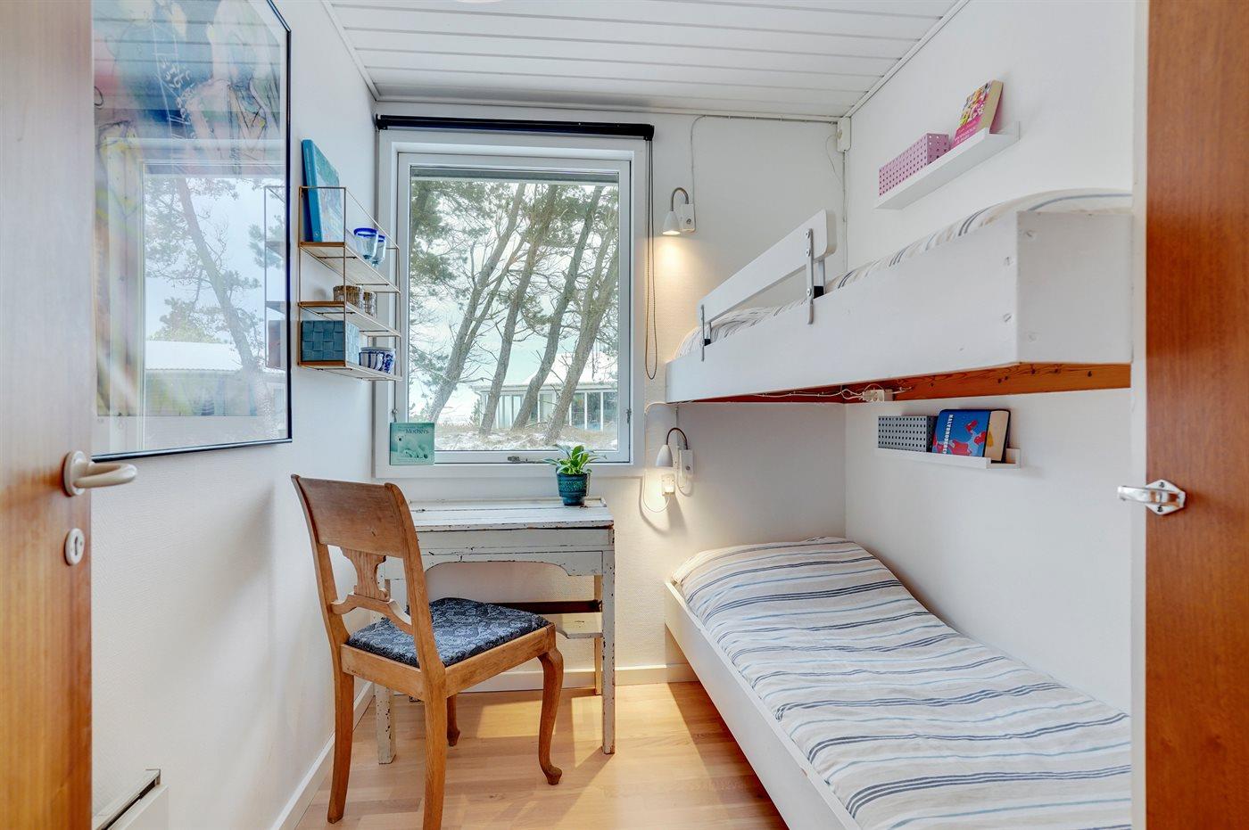 Der er i alt 3 soveværelser. Sovepladserne fordeler sig på: 3 sovepladser i enkeltsenge. 2 sovepladser i køjeseng.