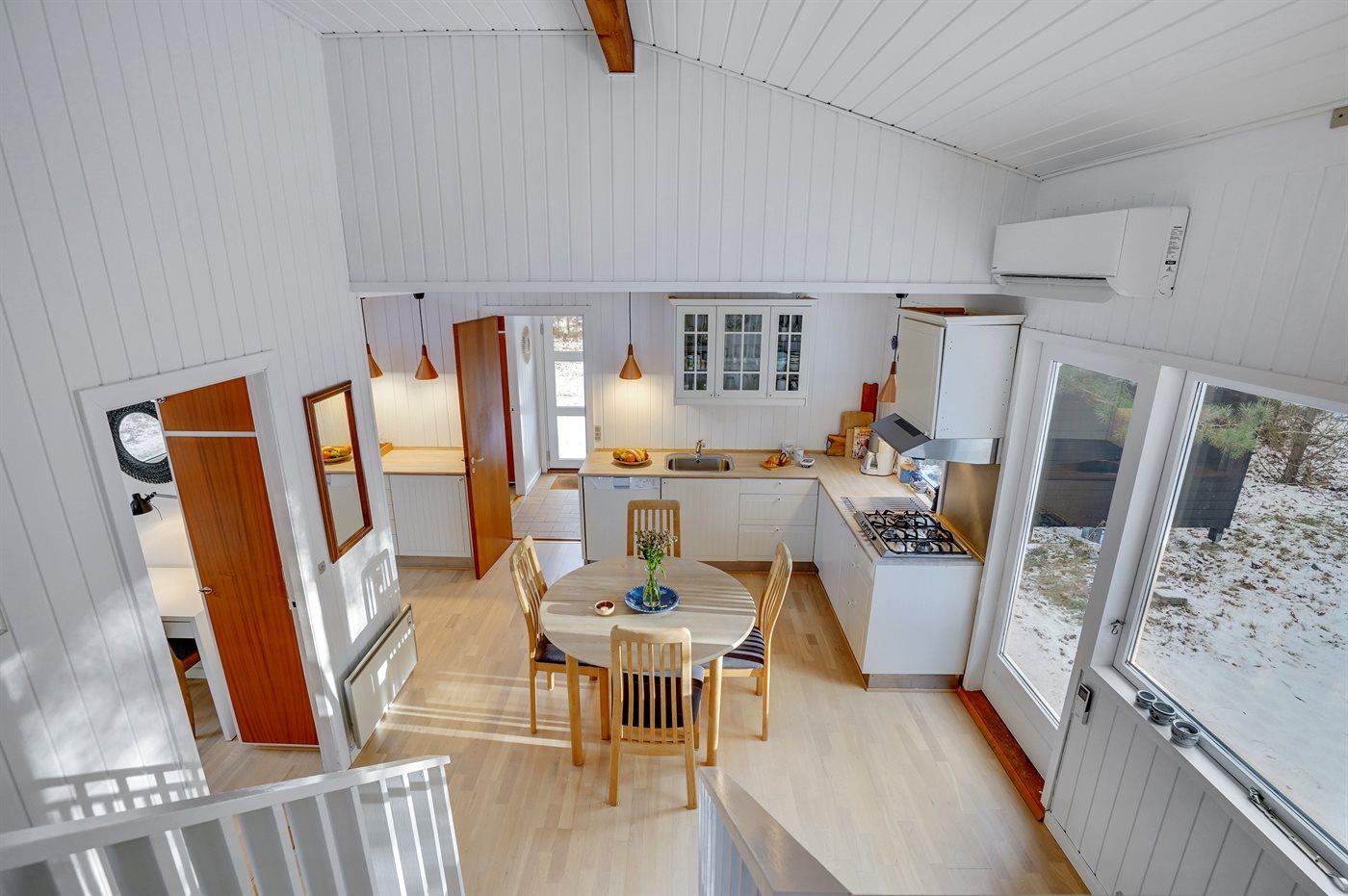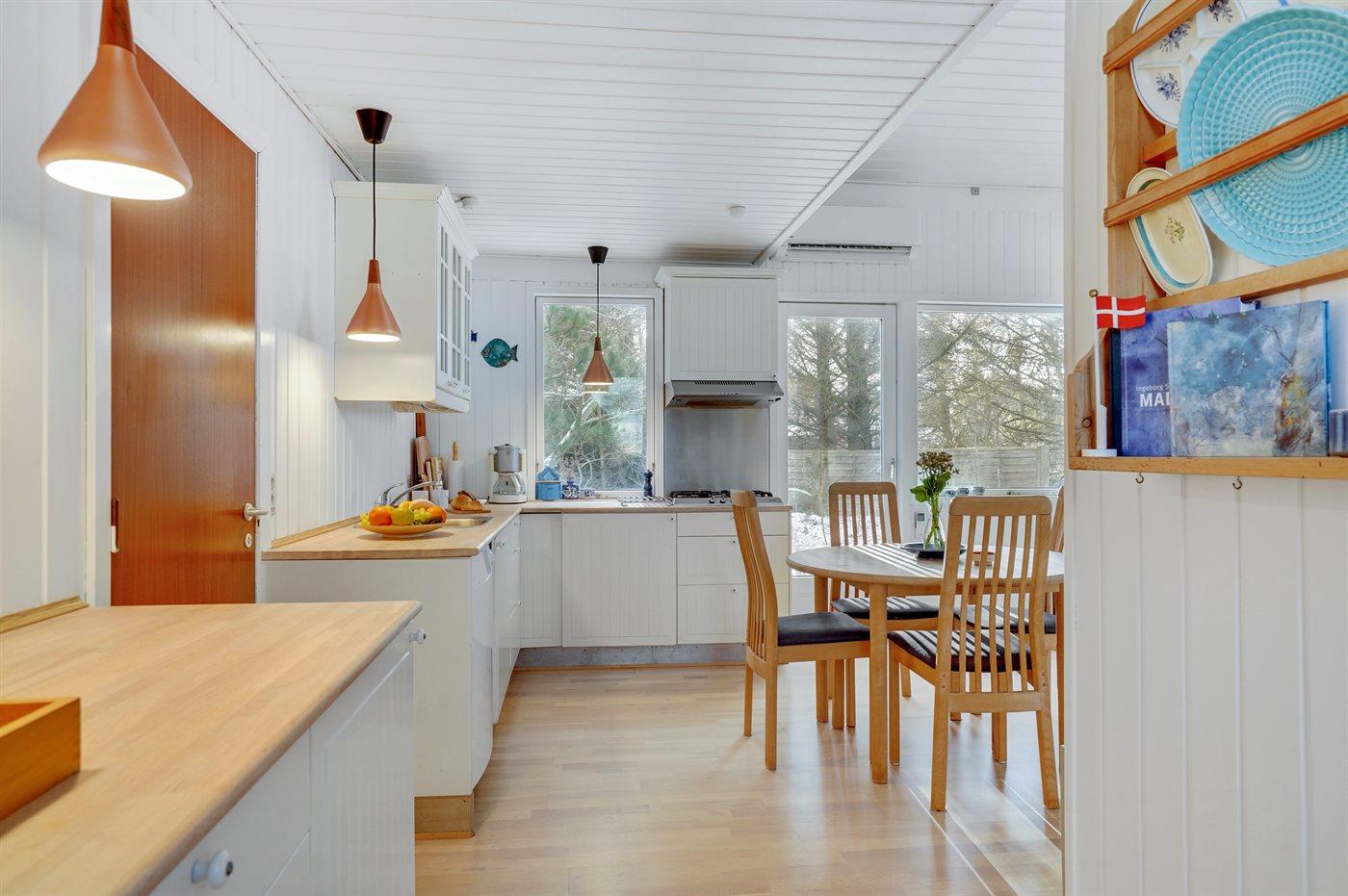 Køkkenet er udstyret med 1 køleskab. Der er 4 gasblus, varmluftovn, mikrobølgeovn samt opvaskemaskine.