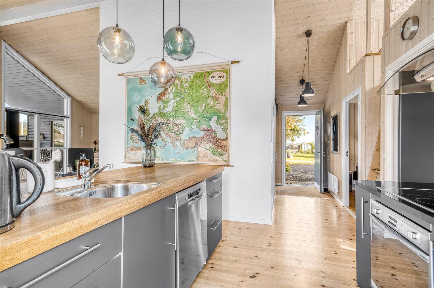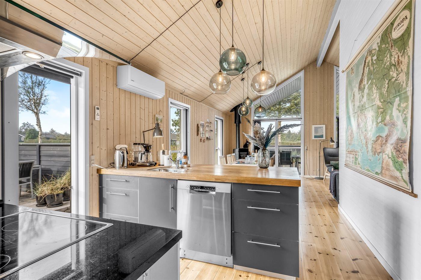 Køkkenet er udstyret med 1 køleskab. Der er 4 keramiske kogeplader, varmluftovn, mikrobølgeovn samt opvaskemaskine.