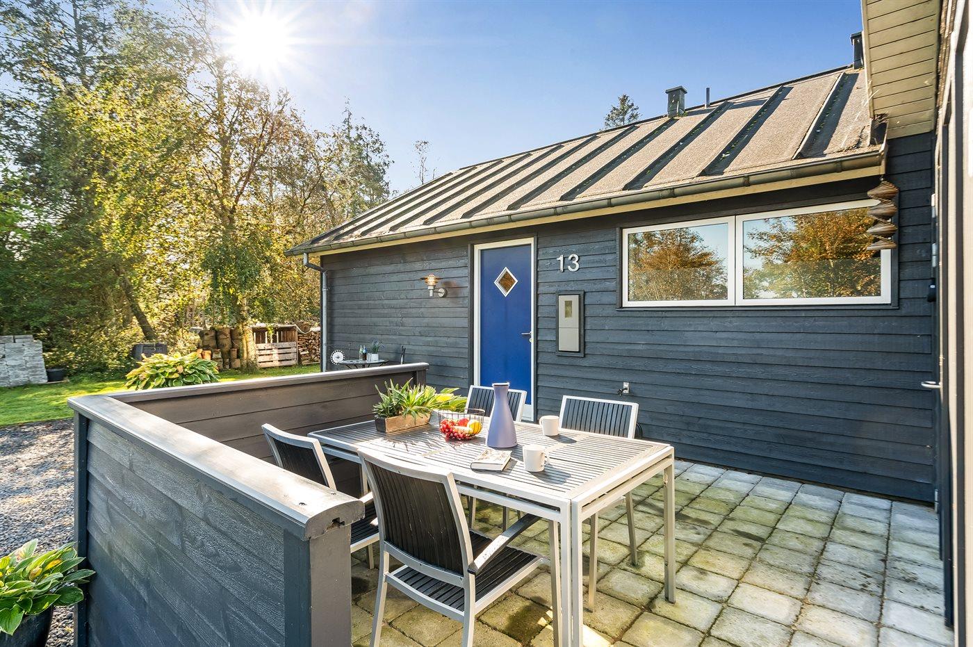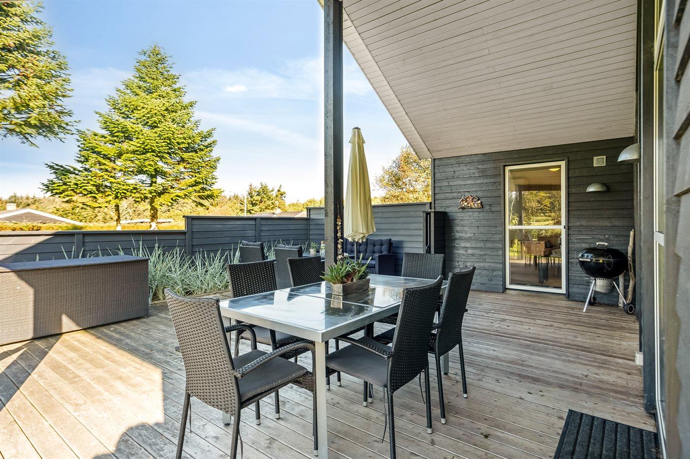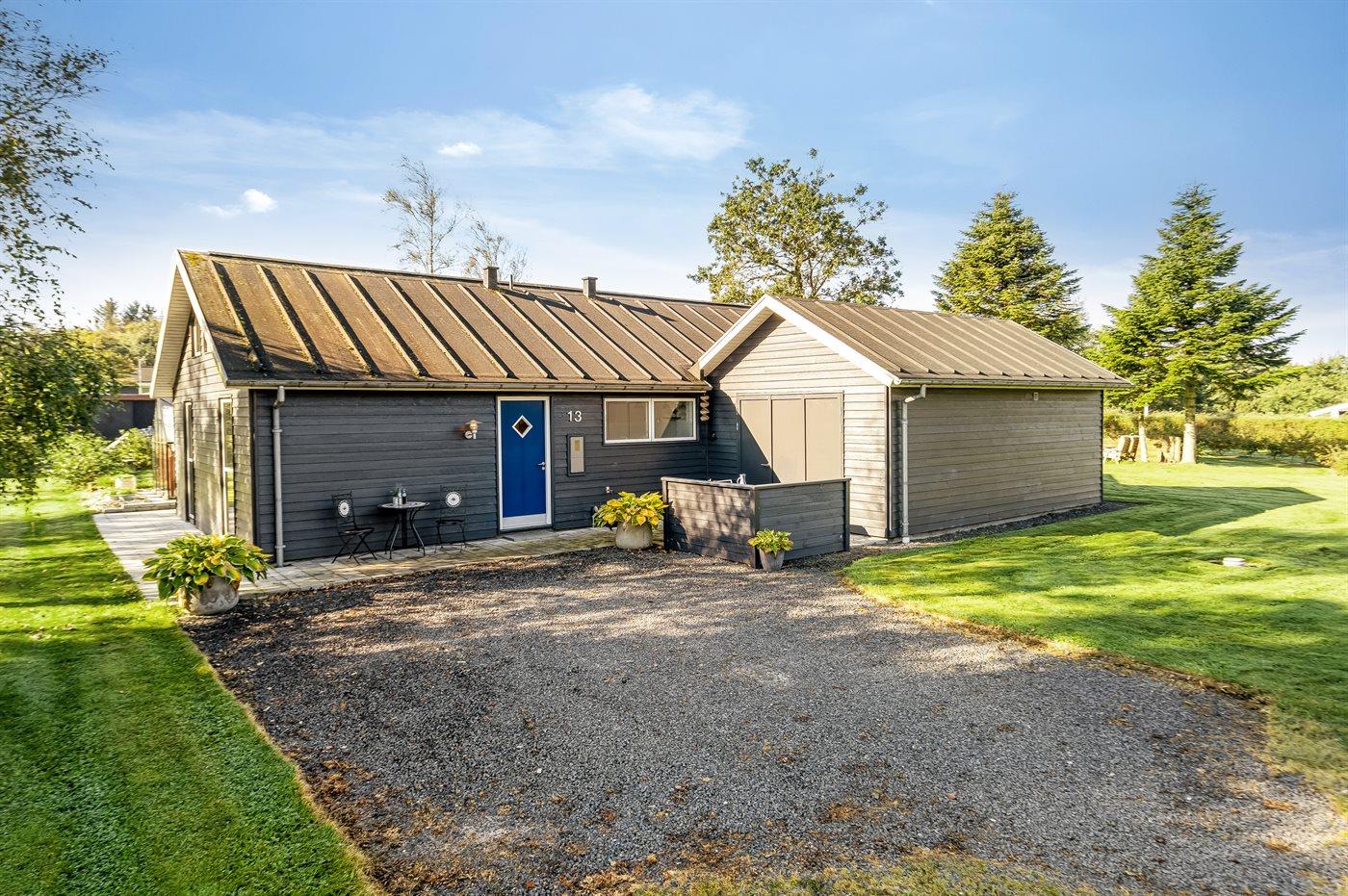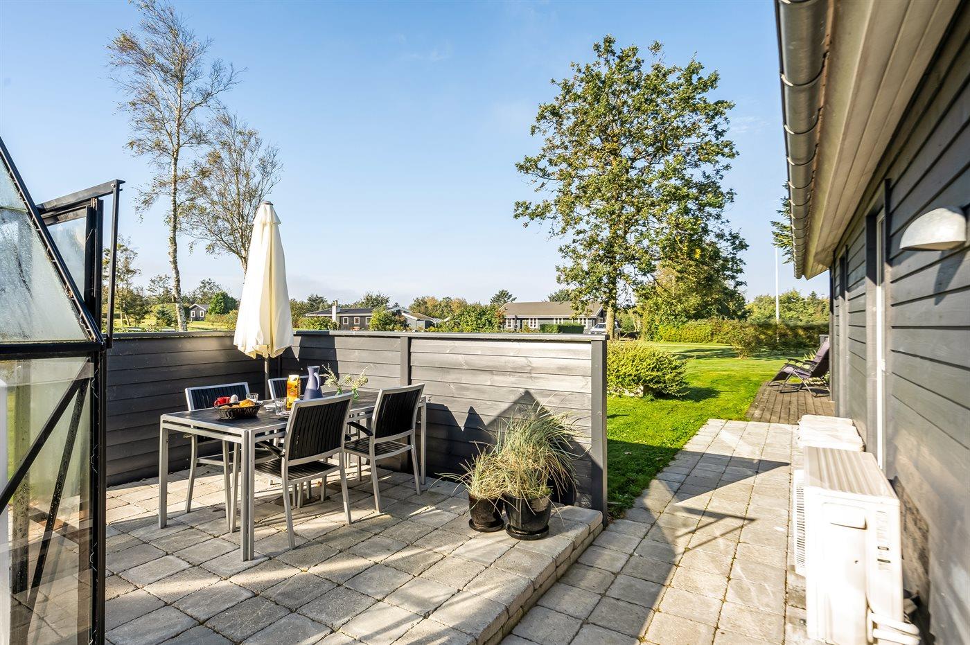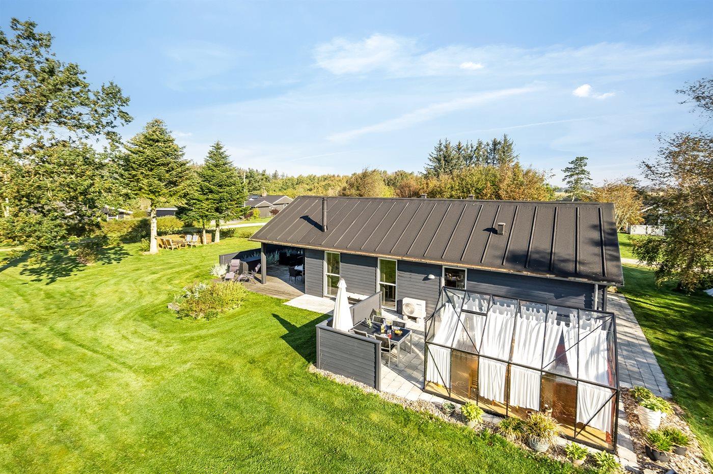 Ferieboligen er beliggende på en 1460 m² stor havegrund. Der er 700 m til fjorden. Nærmeste forretning er beliggende i en afstand af 3000 m. Der er en golfbane i en afstand af 12000 m. Til ferieboligen hører åbent terrasseareal. Desuden er der overdækket terrasse. Der er redskabsrum. Der ligger en legeplads i en afstand af 800 m. Grill til rådighed. Parkering ved ferieboligen.