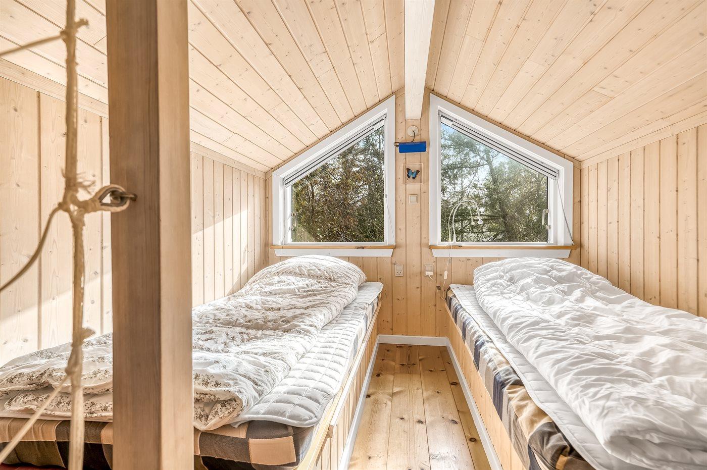 Der er i alt 3 soveværelser. Sovepladserne fordeler sig på: 4 sovepladser i dobbeltsenge. 2 sovepladser i sovesofa (dobbelt). 2 sovepladser på madrasser. 2 af disse sovepladser befinder sig i et anneks og 2 af dem befinder sig på hemsen. Derudover er der 1 stk. barneseng.