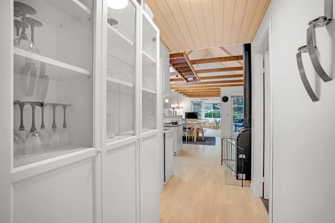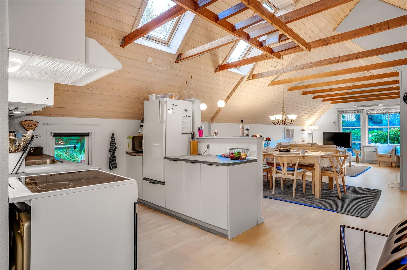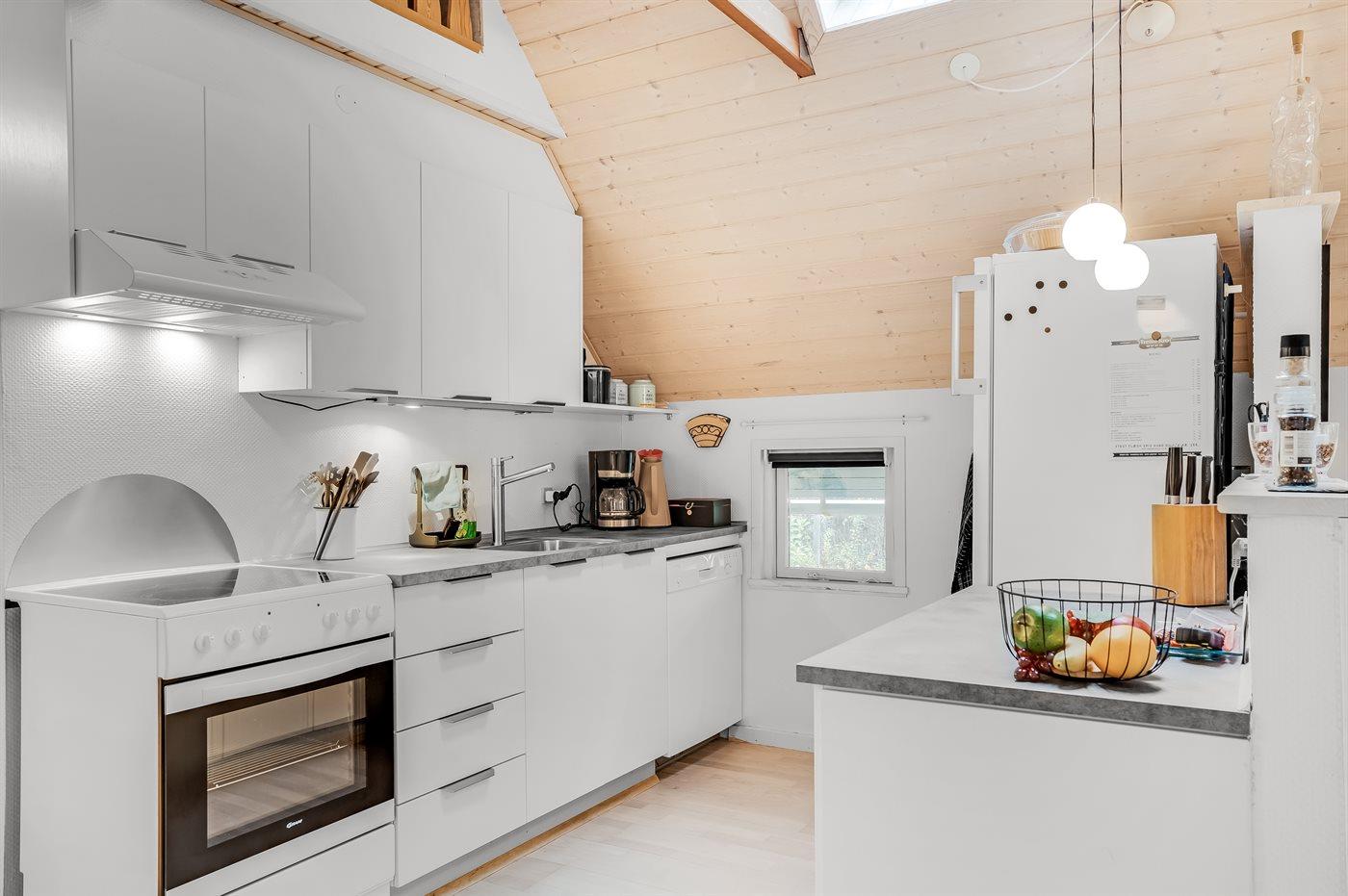 Køkkenet er udstyret med 1 køleskab. Der er 4 keramiske kogeplader, varmluftovn, mikrobølgeovn samt opvaskemaskine.