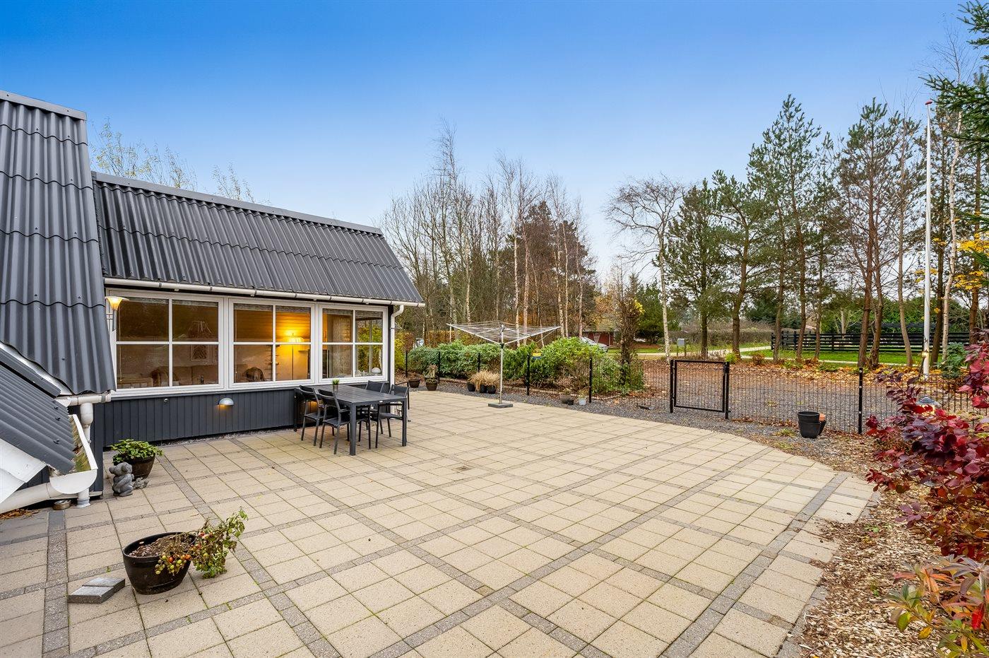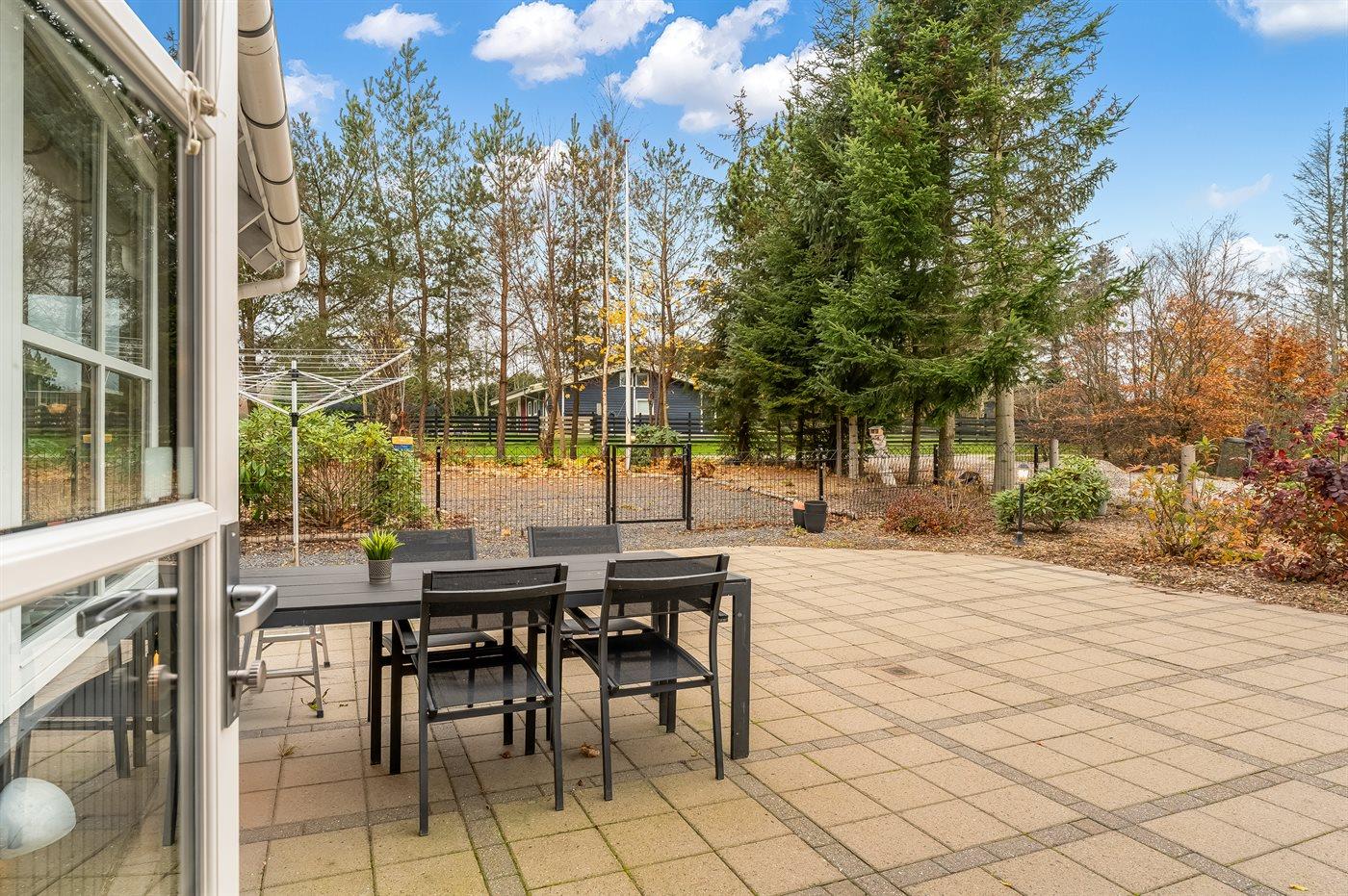 Ferieboligen er beliggende på en 1242 m² stor havegrund. Grunden er indhegnet. Der er 600 m til fjorden. Nærmeste forretning er beliggende i en afstand af 3000 m. Til ferieboligen hører åbent terrasseareal. Der er redskabsrum. Der ligger en legeplads i en afstand af 150 m. Bålsted. Grill til rådighed. Parkering ved ferieboligen.
