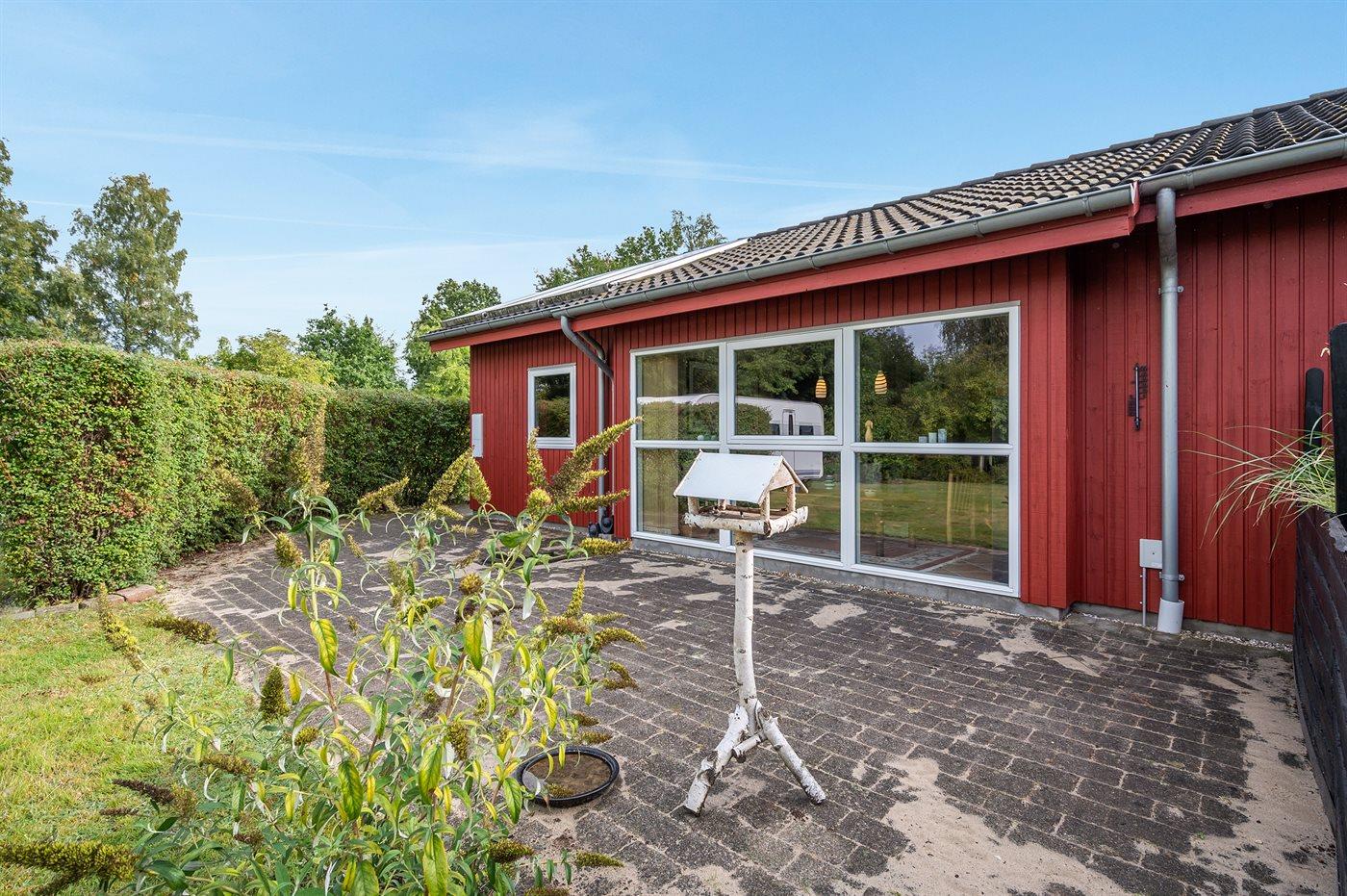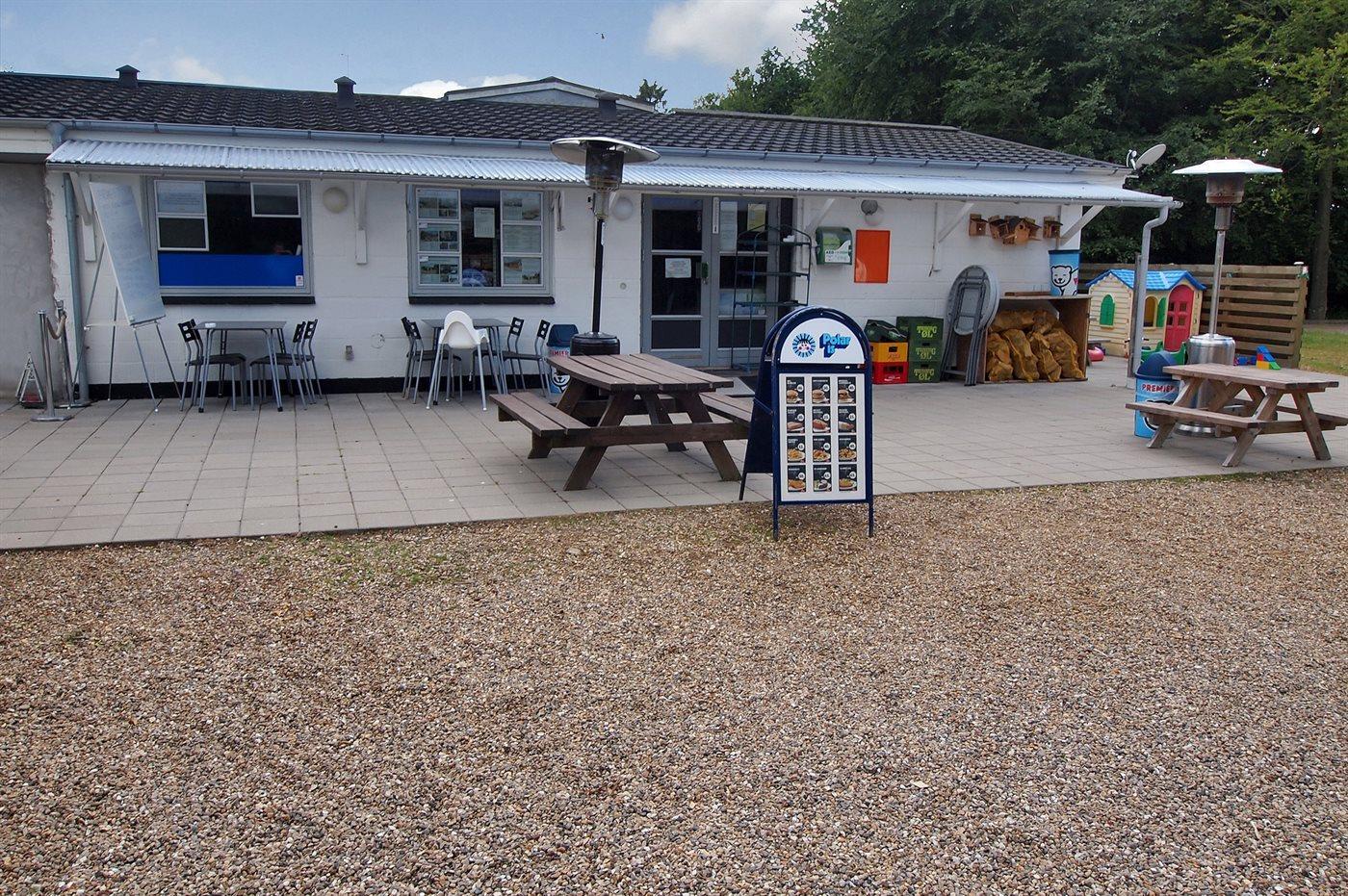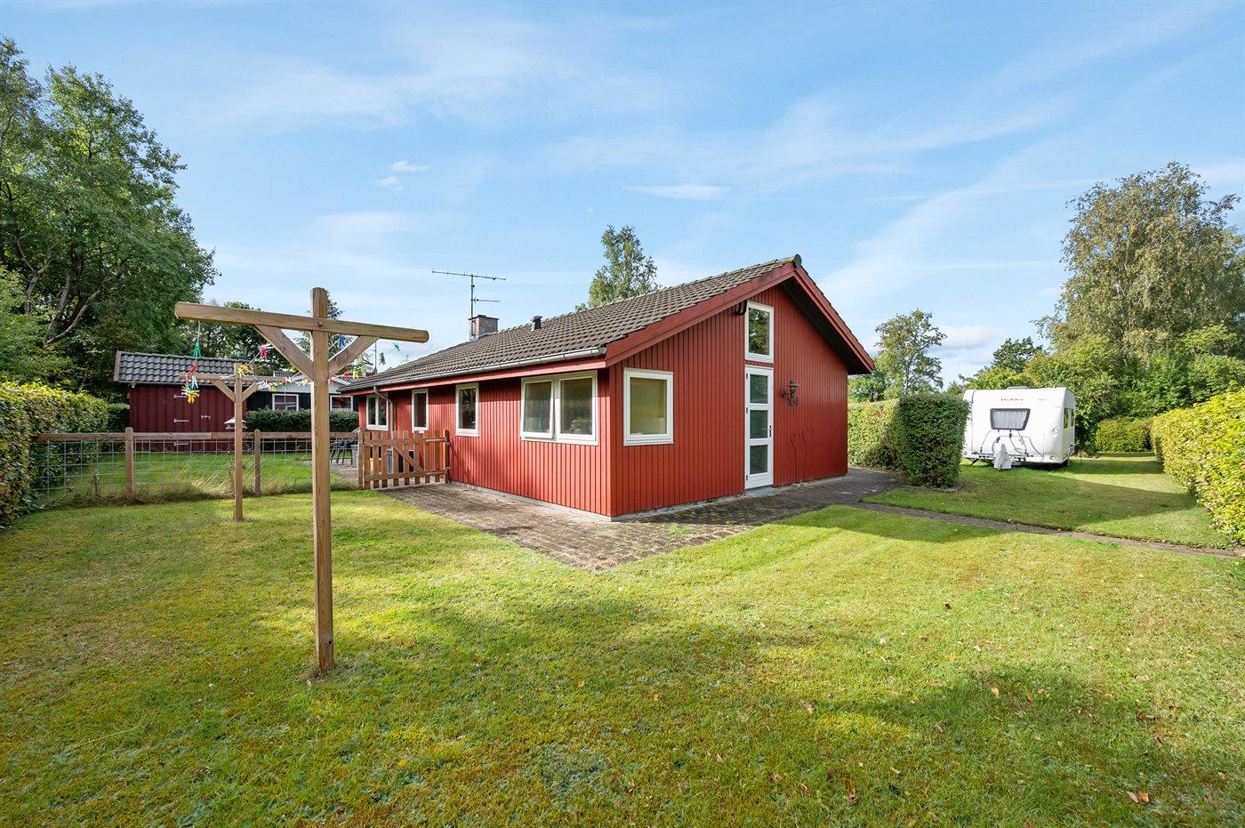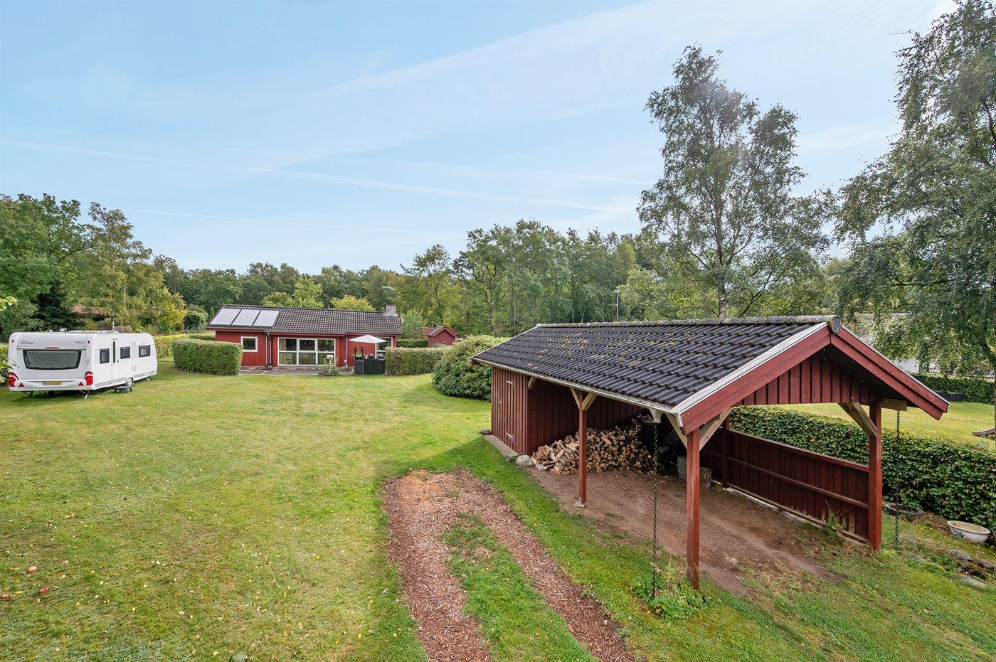 Ferieboligen er beliggende på en 1050 m² stor havegrund. Grunden er indhegnet. Der er en sø i en afstand af 300 m. Nærmeste forretning er beliggende i en afstand af 5000 m. Til ferieboligen hører åbent terrasseareal. Der ligger en legeplads i en afstand af 200 m. Shelter. Grill til rådighed. Der er carport til rådighed. Parkering ved ferieboligen.