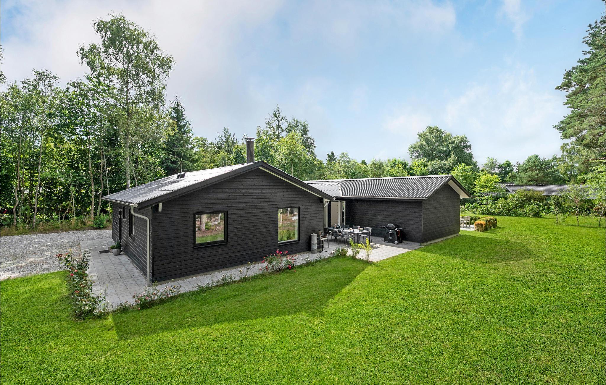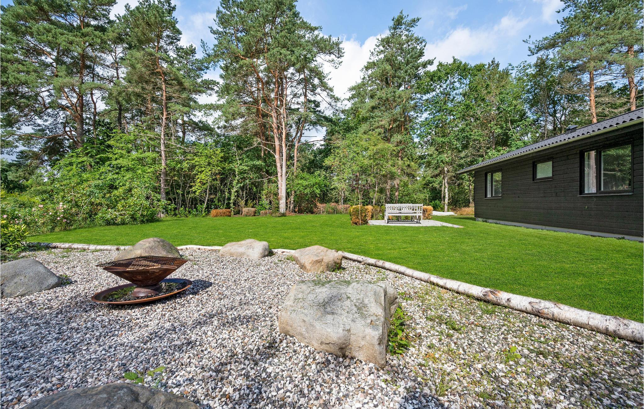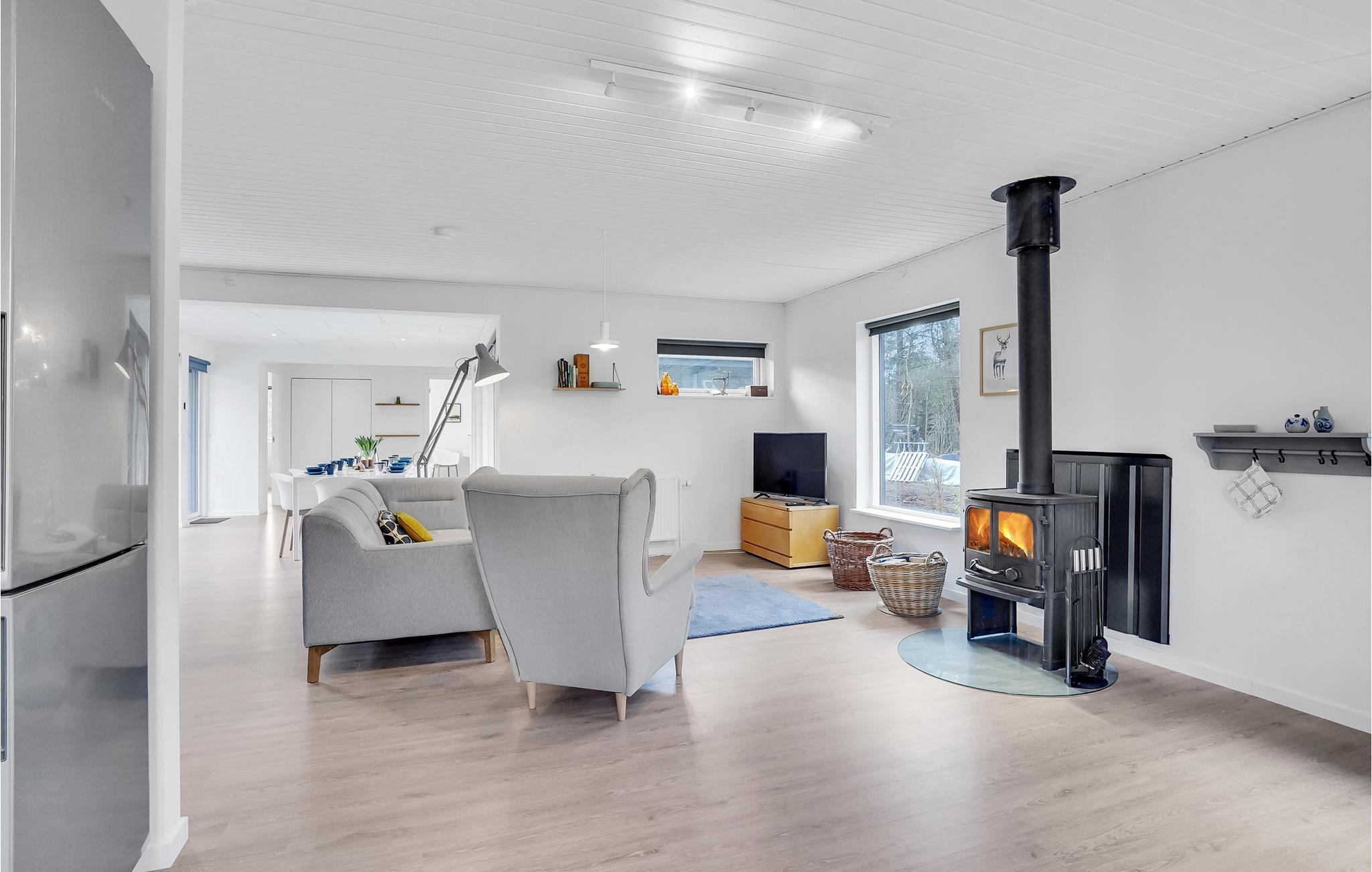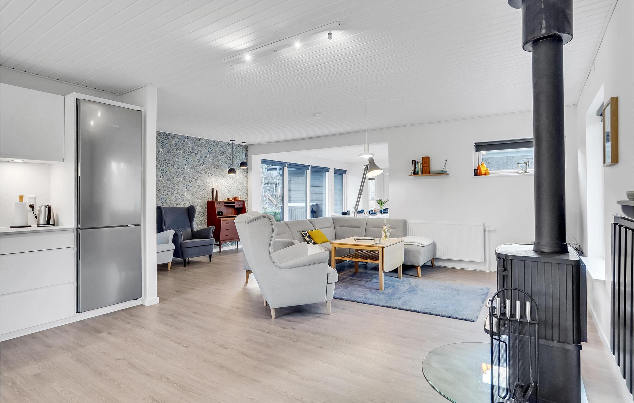 Dette typiske skandinaviske feriehus stod først færdigt i 2022 og er blevet smagfuldt indrettet. Her kan man altid finde et behageligt sted at slappe af, fx i det åbne, lyse opholdsområde foran brændeovnen eller ude i solen på terrassen.