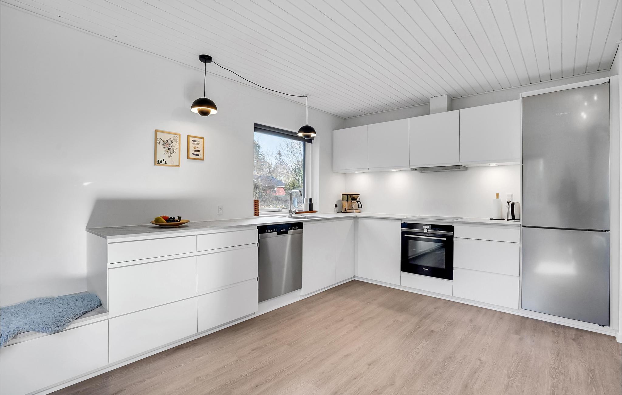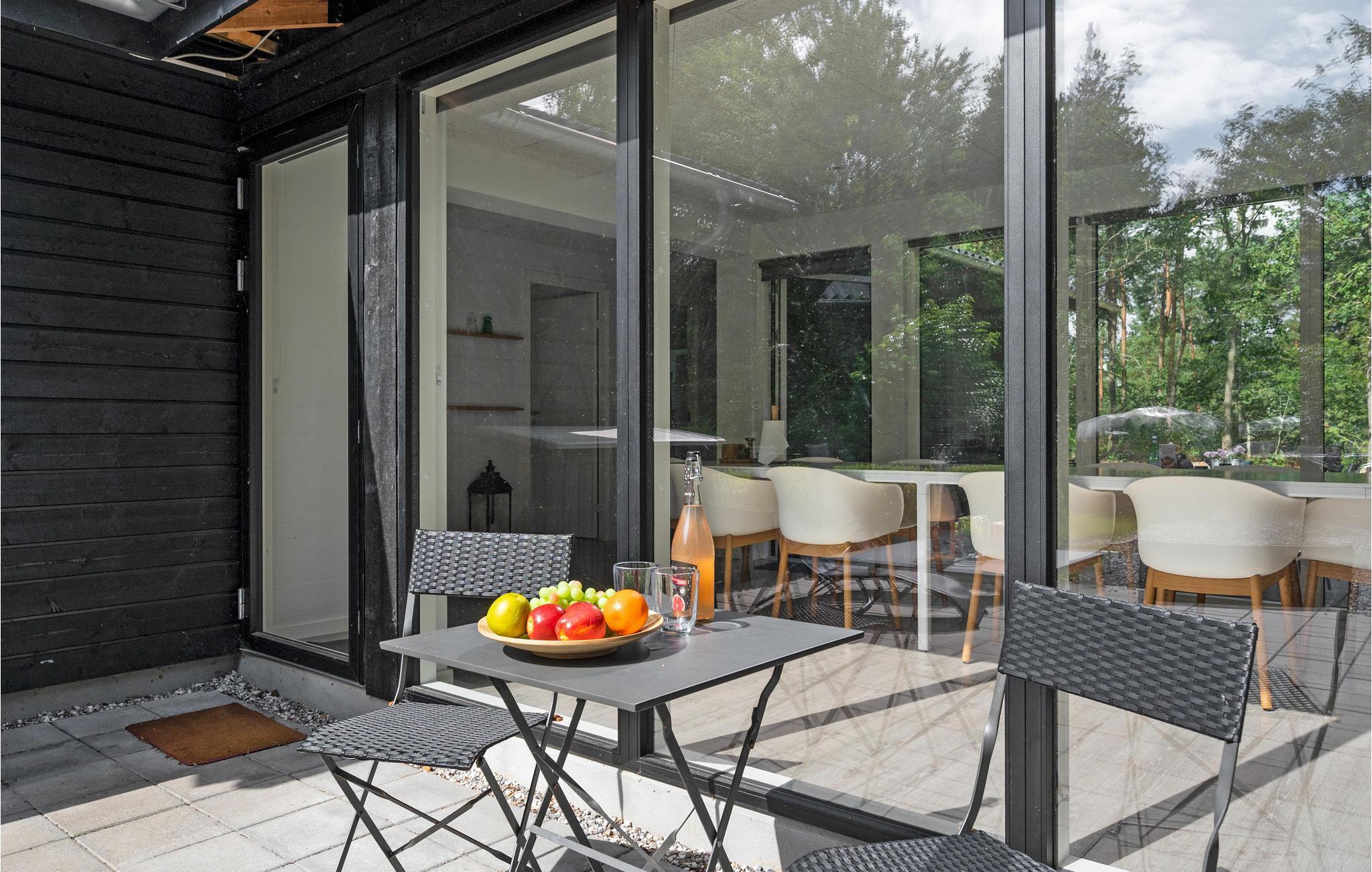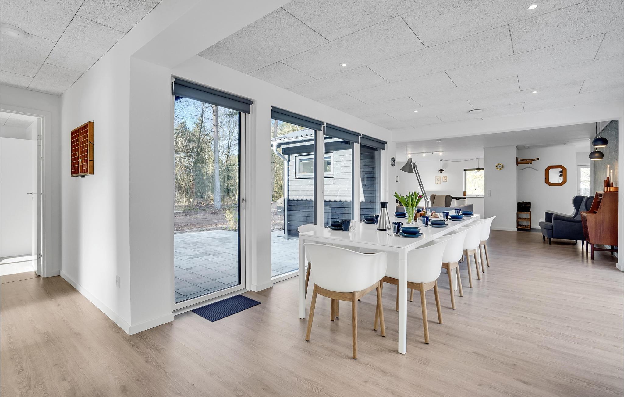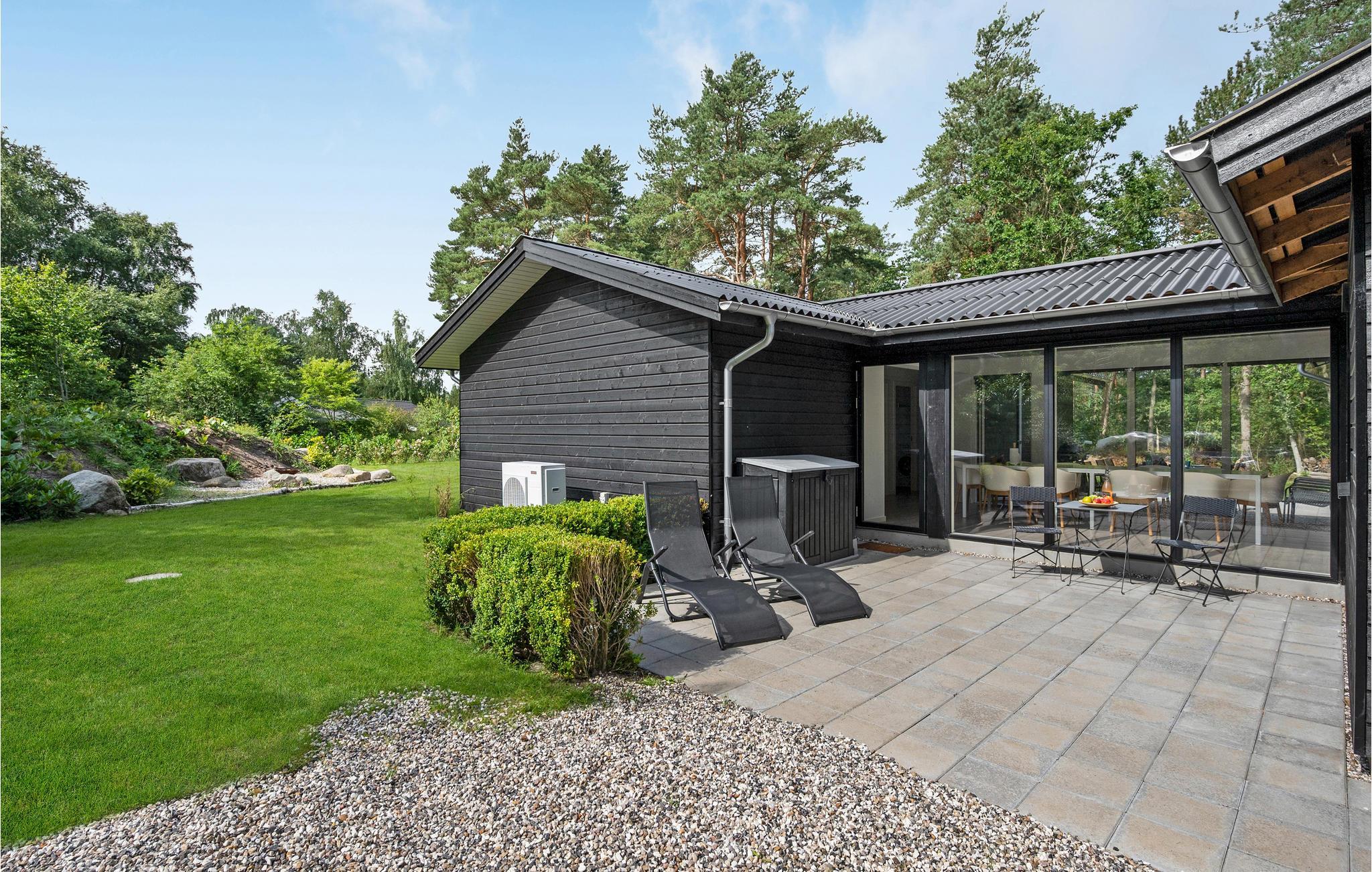 Dette typiske skandinaviske feriehus stod først færdigt i 2022 og er blevet smagfuldt indrettet. Her kan man altid finde et behageligt sted at slappe af, fx i det åbne, lyse opholdsområde foran brændeovnen eller ude i solen på terrassen.