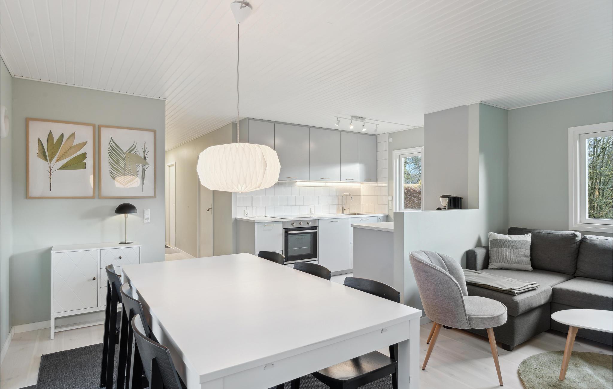 Forlad byen og find ro og fred i dette moderne og chikke feriehus. Indretningen er meget smagfuld og tilbyder jer stor komfort, hvor I rigtig kan koble af og komme ned i gear. De lyse farver skaber en elegant atmosfære, hvor I kan nyde at lave mad, lege og slappe af sammen. Fra spisepladsen kan I træde ud på den store træterrasse, som bliver til en ekstra stue i sommermånederne. Indtag lækker grillmad i det fri og leg sammen med jeres børn på græsplænen.