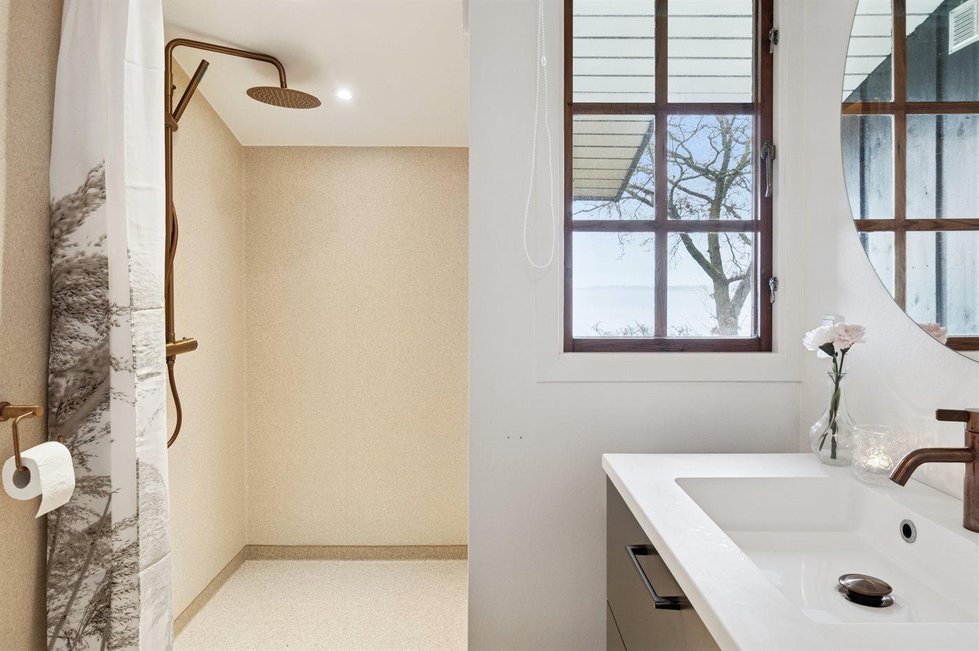 Der er 3 soveværelser. Soveværelset mod fjorden er med dobbeltseng og har den mest fantastiske udsigt til fjorden. Der er endnu et værelse med dobbeltseng. I det tredje soveværelse er en enkelt soveplads (denne soveplads måler 85x190 cm.). Badeværelset er med bruseniche.