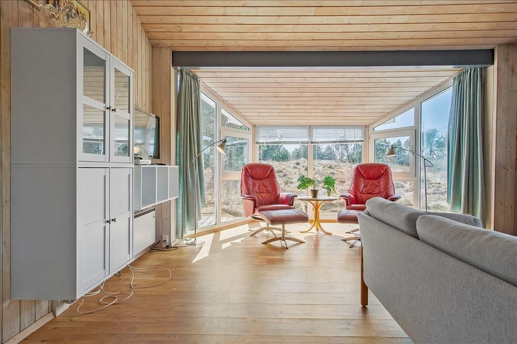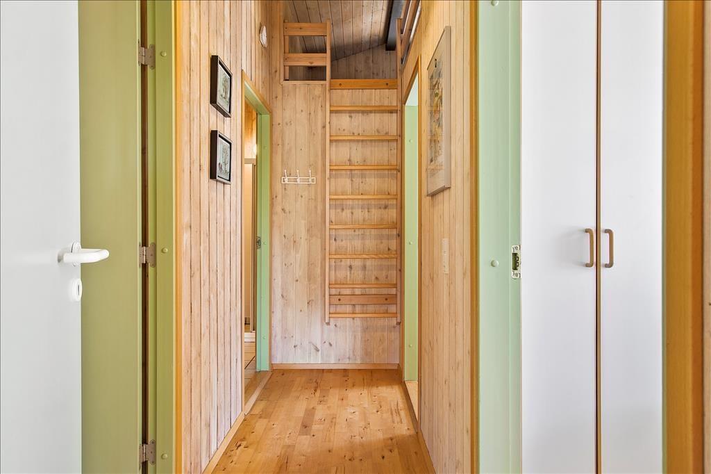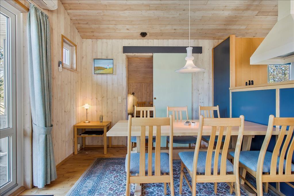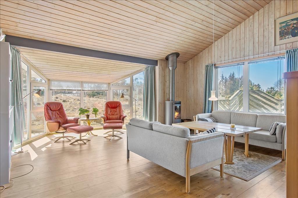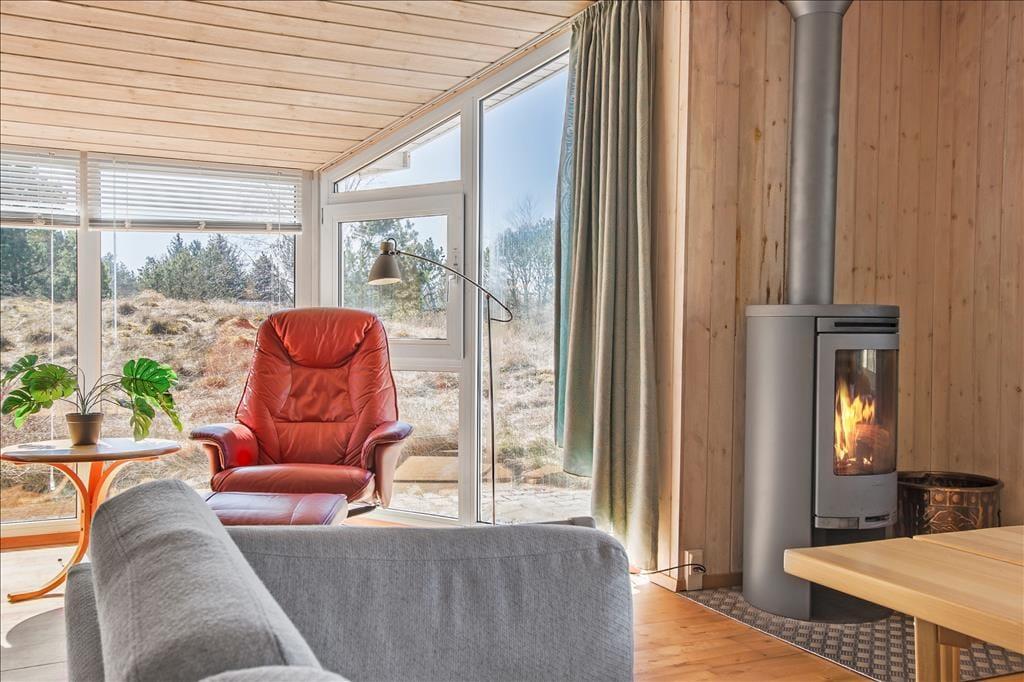 Sommerhusets indretning er perfekt for en børnefamilie, og der er endda plads til bedsteforældrene, hvis det ønskes. To badeværelser med bruser gør morgenerne nemme og uden kø. Til en rolig aften kan du tage en tur i saunaen og slappe af i spabadet. Du kan også læne dig tilbage i en af stuens sofaer med en spændende krimi i hånden og ild i brændeovnen. I løbet af dagen strømmer sollyset ind gennem de store vinduer og giver en smuk udsigt til naturgrunden. Og når du føler for at komme ud i det fri, kan du blot åbne terrassedøren og træde direkte ud i naturen.