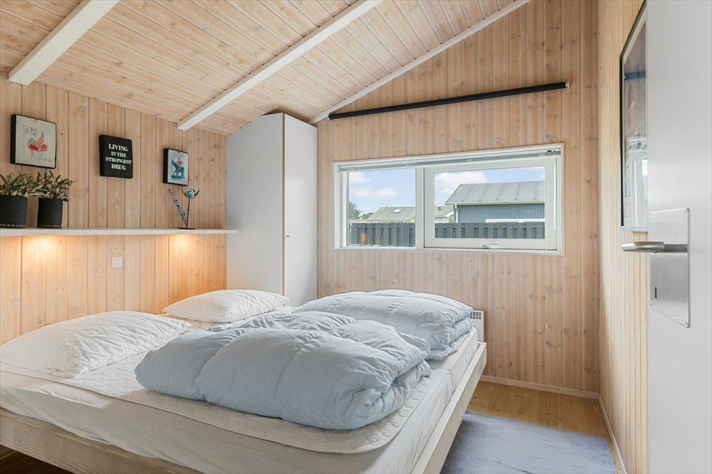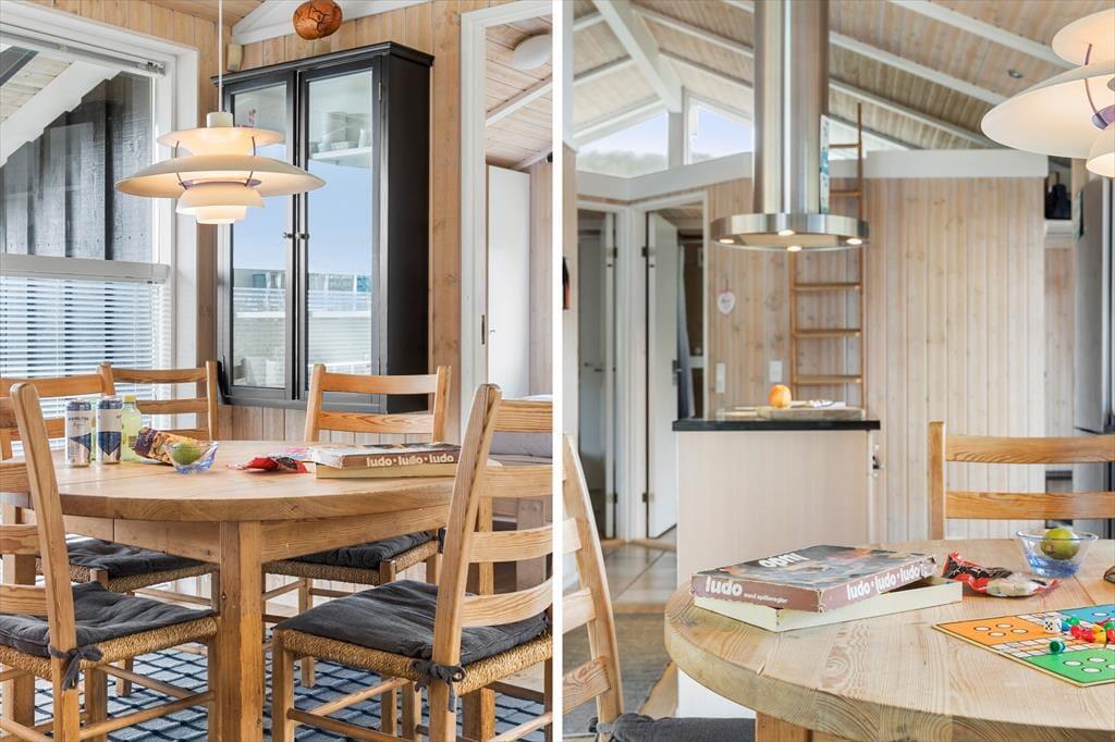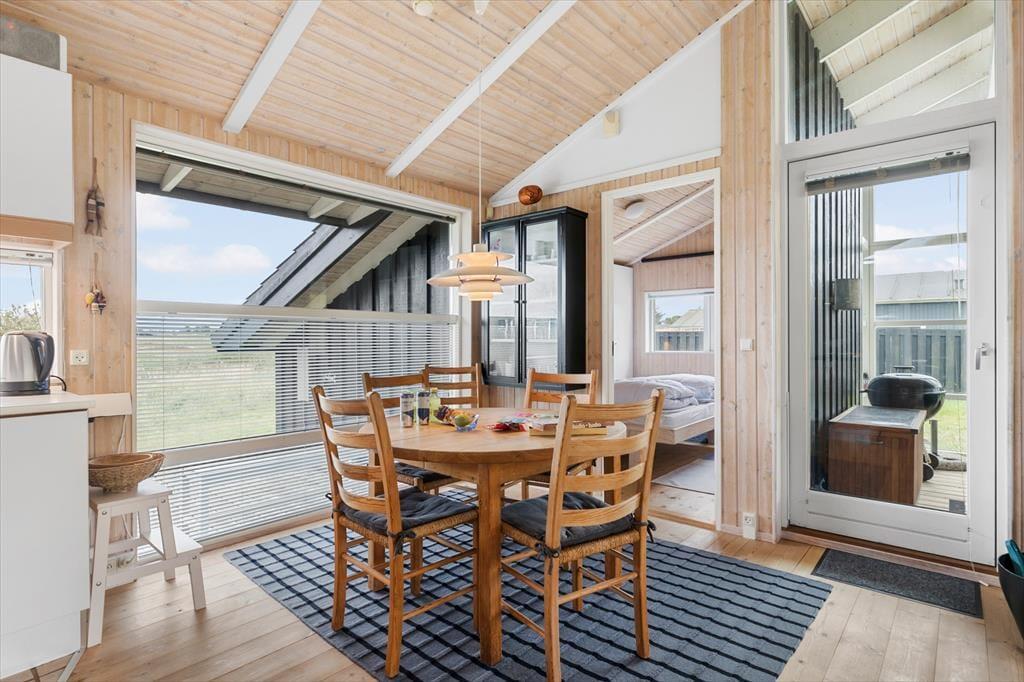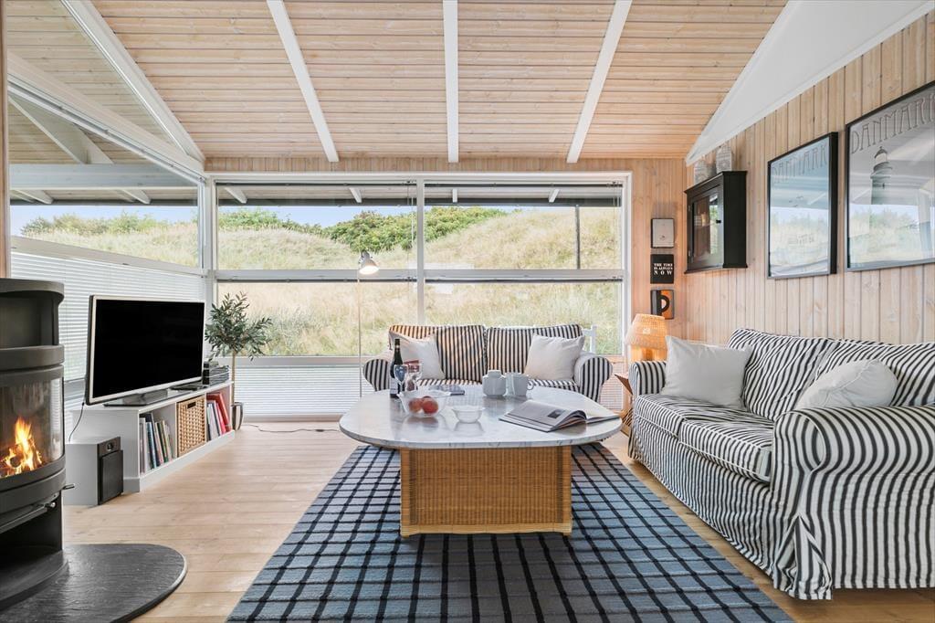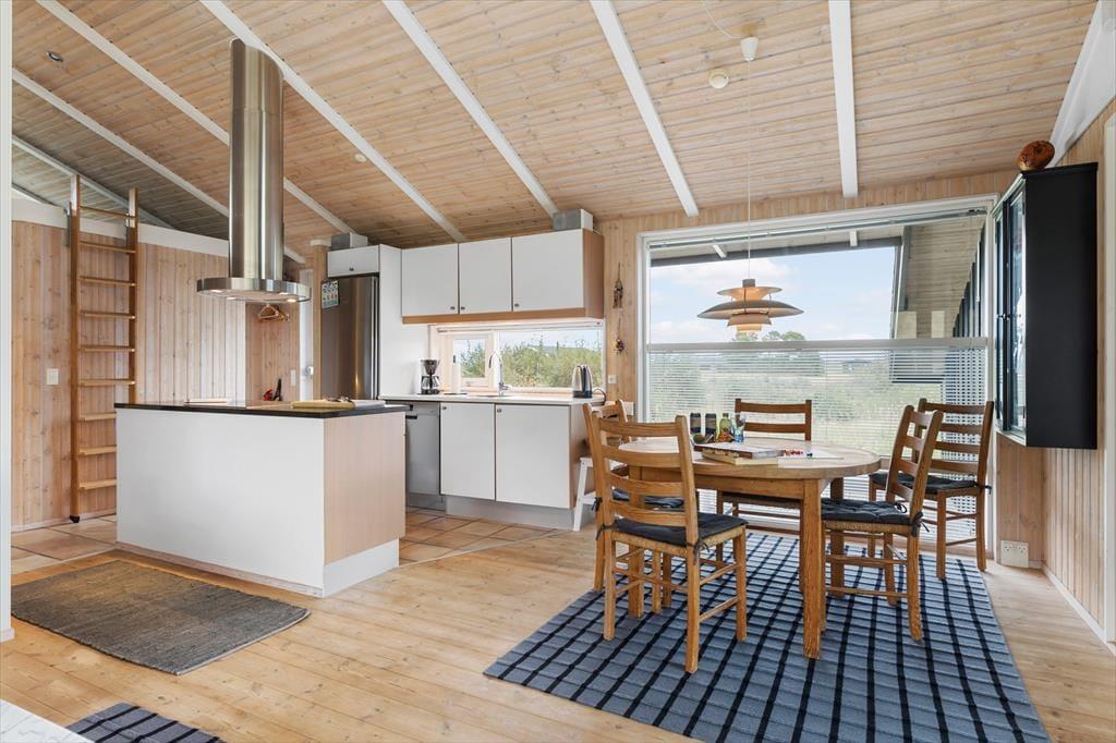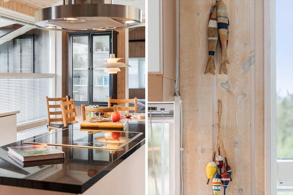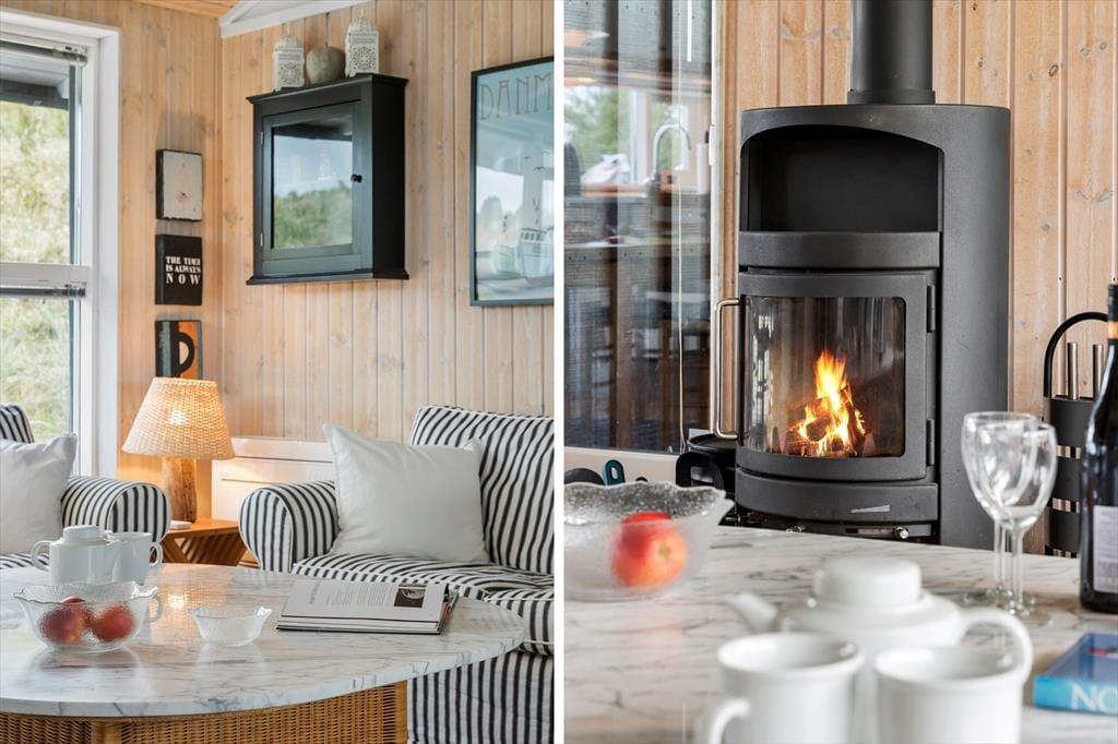 Sommerhuset er enkel og funktionel, og der er plads til både en større familie og to små familier, der ønsker at tilbringe ferien sammen. Ved indgangen møder dig to hyggelige værelser og et badeværelse, der udover en bruseniche også har et dejligt spabad, perfekt til lidt hjemme-wellness og afslapning. Køkkenet åbner op mod spiseafdelingen og stuen, hvilket skaber en fornemmelse af fællesskab under alle aktiviteter - madlavning, brætspil, eller bare en stille stund med en avis. Stuen byder på bløde sofaer, store vinduer der fylder rummet med et behageligt lys, og en brændeovn, der spreder varme på kølige dage og skaber en atmosfære af fuldstændig afslapning. Det sidste værelse ligger ved spiseafdelingen og har ligeledes god plads og opbevaringsmuligheder til tøj og sko. Alt i huset udstråler god kvalitet og stilfuld indretning med lyse og varme farver, der skaber en indbydende atmosfære.