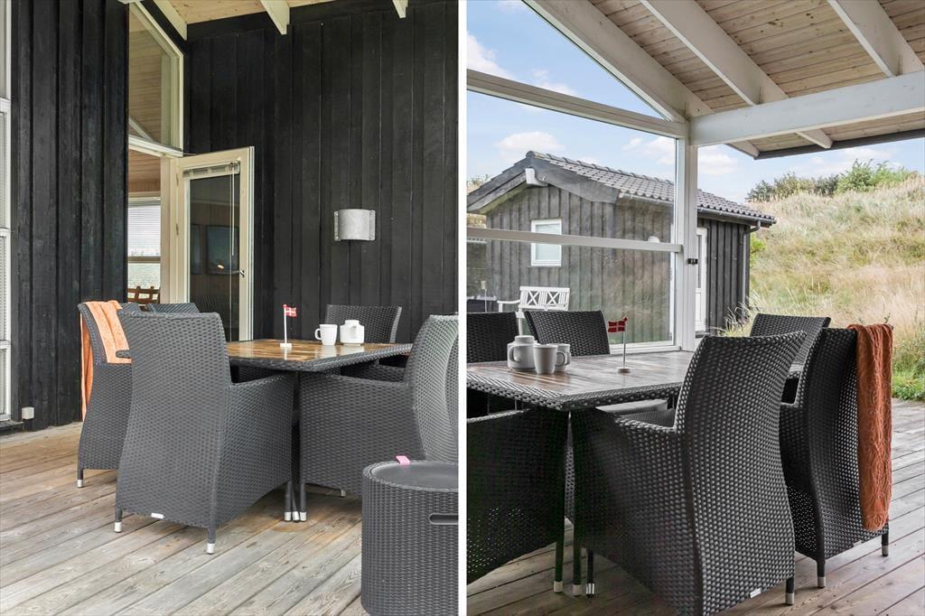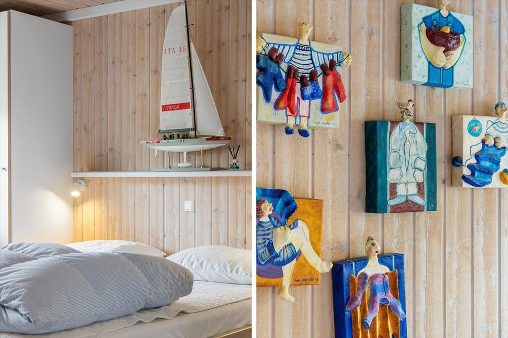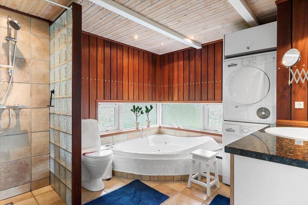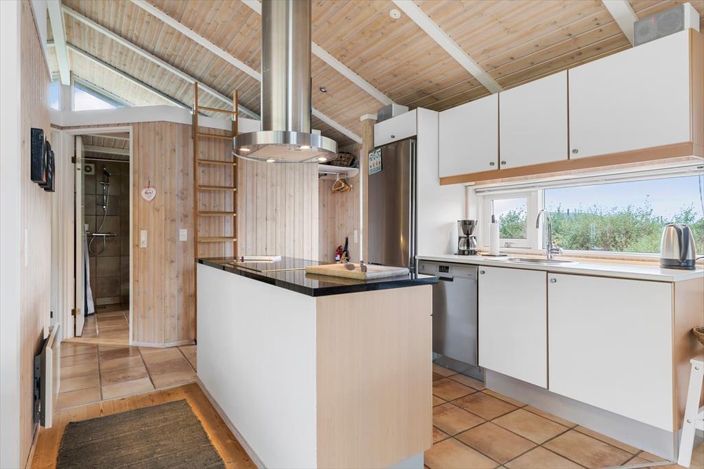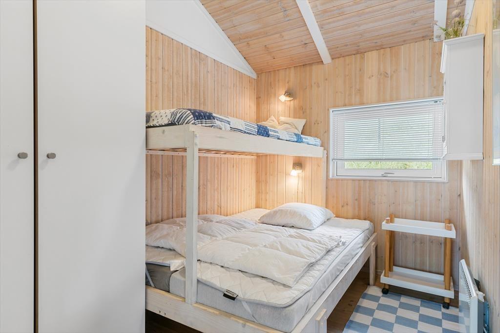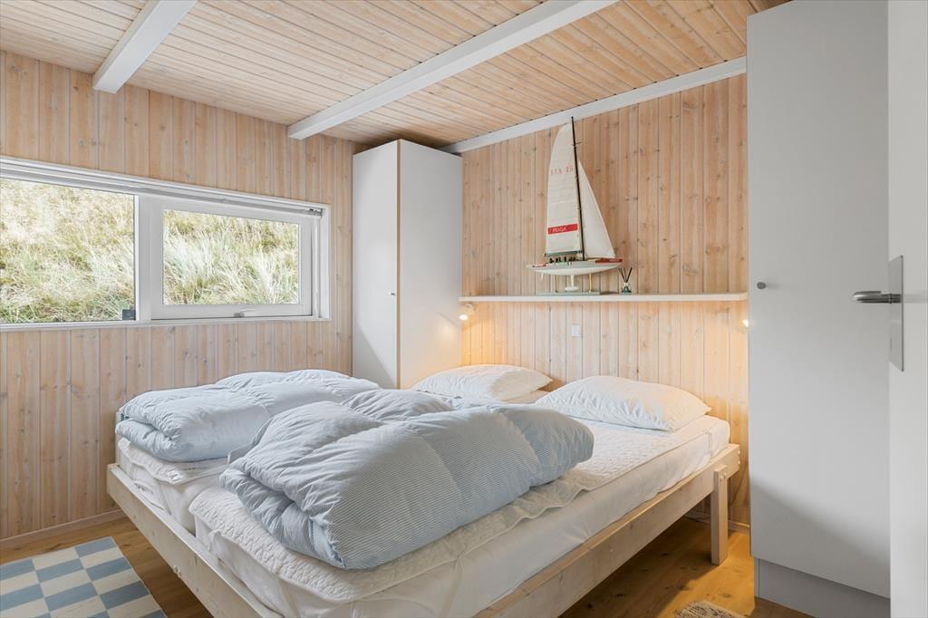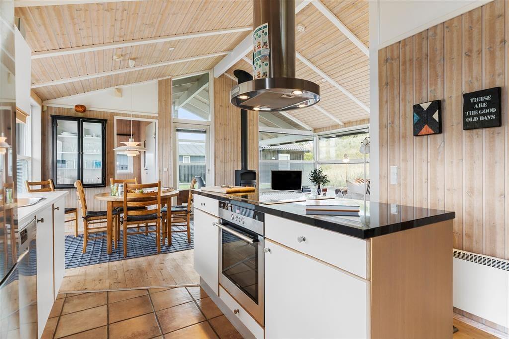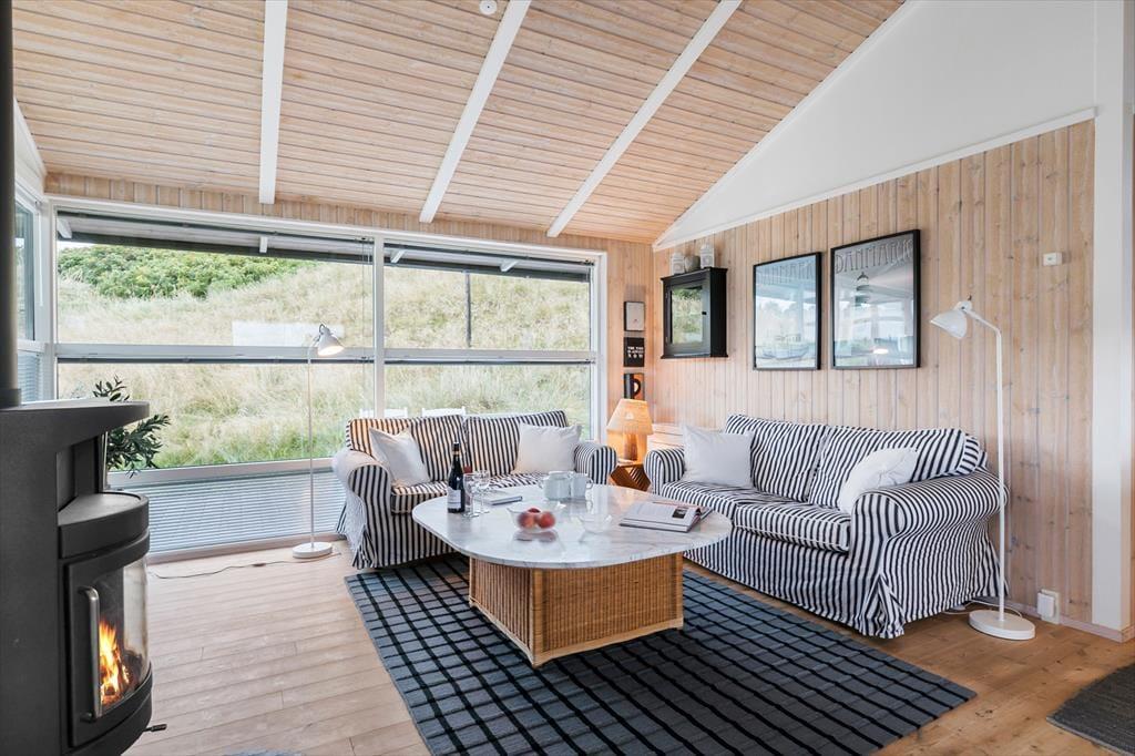 Sommerhuset er enkel og funktionel, og der er plads til både en større familie og to små familier, der ønsker at tilbringe ferien sammen. Ved indgangen møder dig to hyggelige værelser og et badeværelse, der udover en bruseniche også har et dejligt spabad, perfekt til lidt hjemme-wellness og afslapning. Køkkenet åbner op mod spiseafdelingen og stuen, hvilket skaber en fornemmelse af fællesskab under alle aktiviteter - madlavning, brætspil, eller bare en stille stund med en avis. Stuen byder på bløde sofaer, store vinduer der fylder rummet med et behageligt lys, og en brændeovn, der spreder varme på kølige dage og skaber en atmosfære af fuldstændig afslapning. Det sidste værelse ligger ved spiseafdelingen og har ligeledes god plads og opbevaringsmuligheder til tøj og sko. Alt i huset udstråler god kvalitet og stilfuld indretning med lyse og varme farver, der skaber en indbydende atmosfære.
