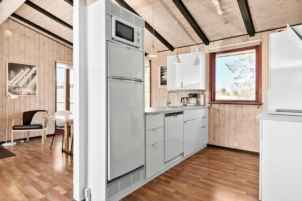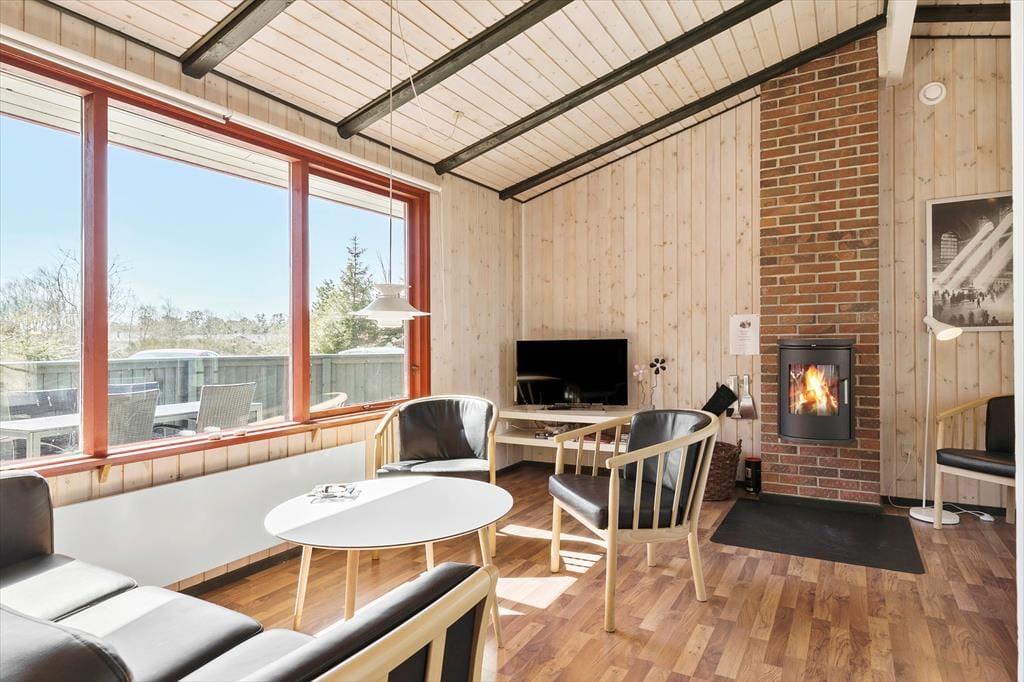 Indenfor mødes du af en lys og venlig atmosfære, der gør det let at falde til. De store vinduespartier trækker lyset ind og åbner op for udsigten til naturen omkring huset, mens den velindrettede stue med komfortable møbler indbyder til afslappende stunder. Brændeovnen spreder en dejlig varme, der gør det hyggeligt at samles her efter en lang dag med oplevelser. Køkkenet ligger i åben forbindelse med stuen, så snakken kan gå frit, mens der kokkereres. Huset rummer også gode soveværelser, hvor du kan nyde en lang nats søvn og vågne op til lyden af fuglekvidder.