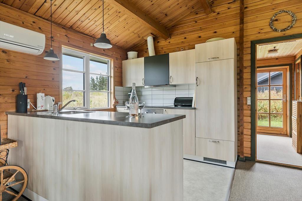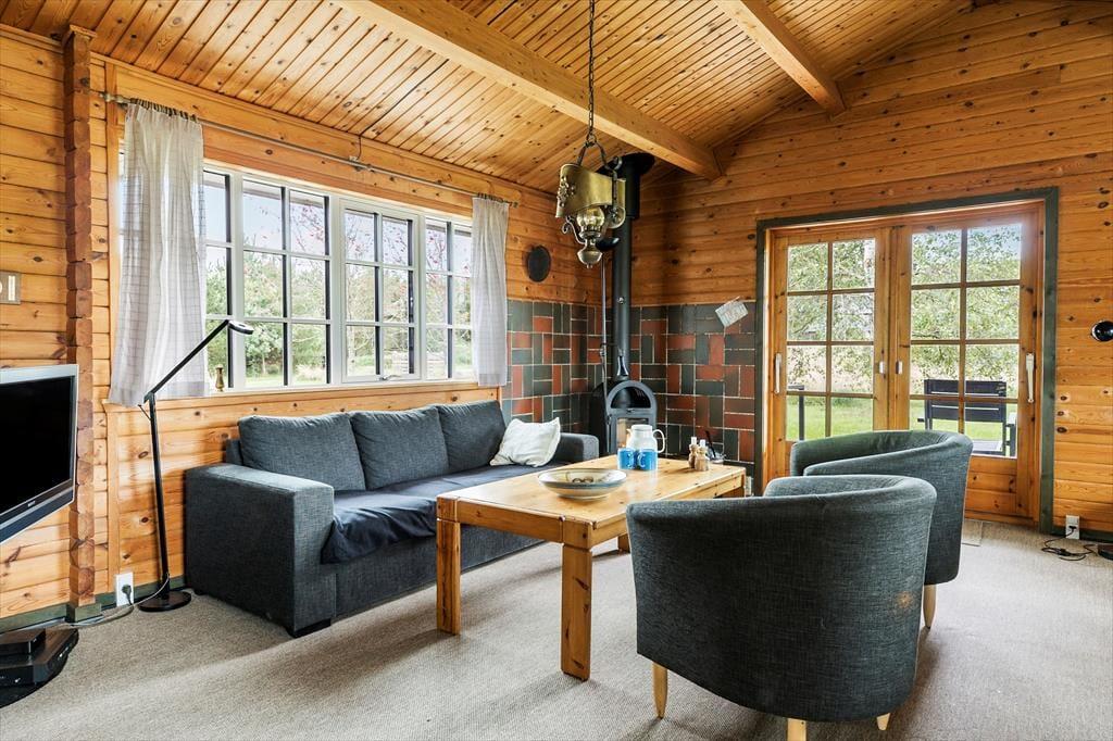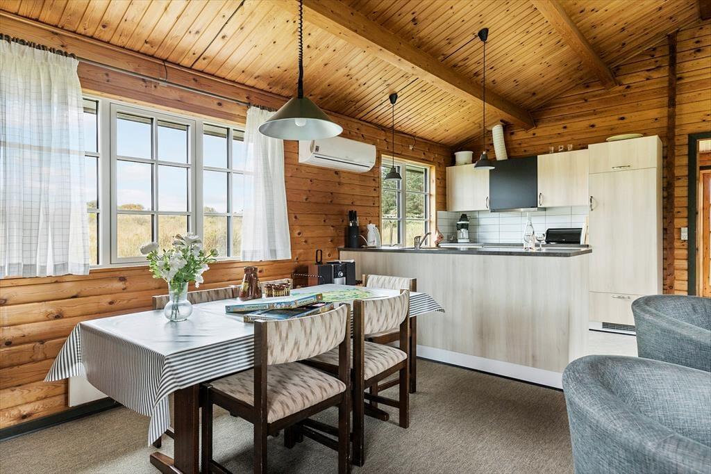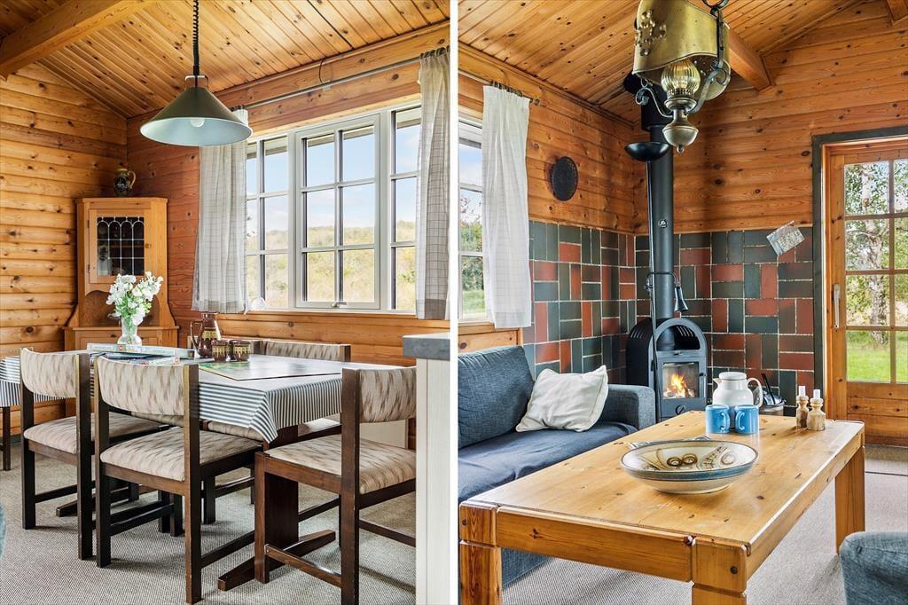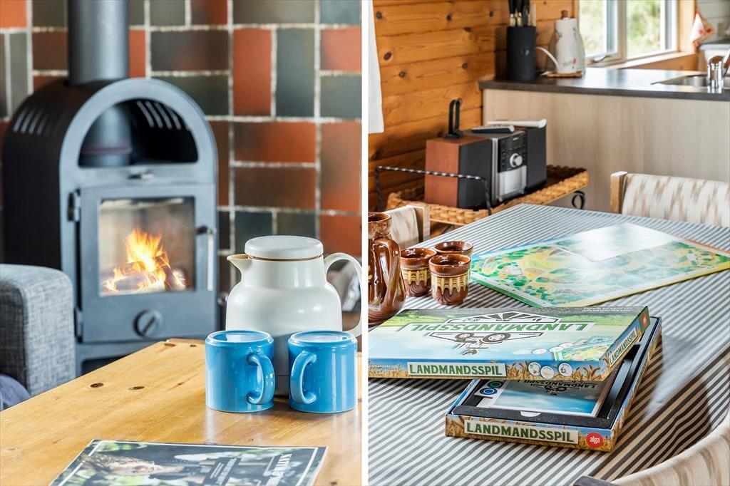 Indenfor bliver du mødt af en varm og indbydende atmosfære, hvor hyggelige detaljer sætter rammen for din ferie. Den rummelige stue med brændeovn er perfekt til afslapning efter en dag fyldt med oplevelser – måske med en god bog eller en film på fladskærms-tv’et. Køkkenet ligger i åben forbindelse med stuen, hvilket gør det let at være sammen, uanset om I laver mad, spiller spil eller bare nyder hinandens selskab. Soveværelserne inviterer til lange, afslappede morgener, og badeværelset er praktisk indrettet, så alle føler sig godt tilpas under opholdet.