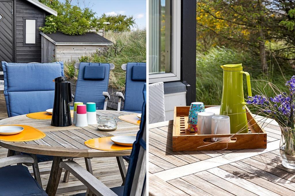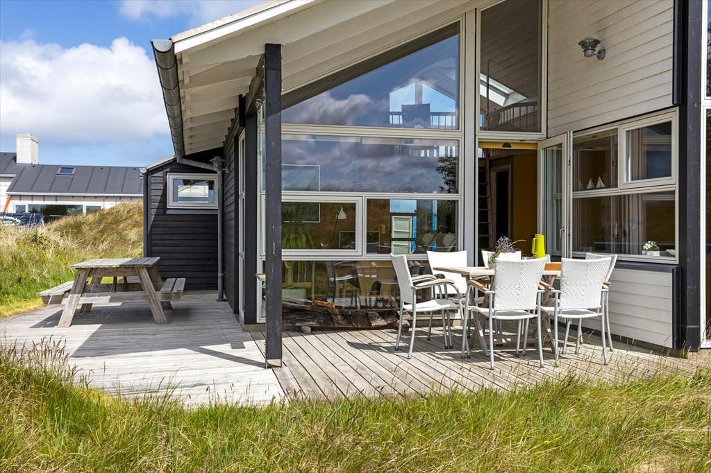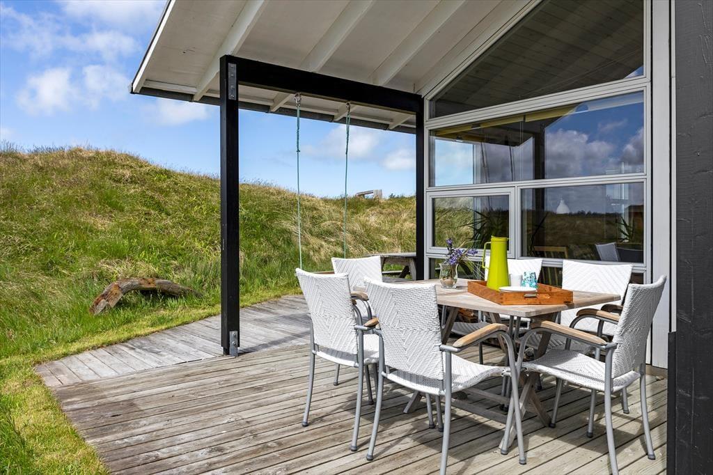 Den store, private naturgrund omkranser huset og skaber en fredfyldt atmosfære, hvor I kan nyde solen dagen lang. På de store og velanlagte terrassearealer, der findes rundt om hele huset, kan I spise jeres måltider under åben himmel, eller slappe af i de komfortable havemøbler med en god bog og med lyden af naturen omkring jer. Der er direkte adgang til terrasse fra alle opholdsrum og soverum. Fra grunden er der kig til havet.