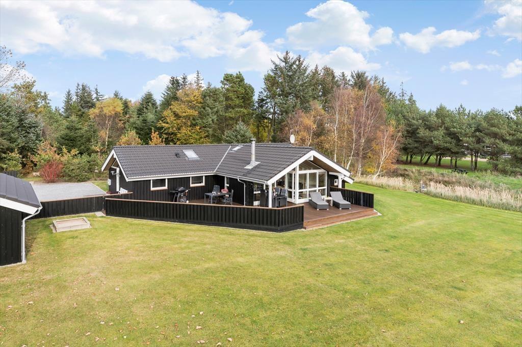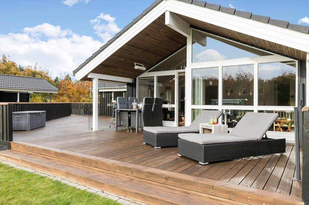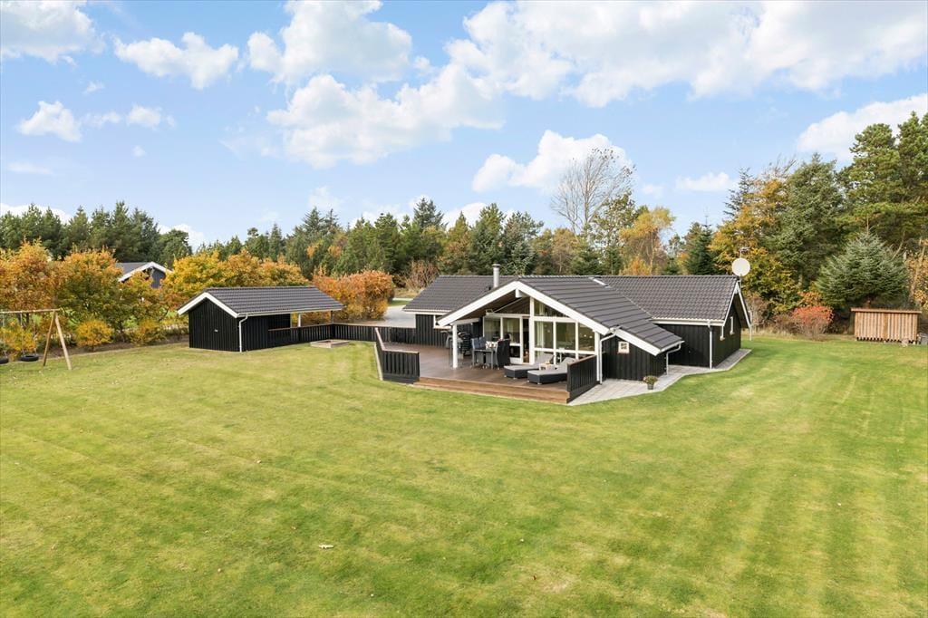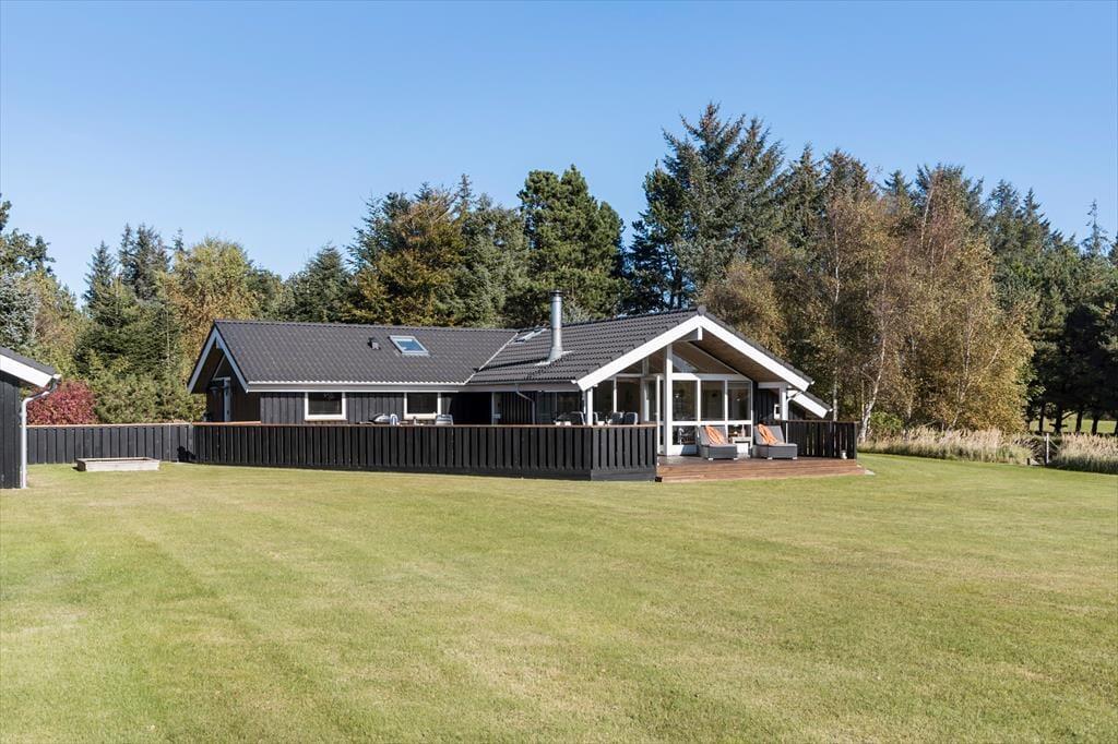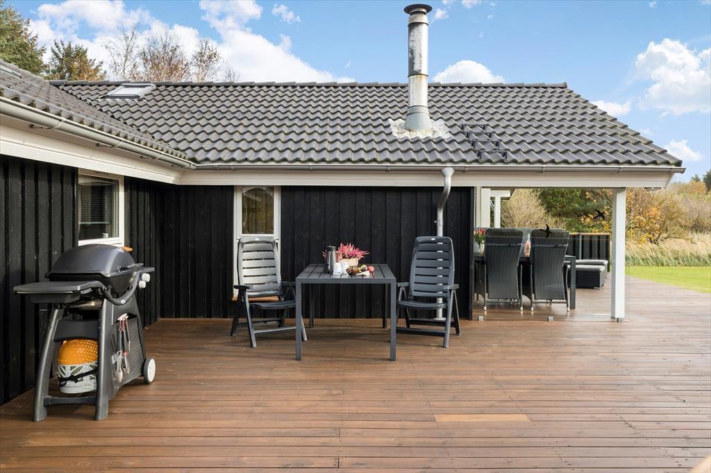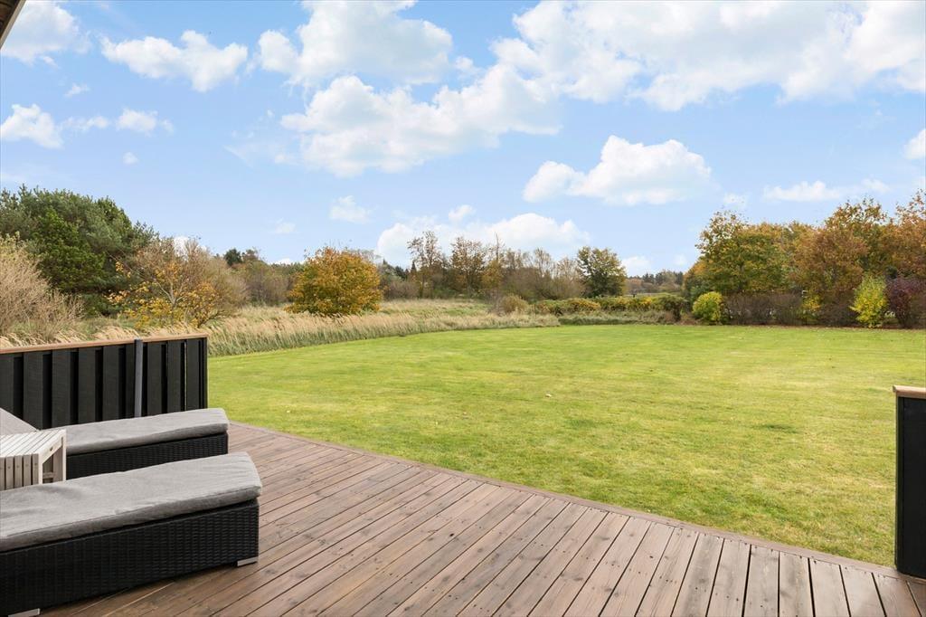 Udendørsarealerne er lige så indbydende som huset selv. Den store terrasse er perfekt til at nyde solens stråler eller til at afslutte dagen med en middag under åben himmel. Haven omgiver huset med grønne nuancer og en privat atmosfære, der indbyder til stilhed og refleksion. Med de velholdte omgivelser og en fredfyldt stemning er dette stedet, hvor du virkelig kan trække vejret og finde ro i naturen.