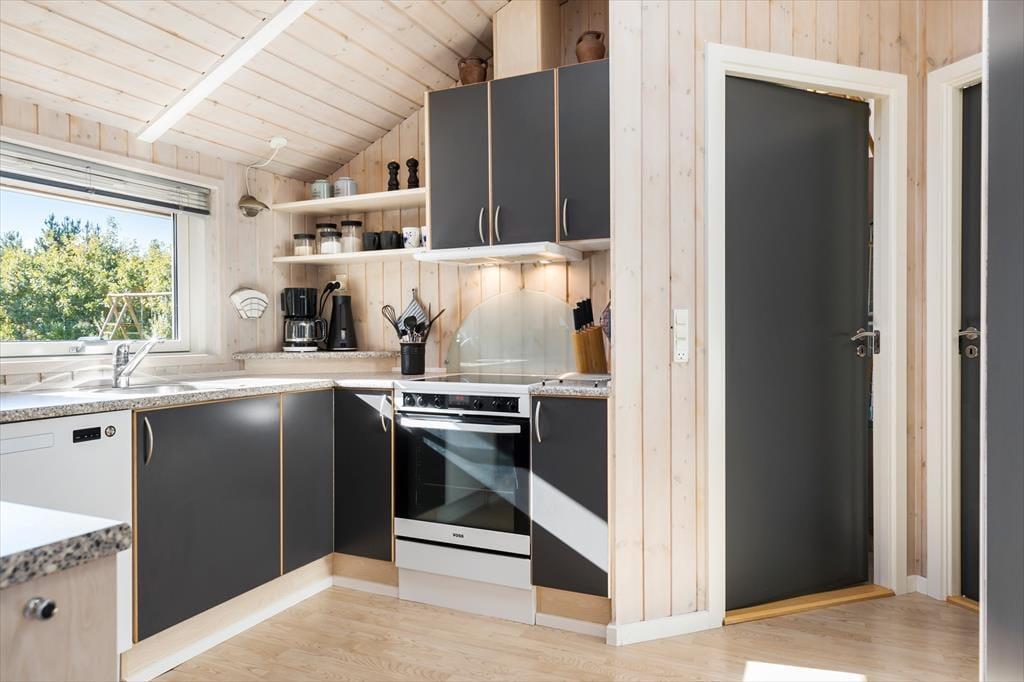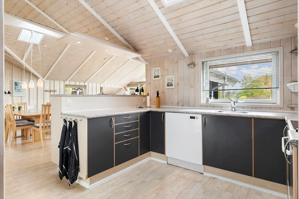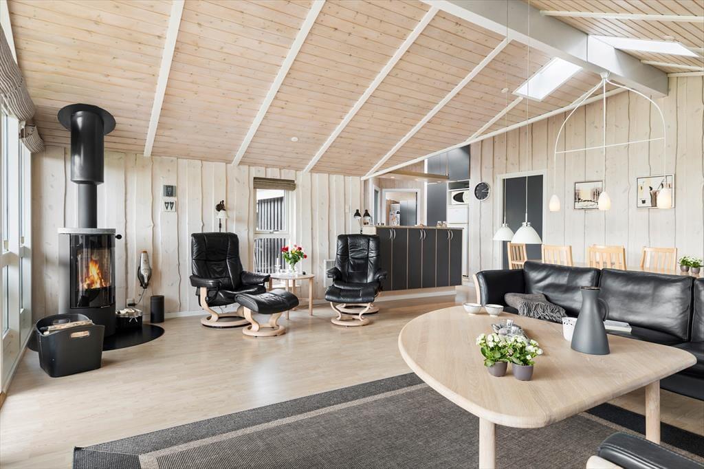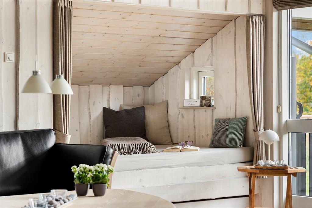 Sommerhuset byder dig velkommen med en lys og rummelig indretning, der straks giver en følelse af velvære. Stuen er åben og hyggelig, og de store vinduer trækker naturen helt ind i opholdsrummet. Alkoven i stuen er et særligt plus – et stille hjørne, hvor du kan fordybe dig i en god bog eller blot nyde øjeblikkets ro. Køkkenet, som er i åben forbindelse med stuen, gør det let at være sammen om måltiderne, og de komfortable soveværelser indbyder til lange, afslappende morgener. Huset emmer af harmoni og giver dig plads til både samvær og egne stunder.