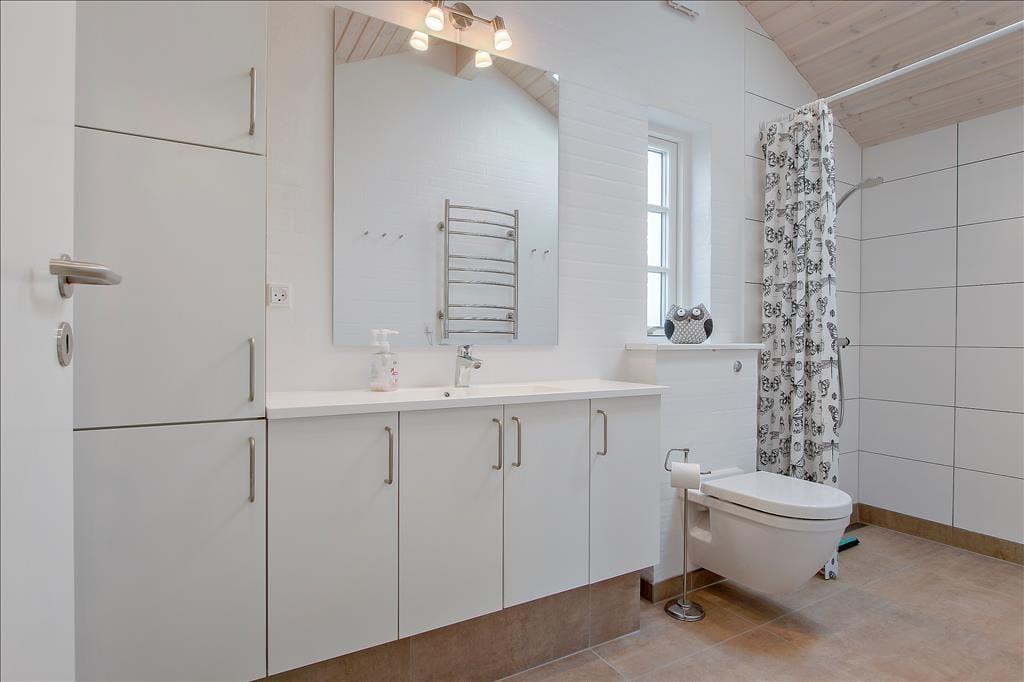 Sommerhuset byder dig velkommen med en varm og lys indretning, der straks skaber en følelse af hjemlig hygge. De store vinduer lukker det naturlige lys ind og giver en dejlig udsigt til de grønne omgivelser. Stuen er perfekt til afslapning efter en dag ved stranden, og med det åbne køkken-alrum kan hele familien samles om madlavning og måltider. Her kan du nemt forestille dig hyggelige aftener med kortspil, film eller bare gode samtaler.