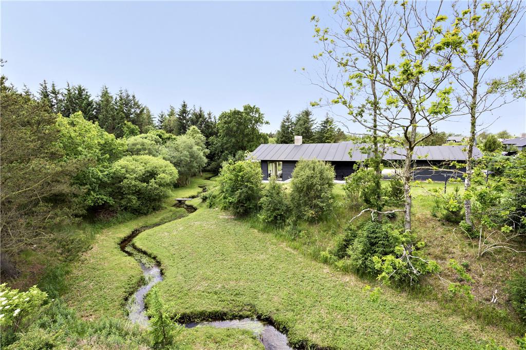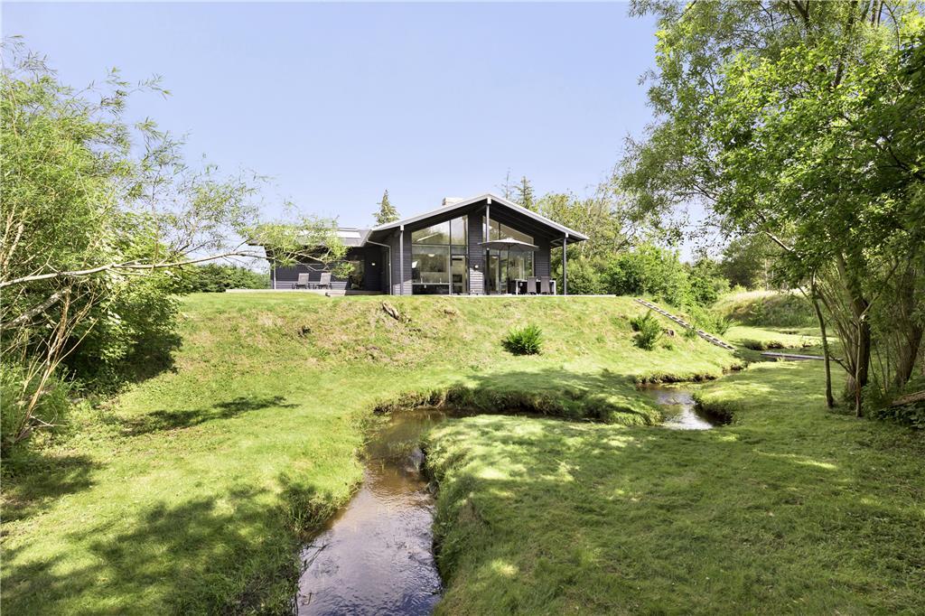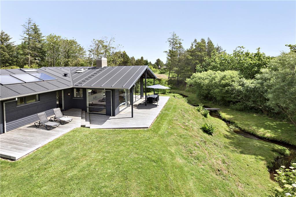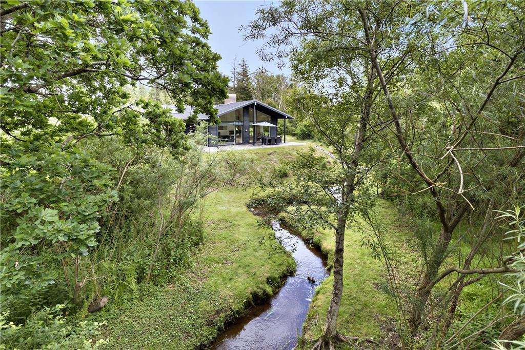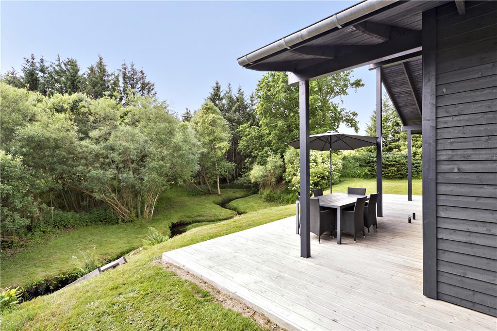 Udenfor venter et skønt terrassemiljø, hvor du kan starte dagen med morgenkaffen, mens du lytter til fuglesangen og ser dyrelivet udfolde sig lige udenfor. Flodbækken, der bugter sig gennem det lavereliggende område, giver en helt særlig stemning til haven. Terrassen er ideel til grillmiddage og afslapning i solen, og med plads til både børn og voksne er her alle muligheder for at nyde ferielivet i det fri.