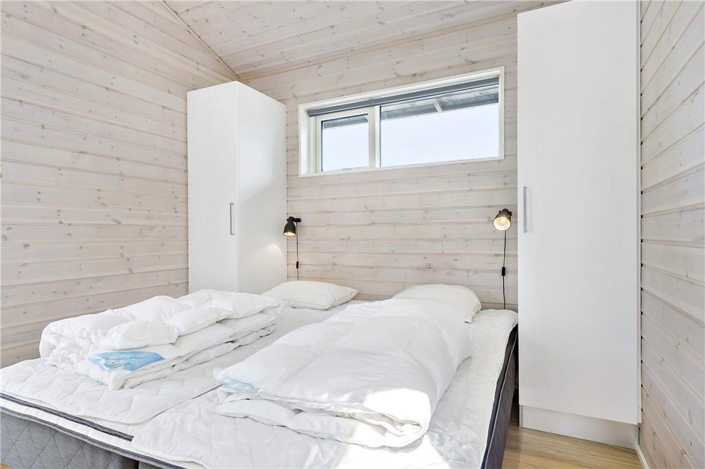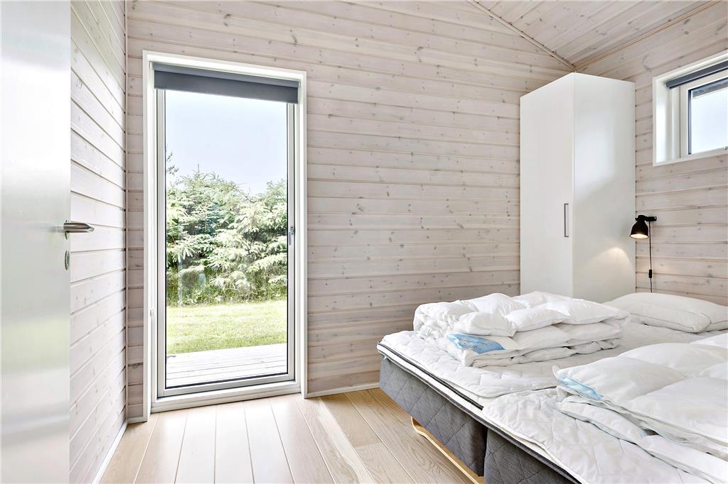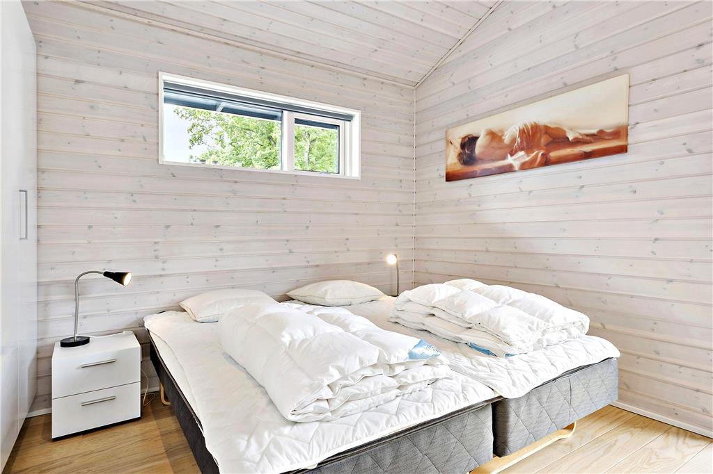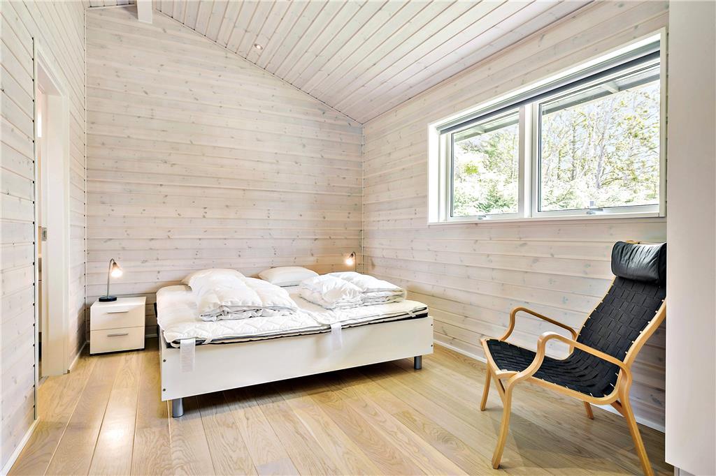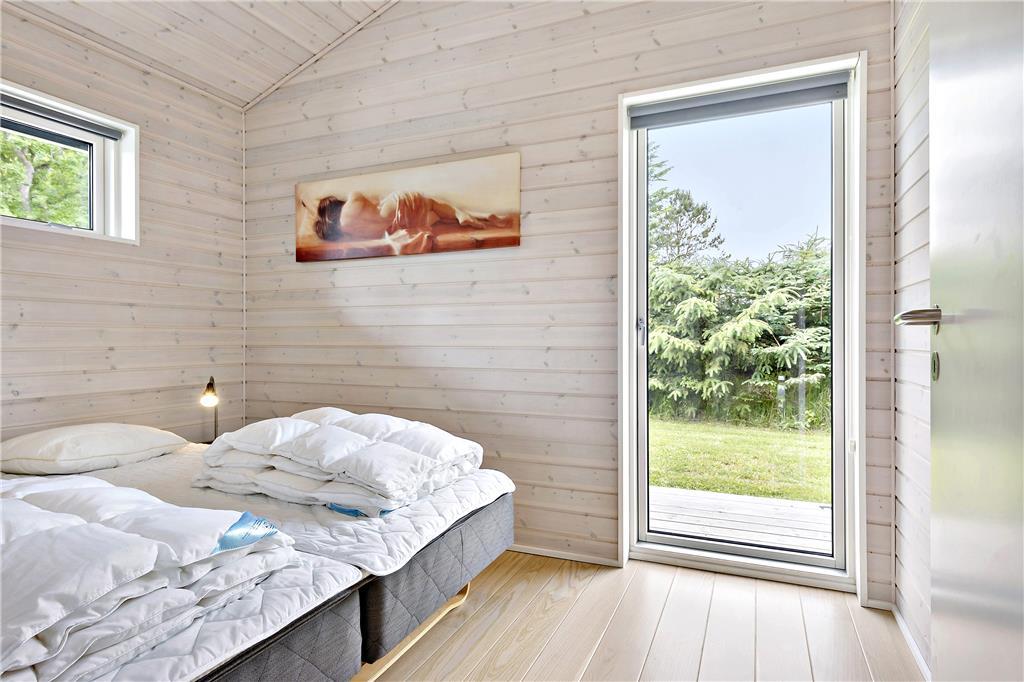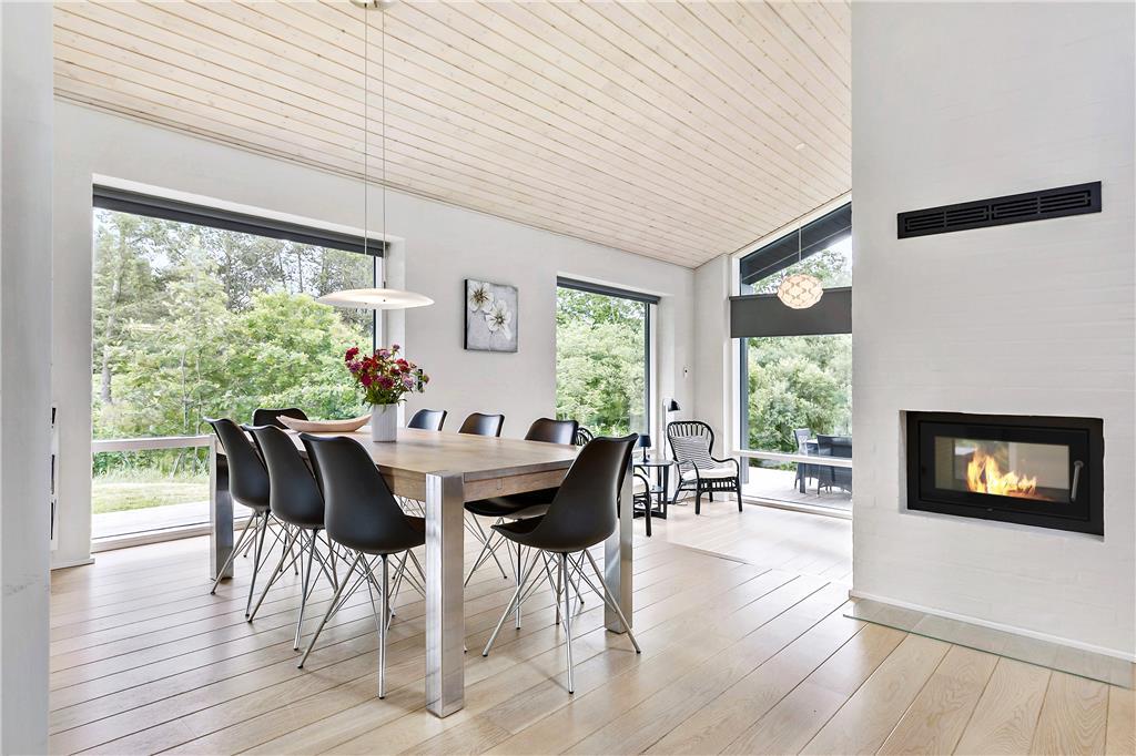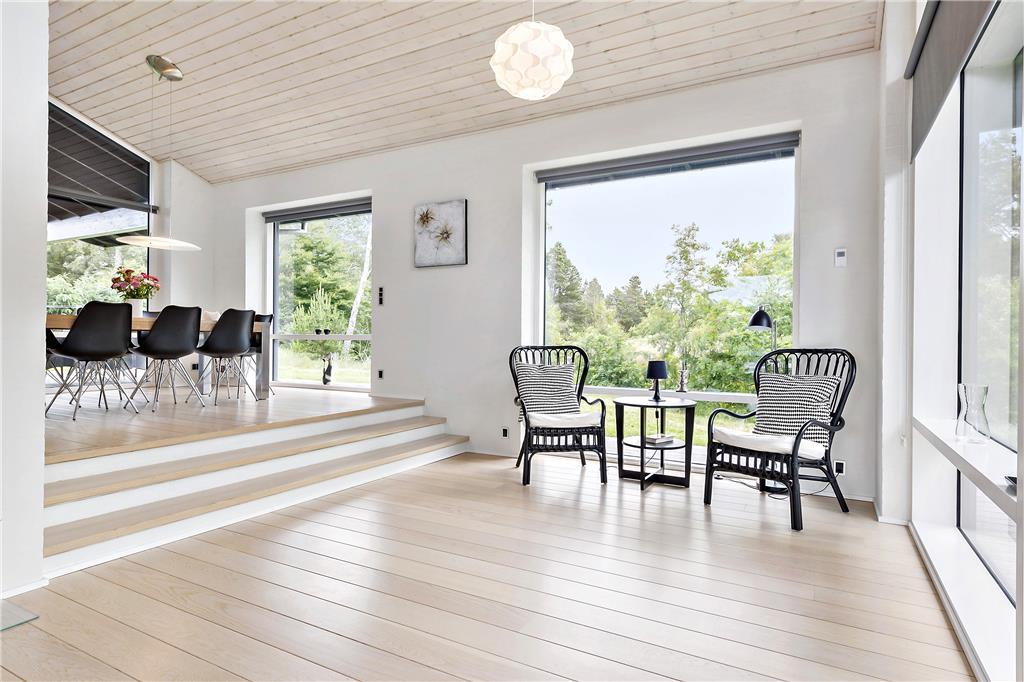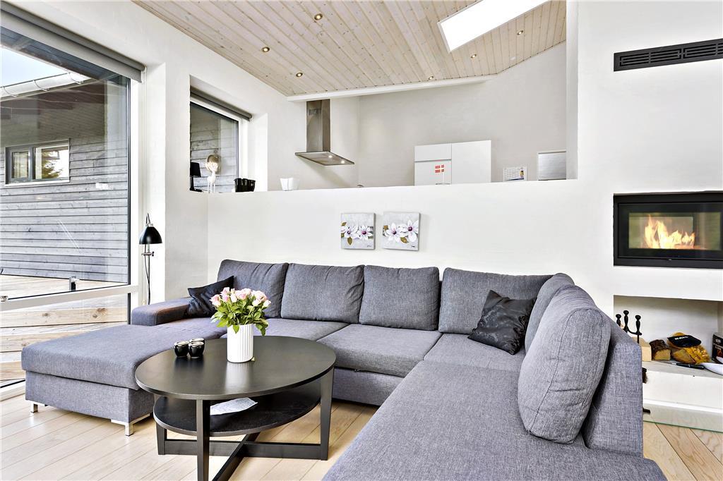 Sommerhuset byder dig indenfor med en lys og rummelig indretning, hvor loft til kip skaber en åben og indbydende atmosfære. Store vinduespartier lader naturen udenfor komme helt tæt på og inviterer masser af lys ind i stuen. Køkken og opholdsområdet smelter sammen, så du kan være sammen med dine kære, uanset om der laves mad eller slappes af. Indretningen er skabt til både hygge og funktionalitet – perfekt til afslappende feriedage, uanset vejret.