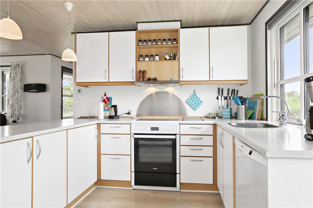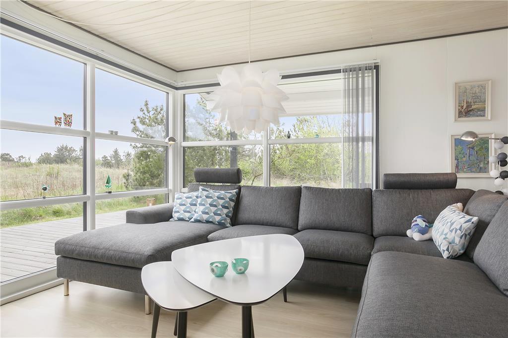 Når du træder ind i sommerhuset, bliver du mødt af et rummeligt og lyst opholdsrum, hvor de store vinduespartier skaber et naturligt lysindfald og en følelse af åbenhed. Stuen er indrettet med komfortable møbler og en brændeovn, der inviterer til hyggelige aftener med spil og samtaler. Det åbne køkken ligger i forbindelse med stuen, så du kan tilberede måltider uden at gå glip af samværet. Soveværelserne er indrettet med fokus på afslapning, og huset emmer af ro og harmoni, der får dig til at føle dig hjemme fra første øjeblik.