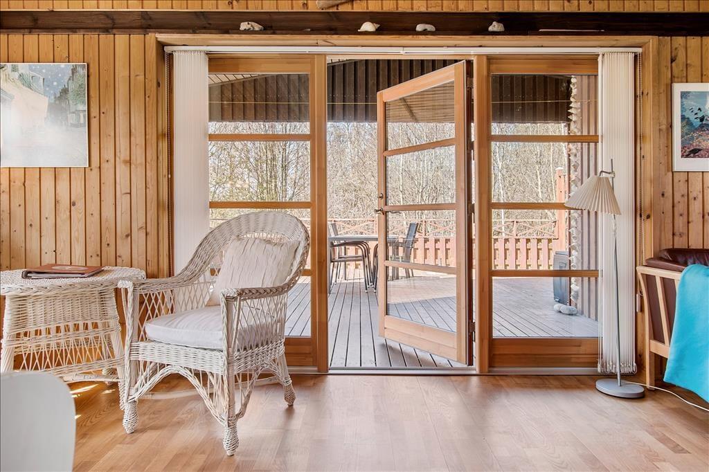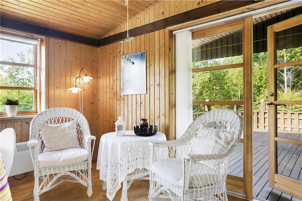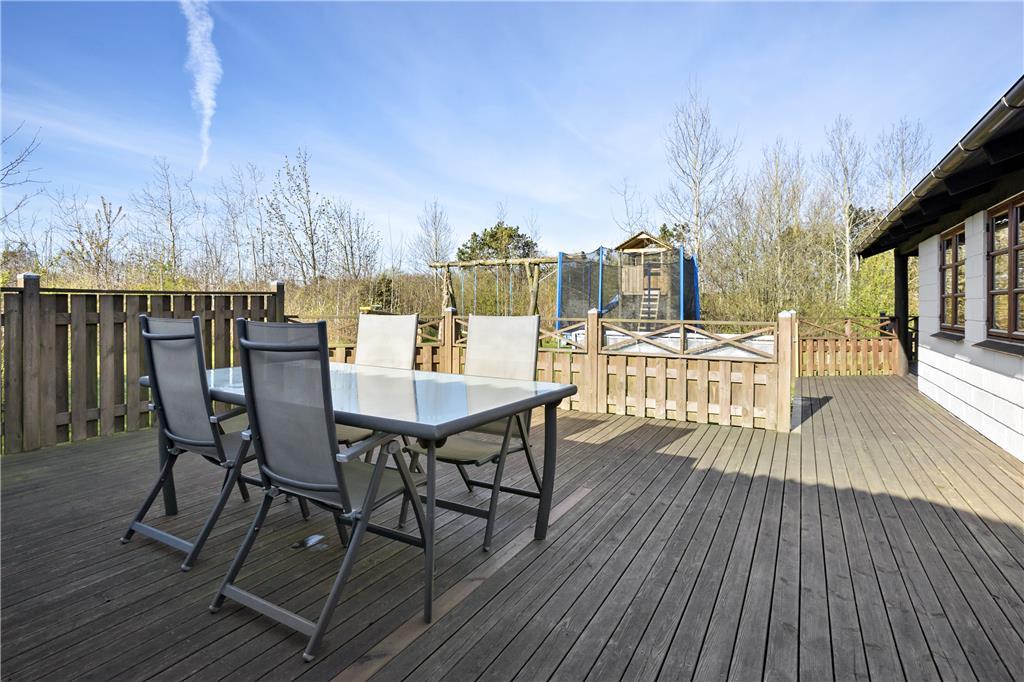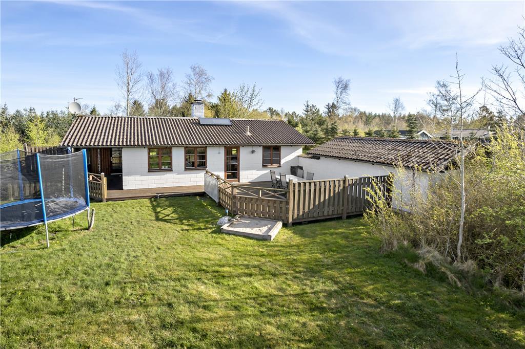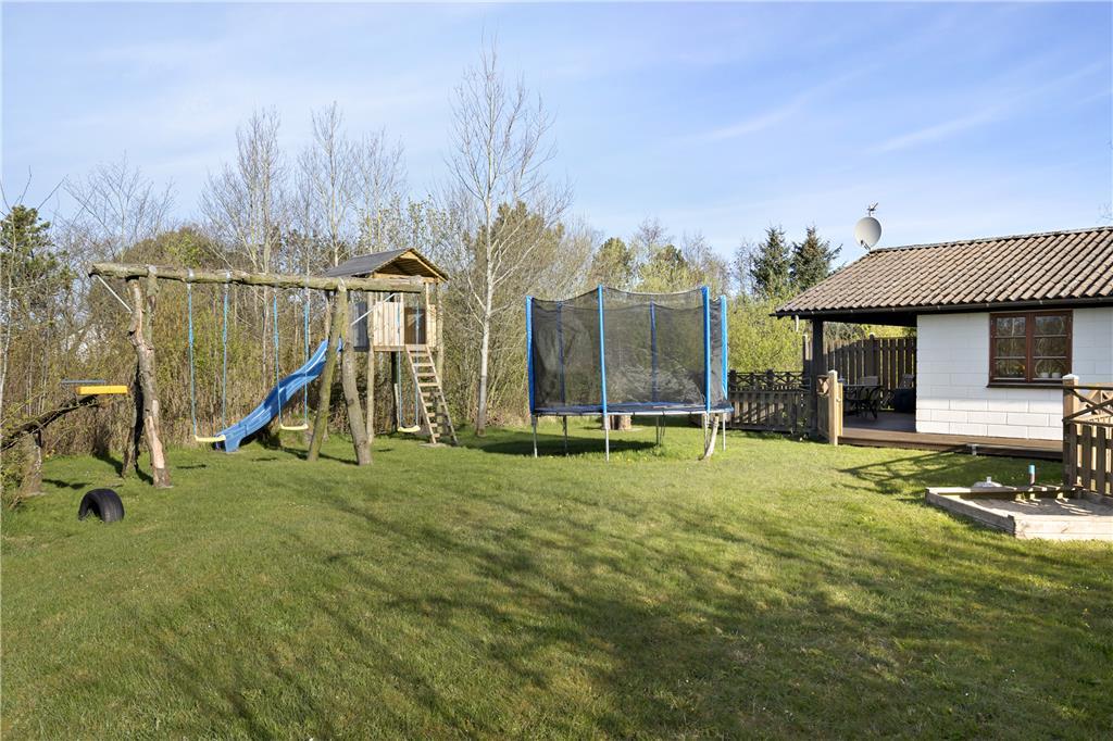 Grunden er stor og består af en plæne, som egner sig godt til leg og boldspil. Det er nemt at følge med i børnenes aktiviteter fra huset, og her er også plads til husdyr, der kan færdes frit. Rundt omkring på grunden findes små hjørner, hvor man kan sidde uforstyrret, og terrassen giver mulighed for at grille og spise udendørs. Den fredelige placering gør det oplagt at koble af og nyde naturen.
