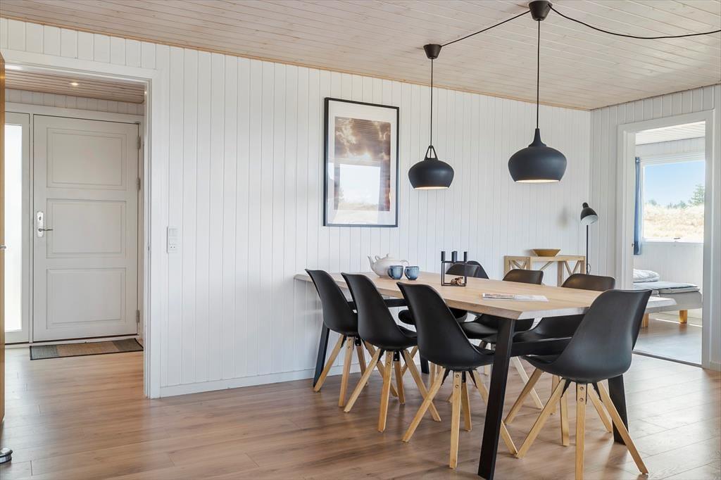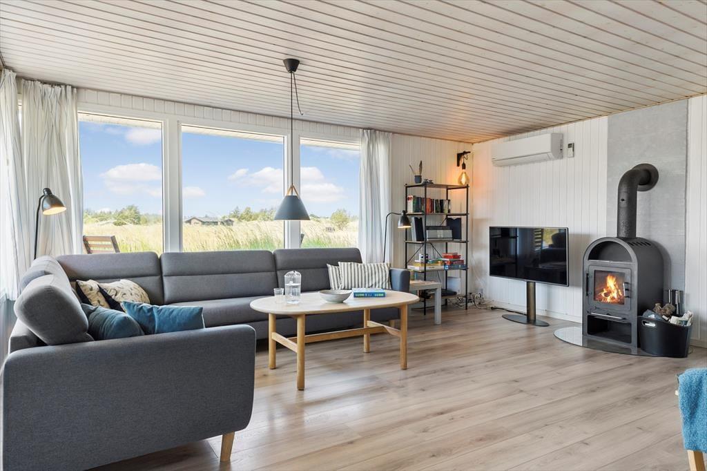 Når du træder indenfor, møder du en lys og indbydende stemning, der straks får dig til at føle dig hjemme. Sommerhusets åbne opholdsrum med loft til kip skaber en rummelig og hyggelig atmosfære, perfekt til både samvær og afslapning. Den centrale stue har en brændeovn, der spreder varme og hygge, mens det åbne køkken gør det nemt at være sammen, selv når maden forberedes. Soveværelserne er komfortabelt indrettet, og de store vinduespartier lader lyset strømme ind og bringer naturen tæt på.