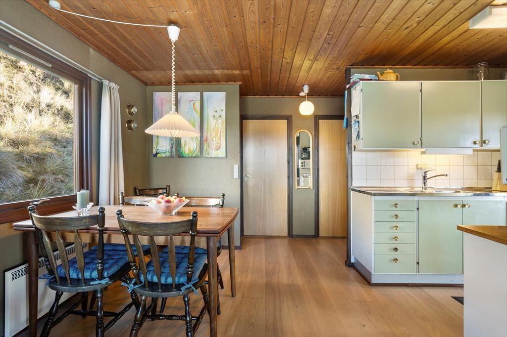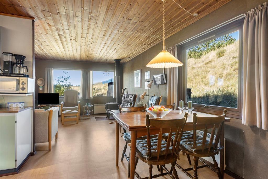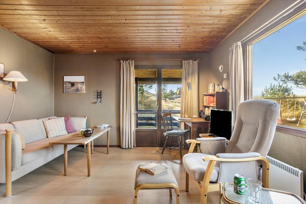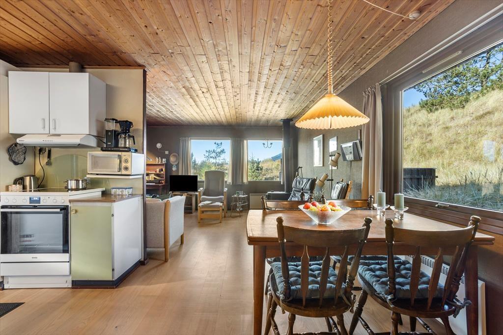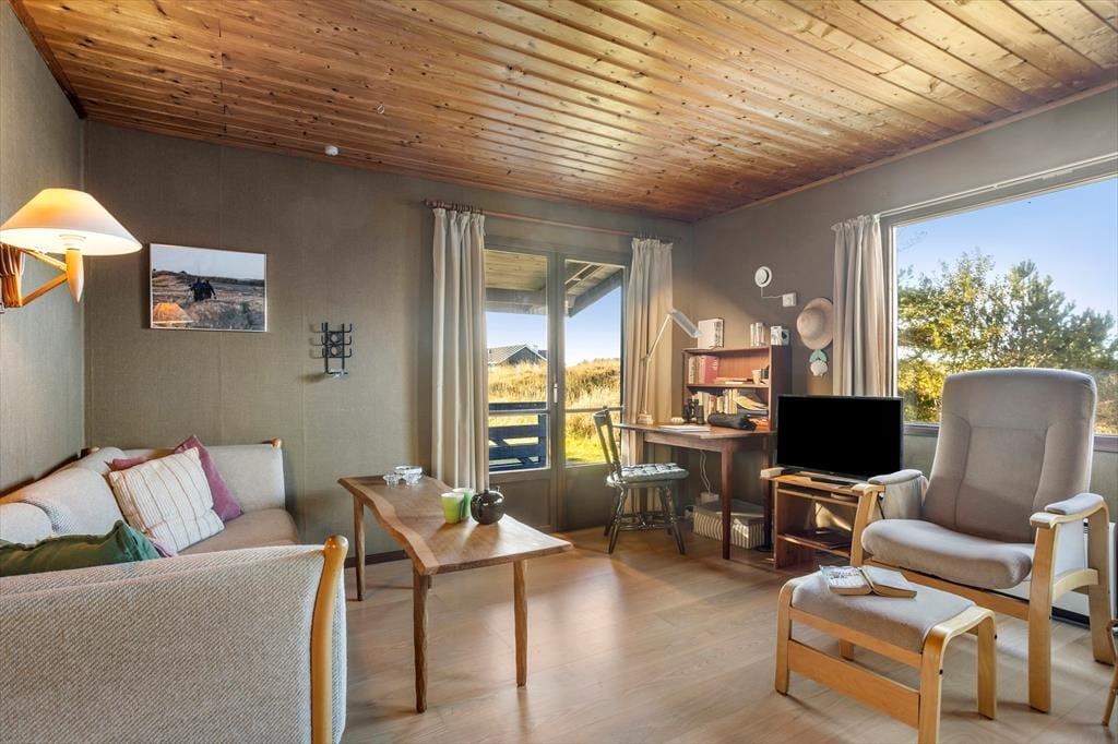 Sommerhuset byder dig velkommen med en lys og indbydende indretning, der straks får dig til at føle dig hjemme. Det åbne opholdsrum skaber en hyggelig atmosfære, hvor familien kan samles om både måltider og afslapning. Stuen har store vinduespartier, der giver et flot lysindfald og en dejlig udsigt til den omkringliggende natur. De komfortable soveværelser giver mulighed for en god nats søvn, og køkkenet er indrettet, så du let kan trylle lækre måltider frem til dig selv og dine nærmeste.