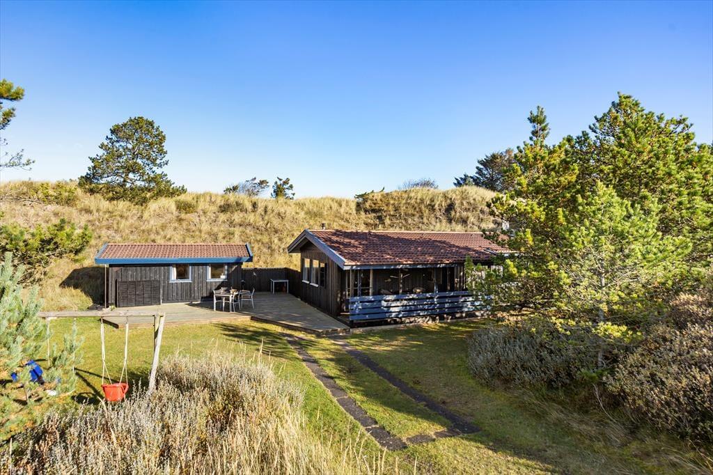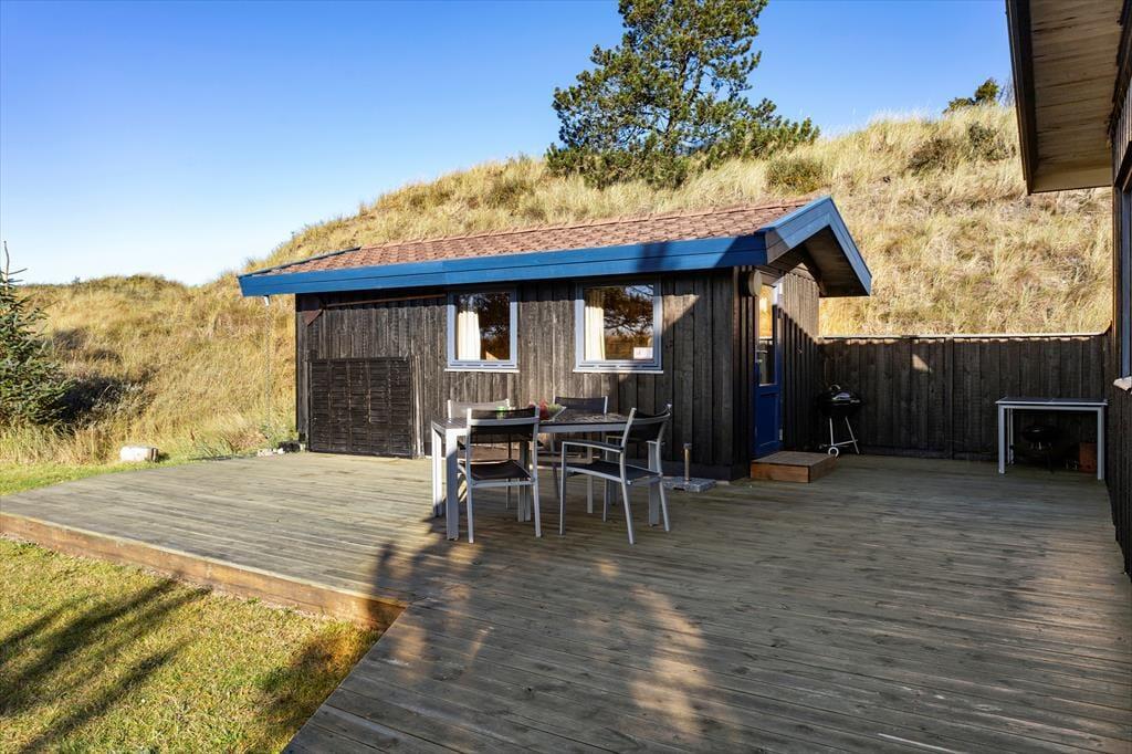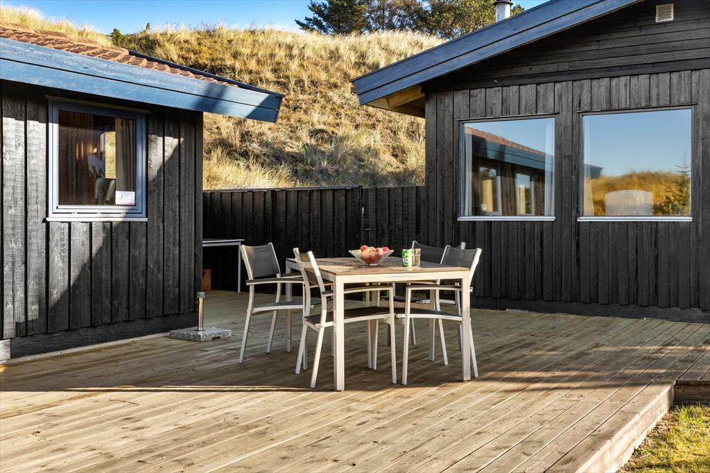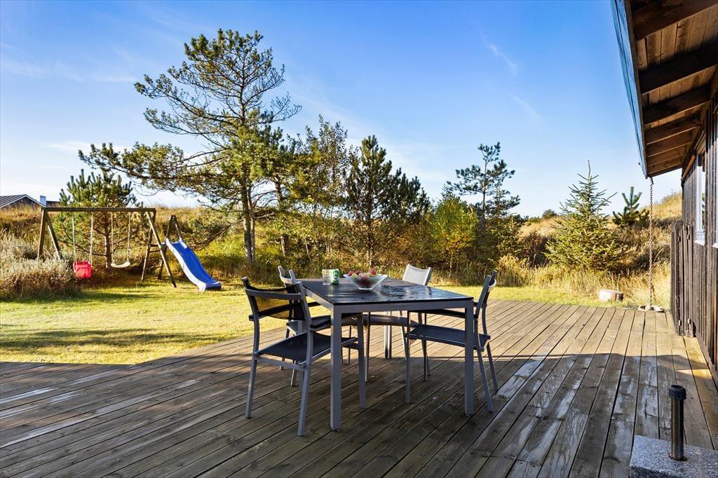 Huset ligger på en skøn naturgrund, hvor en ugenert terrasse skaber rammerne om mange afslappende timer under åben himmel. Her kan du nyde morgenkaffen i ro og mag, grille aftensmaden eller lade børnene lege frit på grunden. Fuglesangen og den friske luft fra Vesterhavet sætter prikken over i’et på din ferie. Hvis du ønsker mere aktivitet, kan du udforske de nærliggende stier og områder i Tversted Klitplantage.