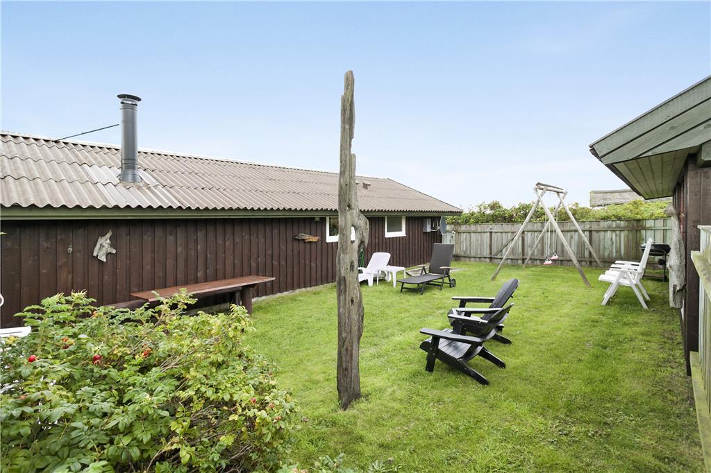 Udenfor venter et skønt terrassemiljø med en aflukket solgård, hvor du kan nyde dagens måltider, solens varme stråler og den friske havluft i fuldstændig private omgivelser. Terrassen er perfekt udstyret med havemøbler og en grill, der indbyder til lange sommeraftener med lækker mad og hygge under den åbne himmel. Huset ligger på en stor naturgrund, hvor du både kan finde plads til leg og afslapning. Panoramaudsigten til Vesterhavet er et syn, du aldrig bliver træt af – især når solen går ned i horisonten og maler himlen i de smukkeste farver.