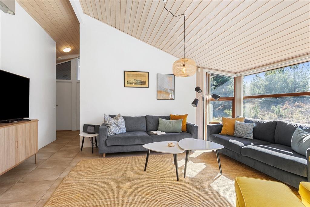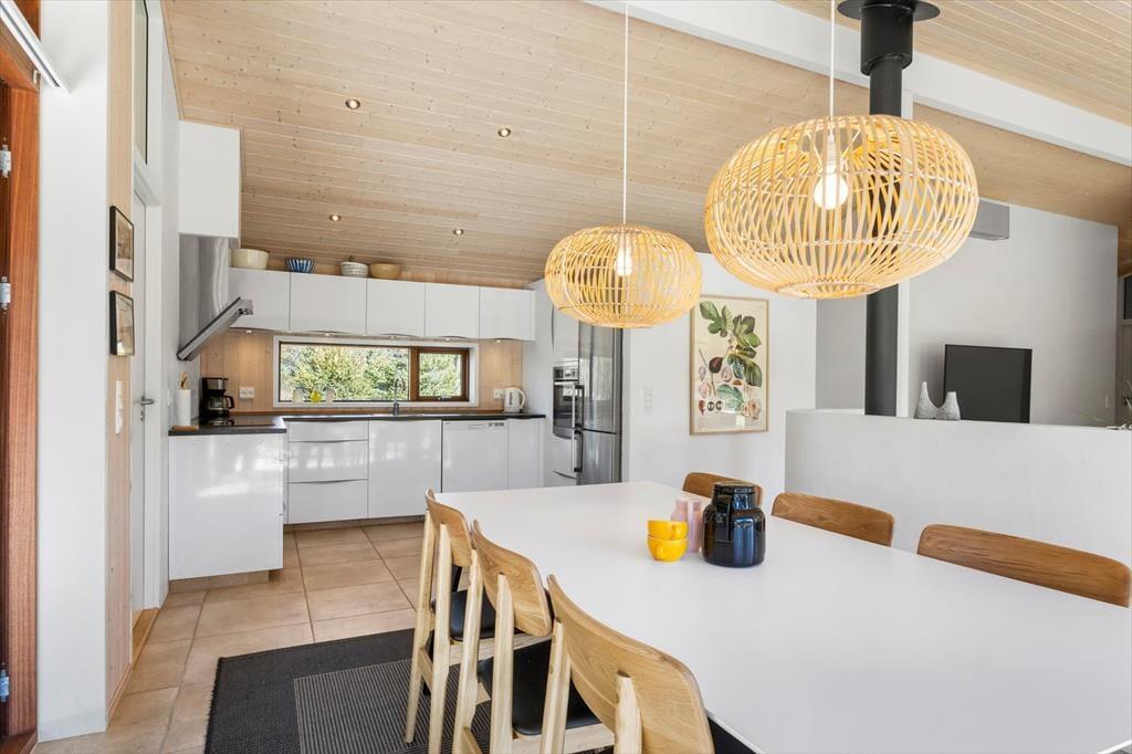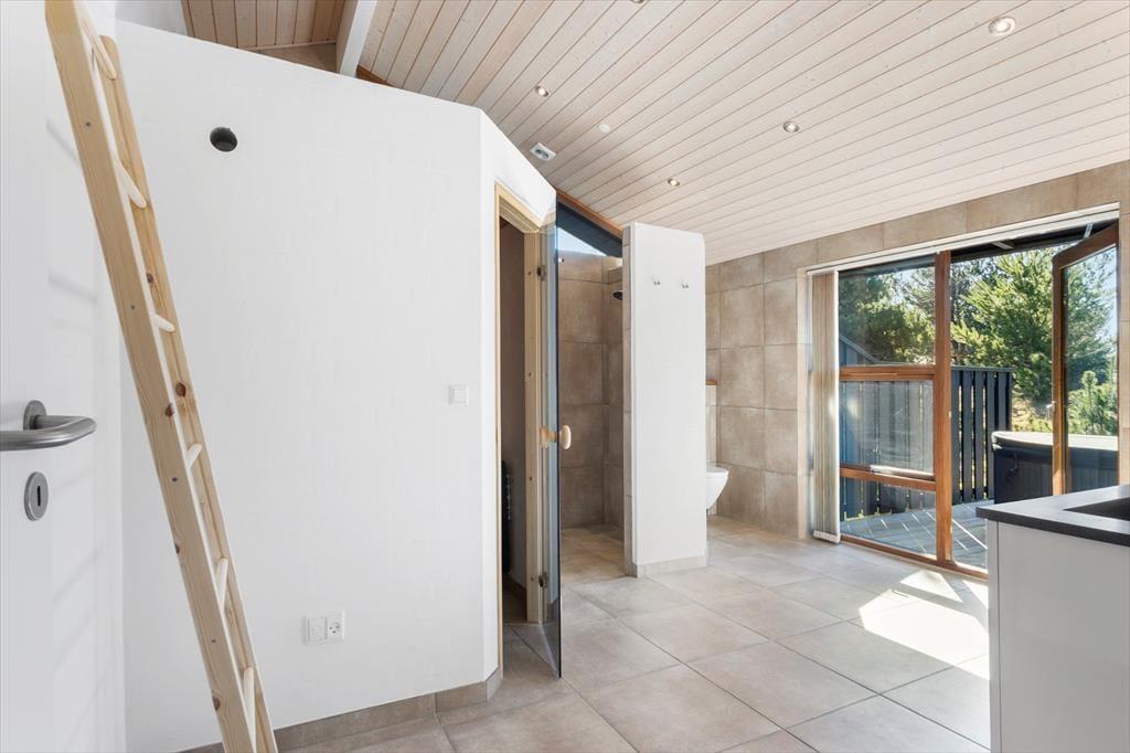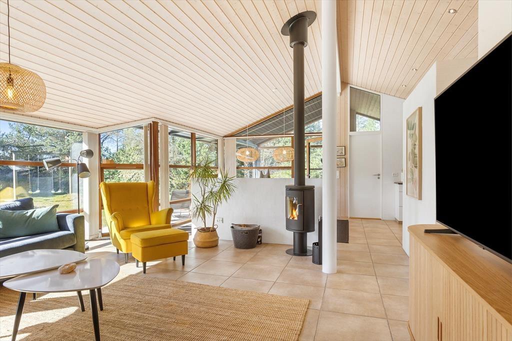 Fra det øjeblik du træder ind i sommerhuset, vil du mærke den behagelige atmosfære. Loft til kip og store vinduer giver rummet en luftig og lys stemning, så du kan lade dagslyset strømme ind, mens du nyder din morgenkaffe ved spisebordet. Stuen indbyder til hyggelige aftener foran brændeovnen, hvor flammerne knitrer og skaber den perfekte feriestemning. Med en åben forbindelse til køkkenet er det let at være sammen, uanset om nogen er i gang med at lave aftensmad, mens andre slænger sig i sofaen. Sommerhuset rummer to badeværelser, hvilket giver ekstra komfort, og hvis du trænger til at forkæle dig selv, kan du tage en tur i saunaen og lade varmen løse op for hverdagens spændinger.