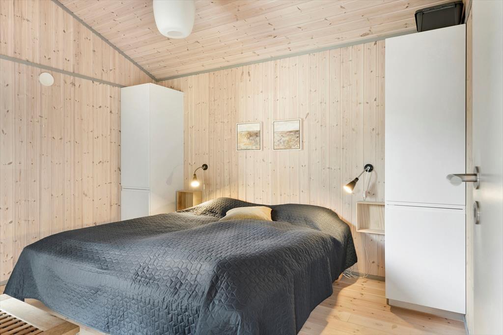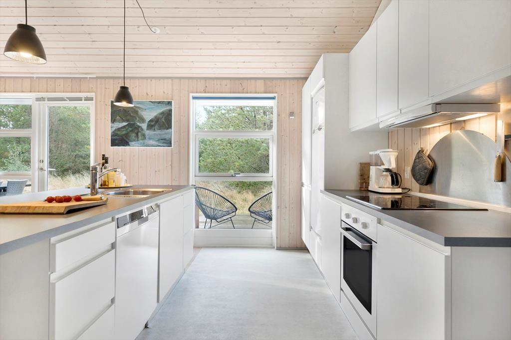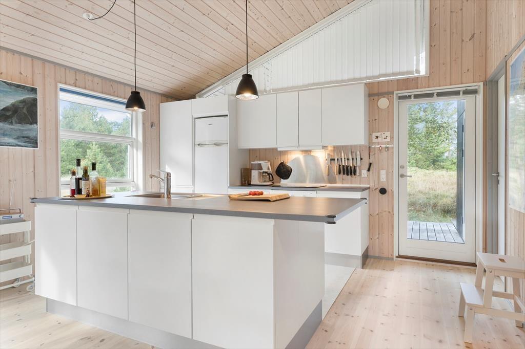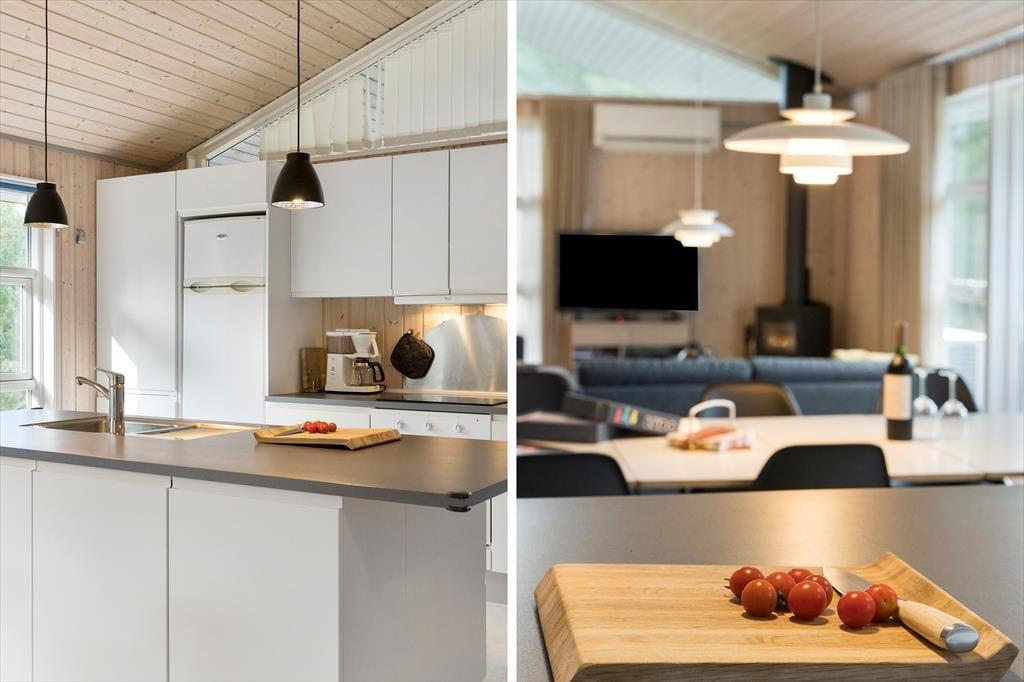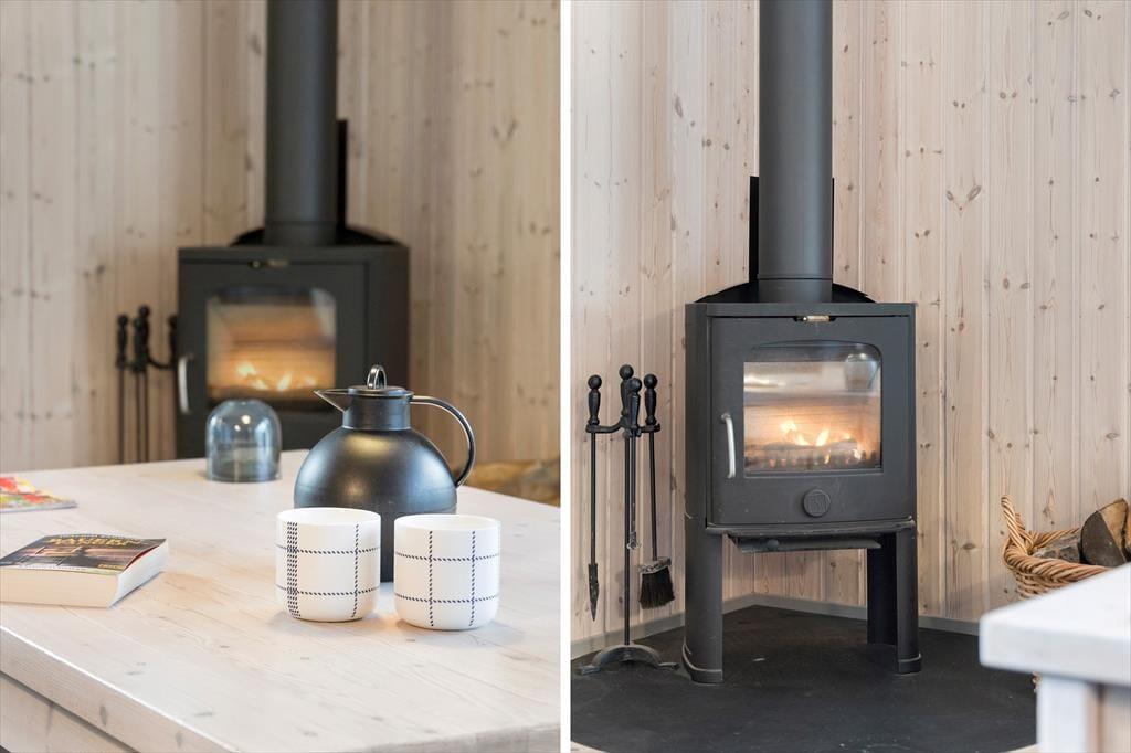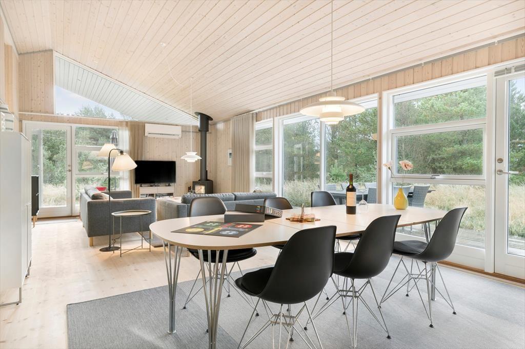 Når du træder indenfor, bliver du mødt af en lys og nordisk indretning, hvor det enkle og stilrene design skaber en afslappende atmosfære. Det åbne opholdsrum forener stue og køkken, hvilket gør det nemt at være sammen om dagens aktiviteter – uanset om I laver mad, spiller spil eller blot nyder en stille stund foran brændeovnen. Stuen indbyder til hyggelige aftener med levende flammer i ovnen, mens dagslyset strømmer ind gennem de store vinduer. Her er plads til både samvær og fordybelse, og den rolige farvepalet og de naturlige materialer understreger den harmoniske stemning.