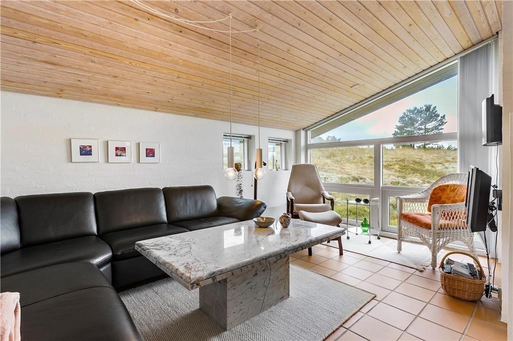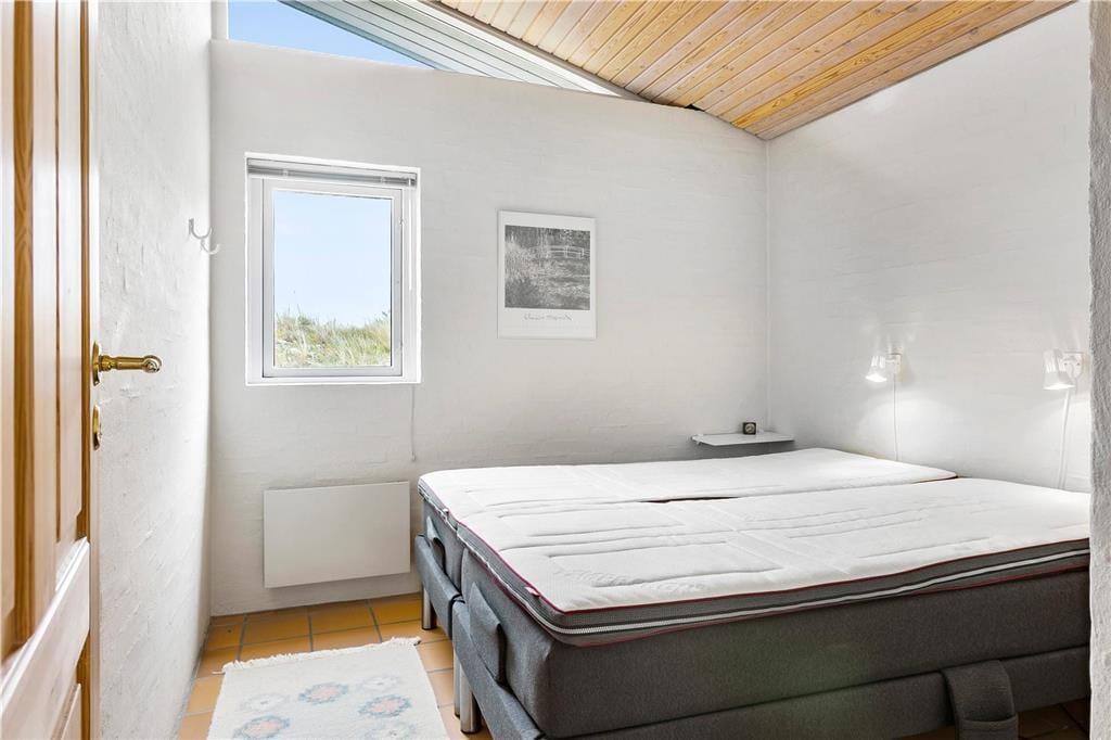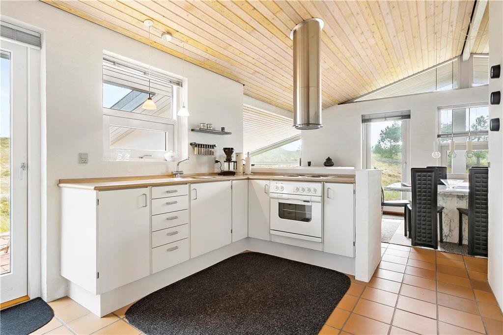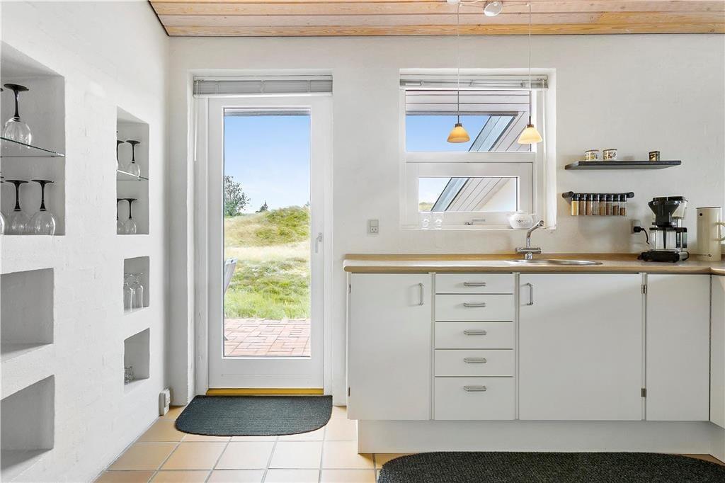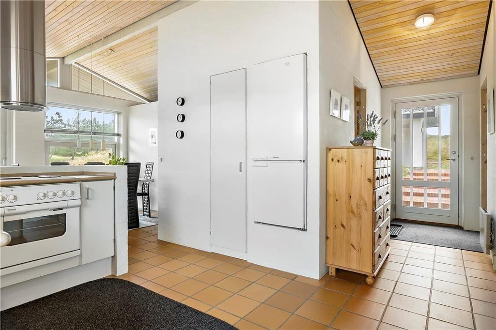 Når du træder indenfor i dette hyggelige sommerhus, bliver du mødt af et åbent og lyst køkken-alrum, der skaber den perfekte ramme for samvær og hygge. Store vinduer sikrer masser af naturligt lys, og den åbne planløsning gør, at både køkken og stue føles rummelige og indbydende. Her kan du slappe af med en god bog foran brændeovnen, som spreder varme og stemning på de køligere dage. Huset har også en sauna, så du kan forkæle dig selv med afslapning efter en lang gåtur i det smukke klitlandskab. De smukke flisebelagte terrasseområder er lige udenfor døren, så du nemt kan træde ud og nyde den friske luft, når du har lyst.