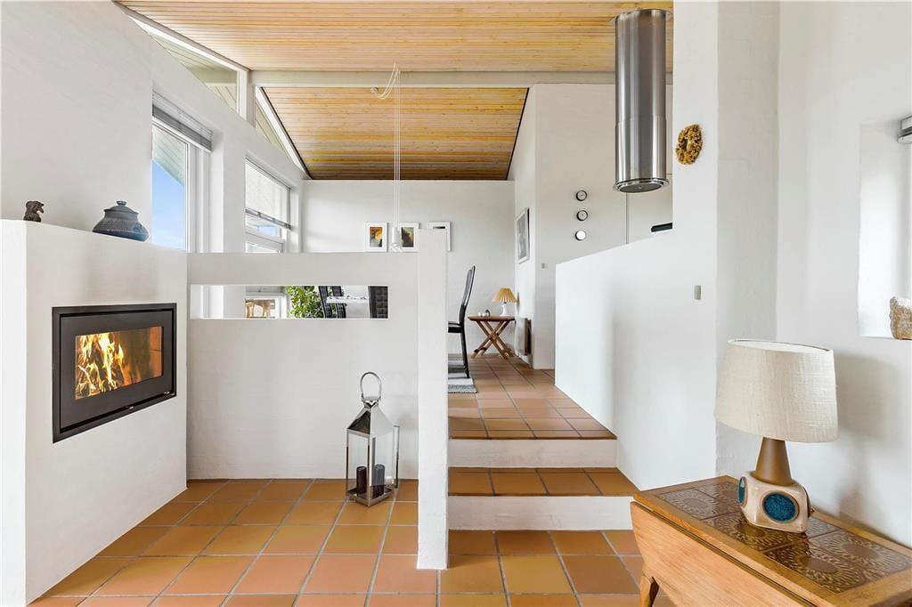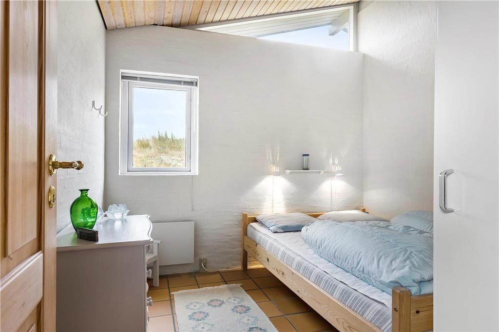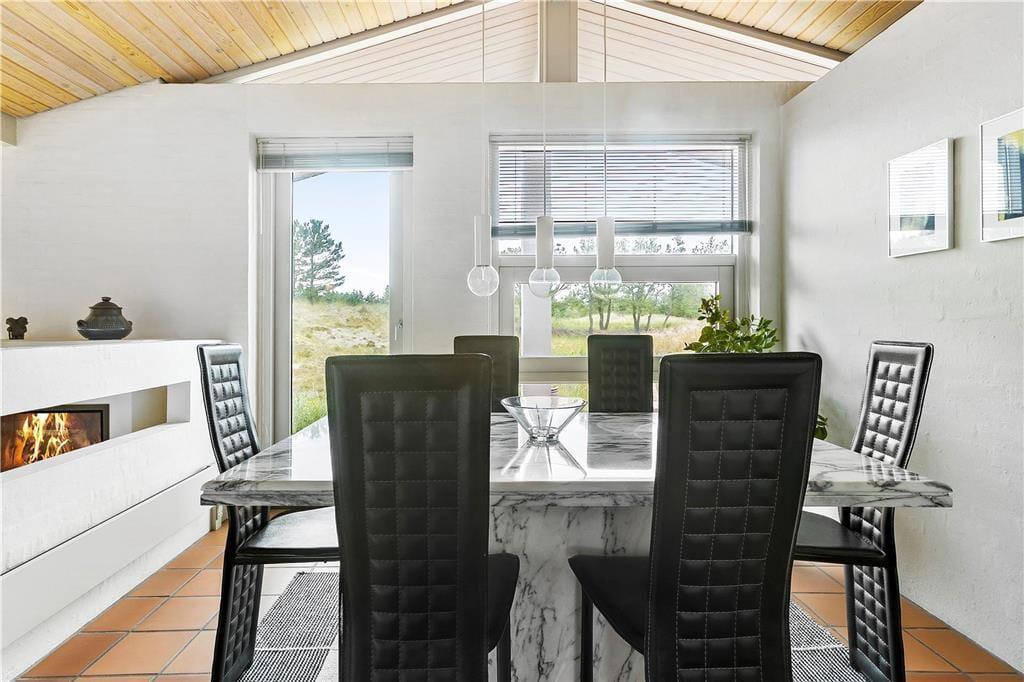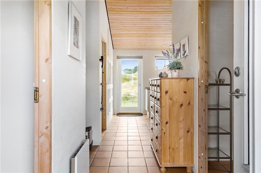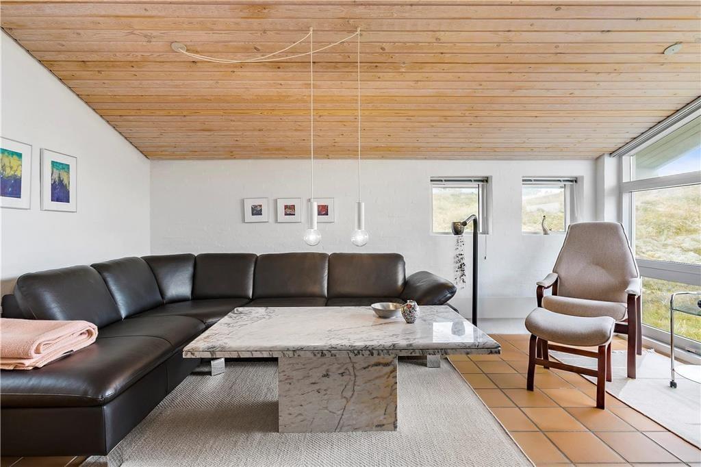 Når du træder indenfor i dette hyggelige sommerhus, bliver du mødt af et åbent og lyst køkken-alrum, der skaber den perfekte ramme for samvær og hygge. Store vinduer sikrer masser af naturligt lys, og den åbne planløsning gør, at både køkken og stue føles rummelige og indbydende. Her kan du slappe af med en god bog foran brændeovnen, som spreder varme og stemning på de køligere dage. Huset har også en sauna, så du kan forkæle dig selv med afslapning efter en lang gåtur i det smukke klitlandskab. De smukke flisebelagte terrasseområder er lige udenfor døren, så du nemt kan træde ud og nyde den friske luft, når du har lyst.
