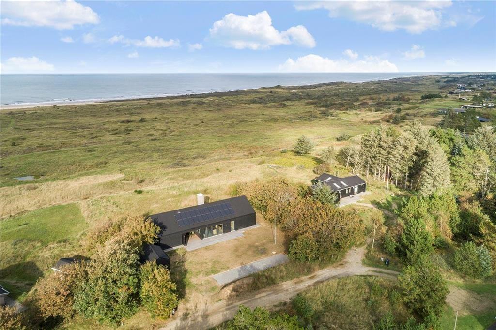 Ikke mange steder har man så skøn en udsigt over bakkede klitter og hele vejen til det store Vesterhav som her. Den kuperede naturgrund ligger lidt højt, og har et charmerende miks af højt græs, marehalm, buske og træer og er udlagt som ”Natura 2000” område. Sommerhuset har terrasse hele vejen rundt hvoraf den ene del er overdækket og kan lukkes af med store jalousiporte. Her er godt at samles til måltider eller aftenhygge når solen går ned mod vest. Foretrækker i at tilberede maden udenfor, er der også udekøkken med kogeplade og gasgrill. Terrasseområderne har desuden udepejs og udebruser, og ude på grunden er der anlagt petanque bane, hvor der kan spilles hvis lysten skulle melde sig. Det skønne udespa indbyder til lange hyggelige aftener med en kold drink i det varme vand.
