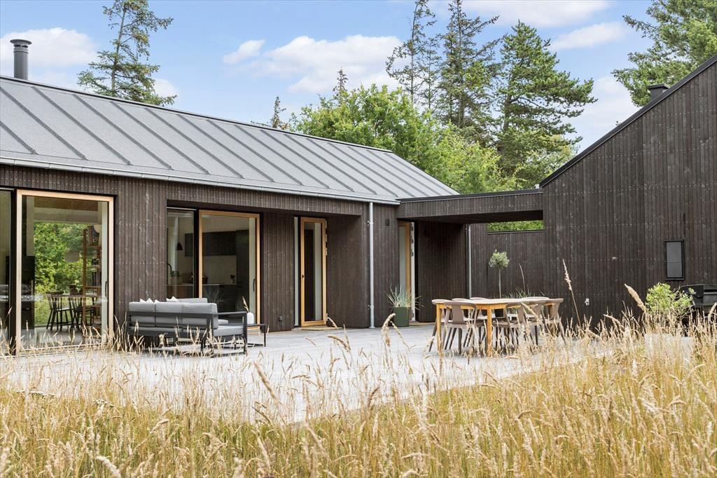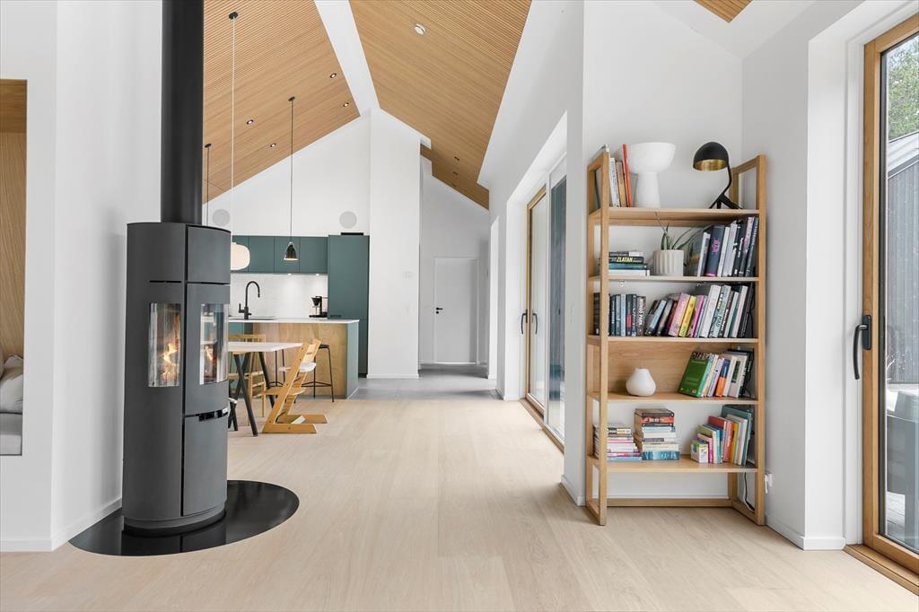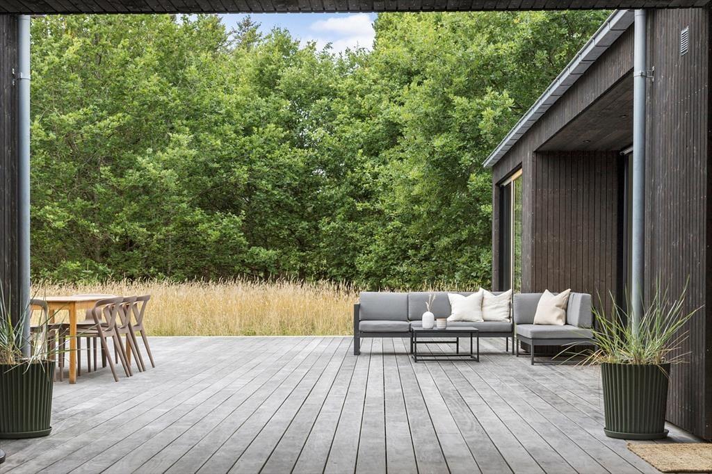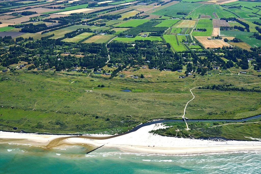 Udenfor venter en stor naturgrund, som skaber et dejligt privat rum, hvor du kan slappe af og nyde roen. Den delvist overdækkede terrasse er ideel til at spise udendørs, nyde morgenkaffen eller slappe af med en god bog i solskinnet. For de mere aktive er der masser af plads på græsplænen, og de naturskønne omgivelser indbyder til en tur langs stierne i området. Den store naturgrund skaber en følelse af frihed og fred, og det er lige så nemt at finde sig en stille plet som at samles og hygge sig sammen i haven. Det er let at lade sig friste til en tur til stranden, som ligger kun 500 meter fra døren, eller at bruge tid på at udforske den omkringliggende natur.