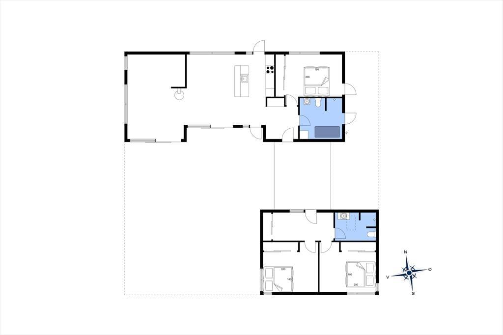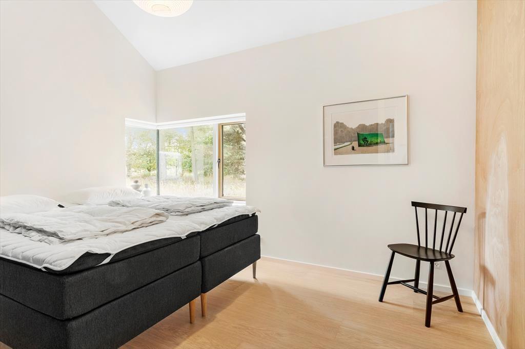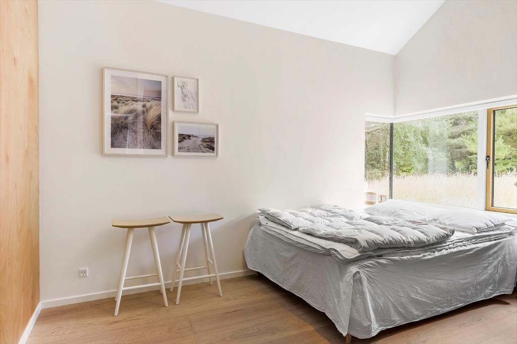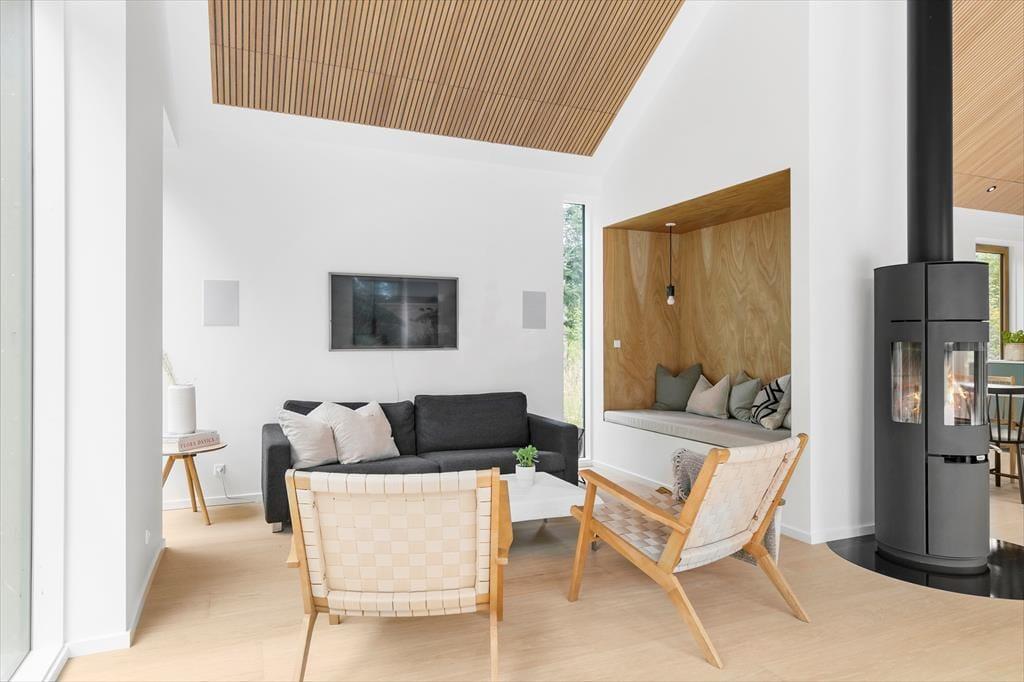 Som du træder indenfor i sommerhuset, bliver du mødt af en lys og moderne indretning. Køkkenet og alrummet står i åben forbindelse, hvilket skaber en rummelig og social atmosfære, perfekt til samvær med familie og venner. Det hyggelige køkkenområde gør det nemt at tilberede lækre måltider, som kan nydes omkring spisebordet, mens den varme brændeovn spreder hygge og varme på køligere aftener. Når det er tid til at slappe af, kan du kravle op i den lille alkove, som giver den perfekte, hyggelige plads til at læse en god bog eller tage en eftermiddagshvil. De to badeværelser giver ekstra komfort til både familier og grupper, og gør det nemt for alle at få en god start på dagen eller afslutte en dag fuld af oplevelser.
