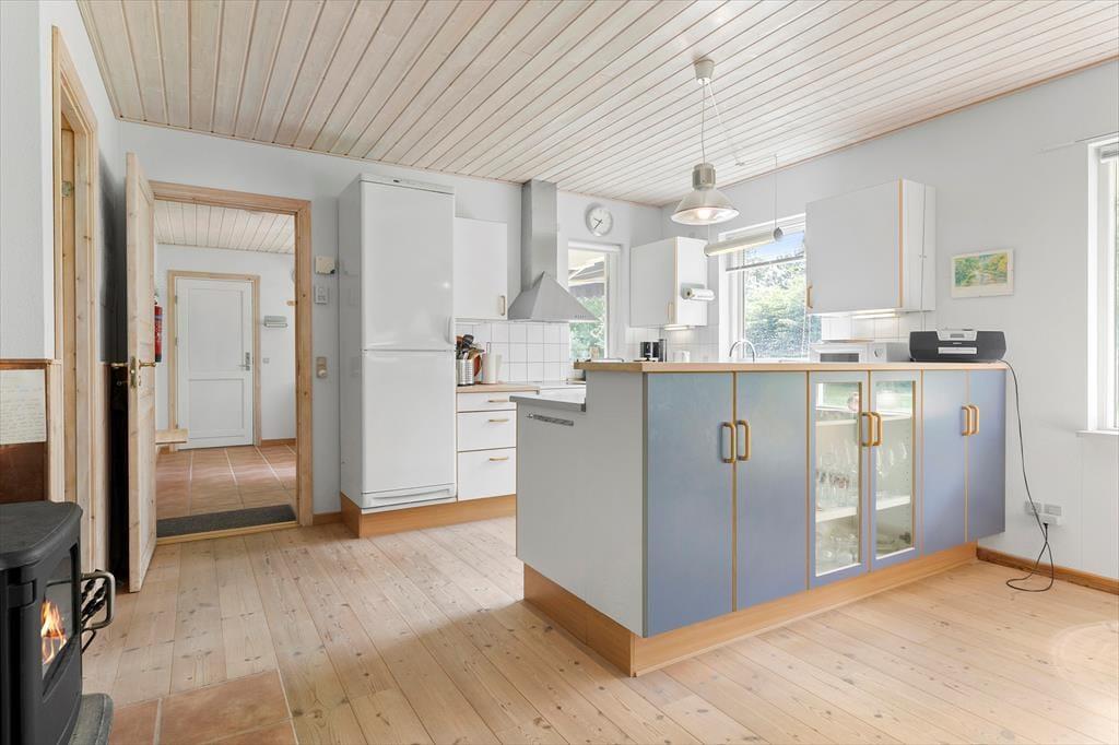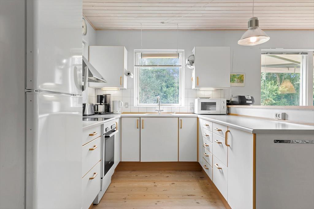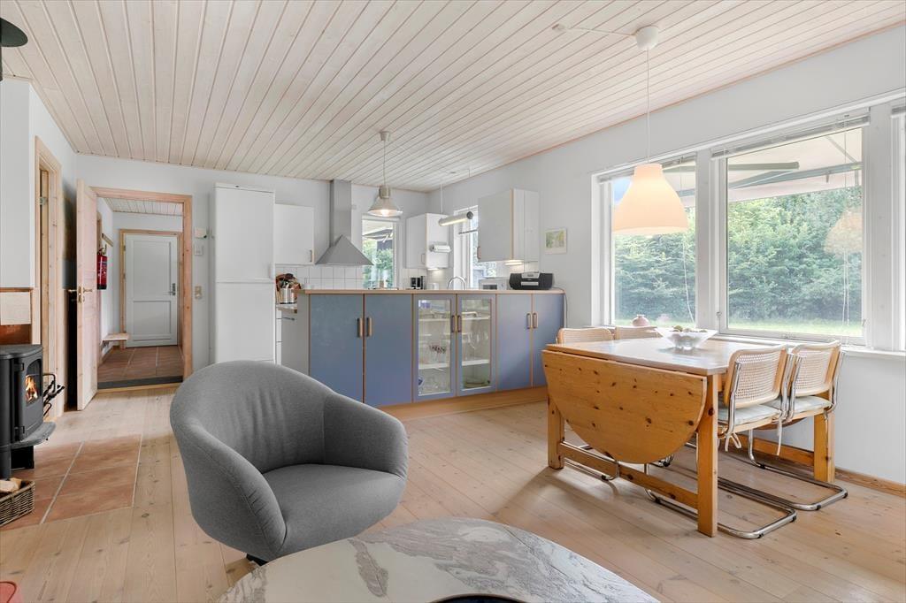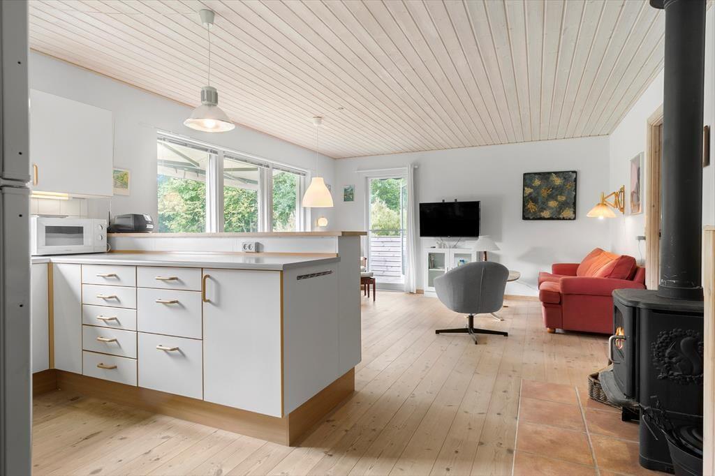 Når du træder ind i sommerhuset, mødes du af en lys og indbydende atmosfære, der giver dig følelsen af at være helt hjemme. De store vinduer i stuen lukker masser af naturligt lys ind og giver en flot udsigt til det idylliske naturområde udenfor. Den hyggelige brændeovn står klar til at sprede varme og hygge på de køligere aftener, og det åbne rum mellem stue og køkken gør det let at samles omkring et godt måltid eller en uforpligtende samtale. Sommerhuset er udformet med komfort i tankerne og tilbyder en god planløsning, som gør det let at føle sig tilpas og slappe af.