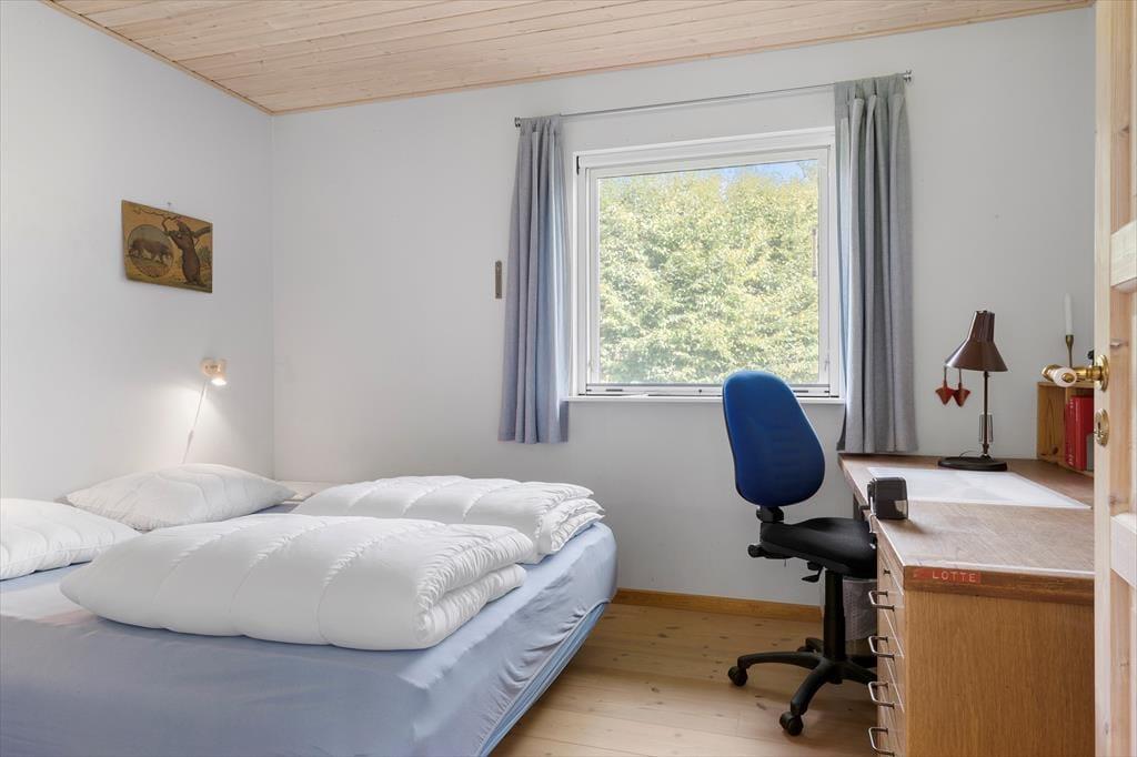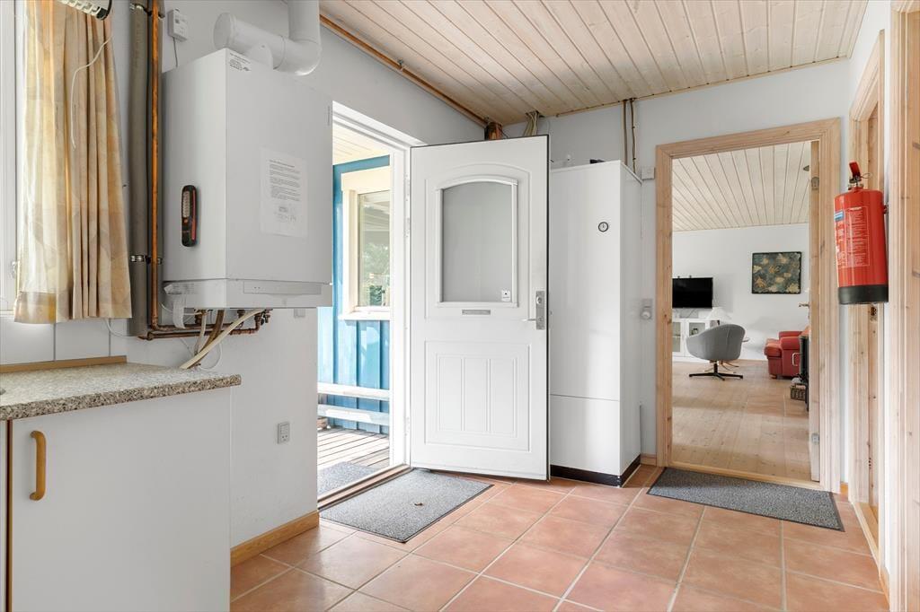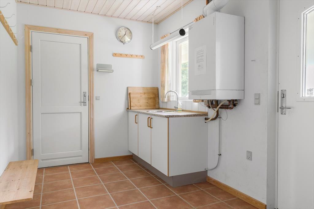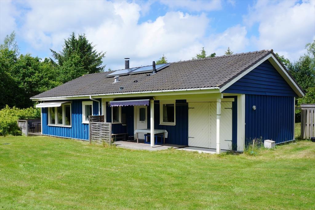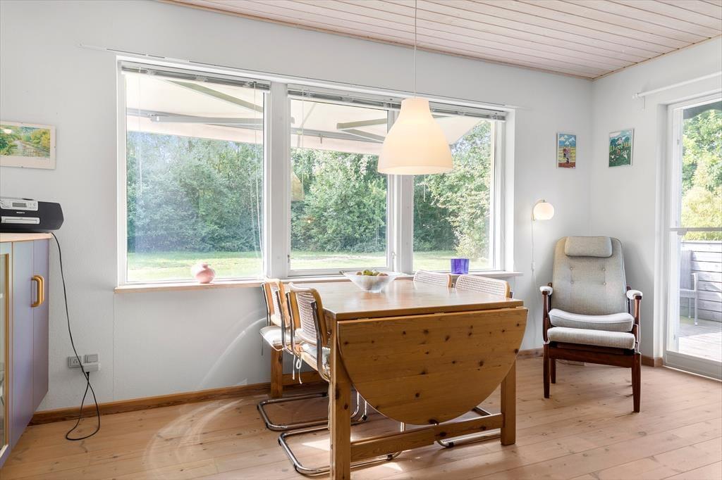 Når du træder ind i sommerhuset, mødes du af en lys og indbydende atmosfære, der giver dig følelsen af at være helt hjemme. De store vinduer i stuen lukker masser af naturligt lys ind og giver en flot udsigt til det idylliske naturområde udenfor. Den hyggelige brændeovn står klar til at sprede varme og hygge på de køligere aftener, og det åbne rum mellem stue og køkken gør det let at samles omkring et godt måltid eller en uforpligtende samtale. Sommerhuset er udformet med komfort i tankerne og tilbyder en god planløsning, som gør det let at føle sig tilpas og slappe af.